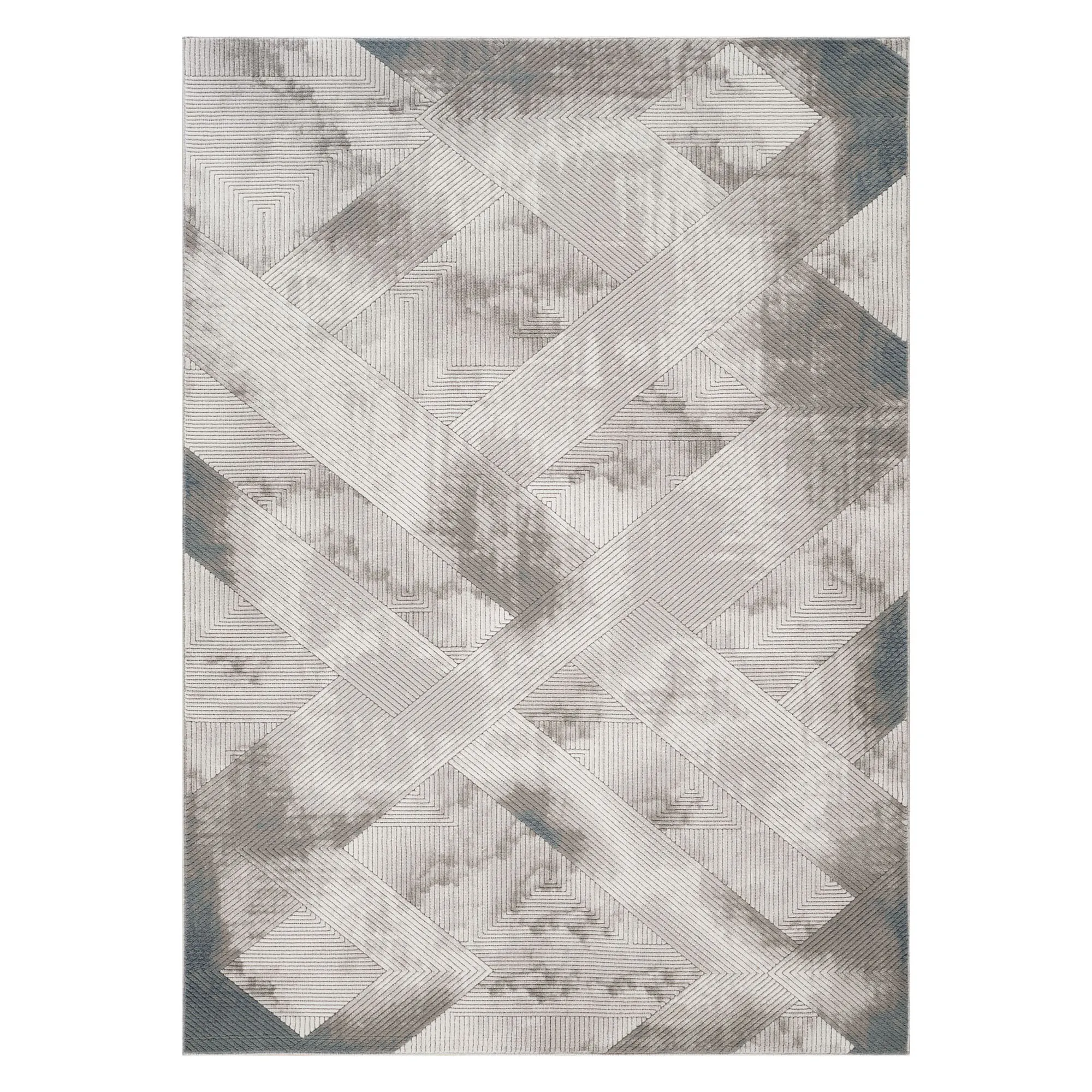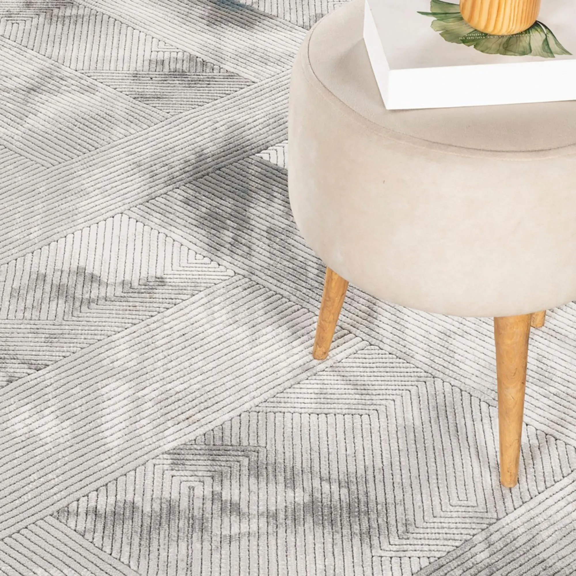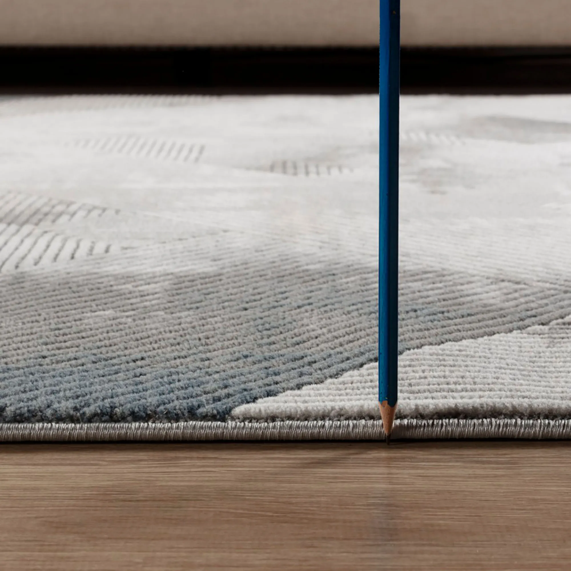 Thin stripes, carved designs, and geometric angles add an abstract aesthetic to the Nero Rug. Power-loomed polyester area rug, .43" thick, features hi-lo lattice, pencil stripe, zigzag, and basket weave patterns. Colors include shades of off-white, gray, ivory, dark blue, charcoal, and linen. Backing is jute. We recommend professional cleaning by a rug cleaner. Imported.