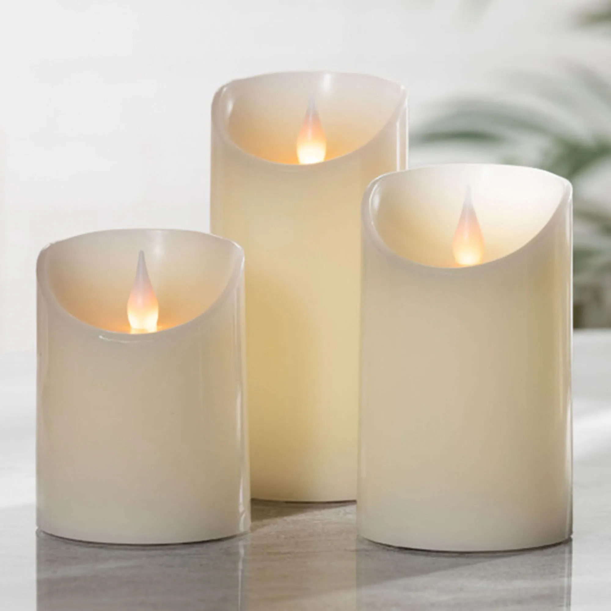A Forever Glow(TM) design from Everlasting Glow(R), the New Haven LED Candle Set flickers with a graceful charm. Crafted from real ivory wax, each 3" dia. candle features a curved top and a dimensional shaped wick for a realistic 360-degree design. Without the messy smoke and flame, the candles provide a flickering LED glow available from every angle. Each candle requires two of your AA batteries and operates from the bottom on/off/five-hour timer switch. Indoor use only. Small is 4"H; medium is 5"H; large is 6"H.