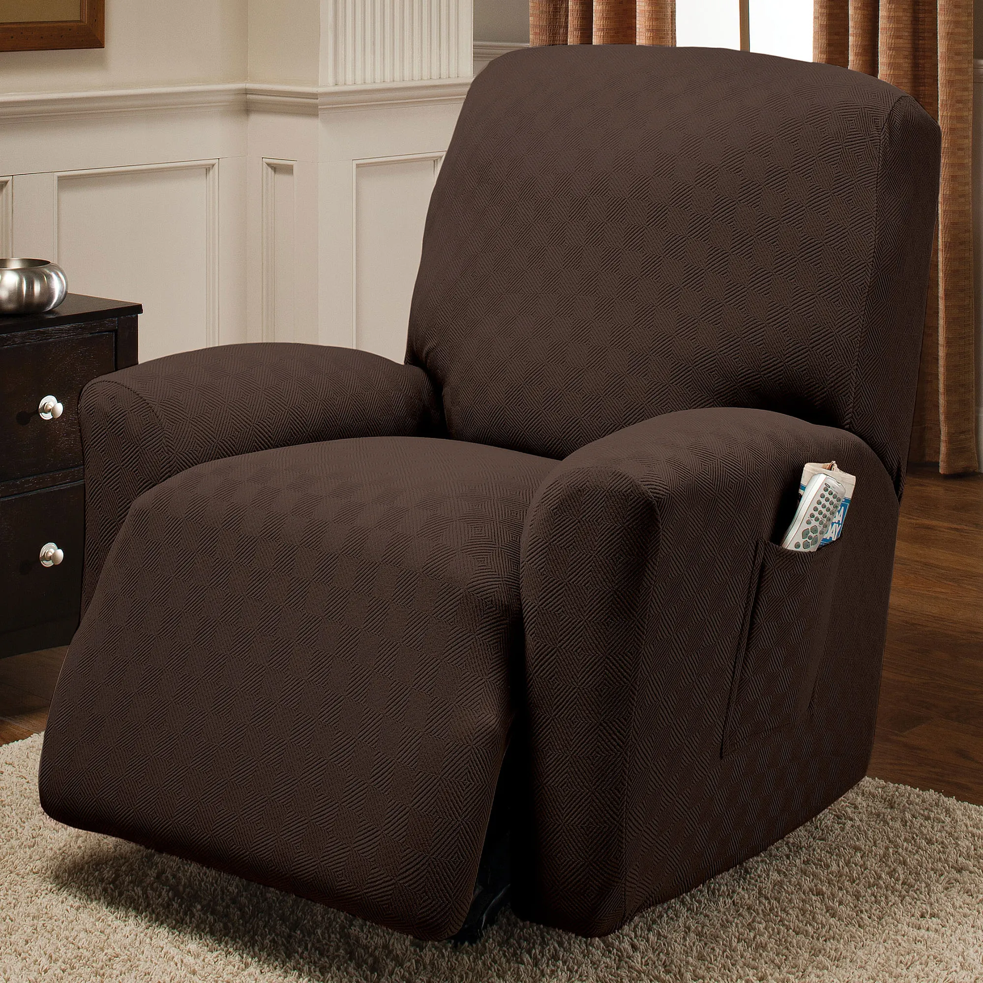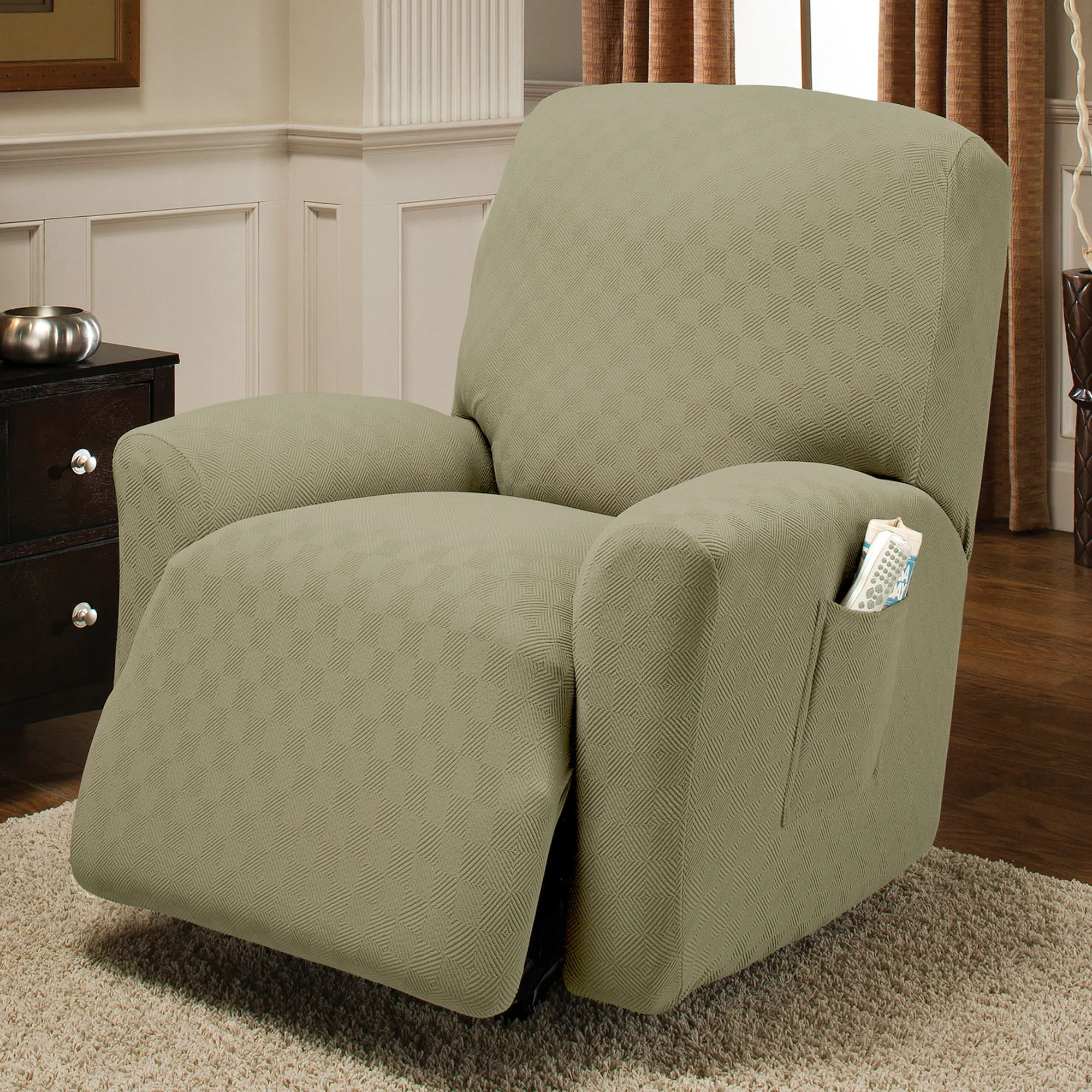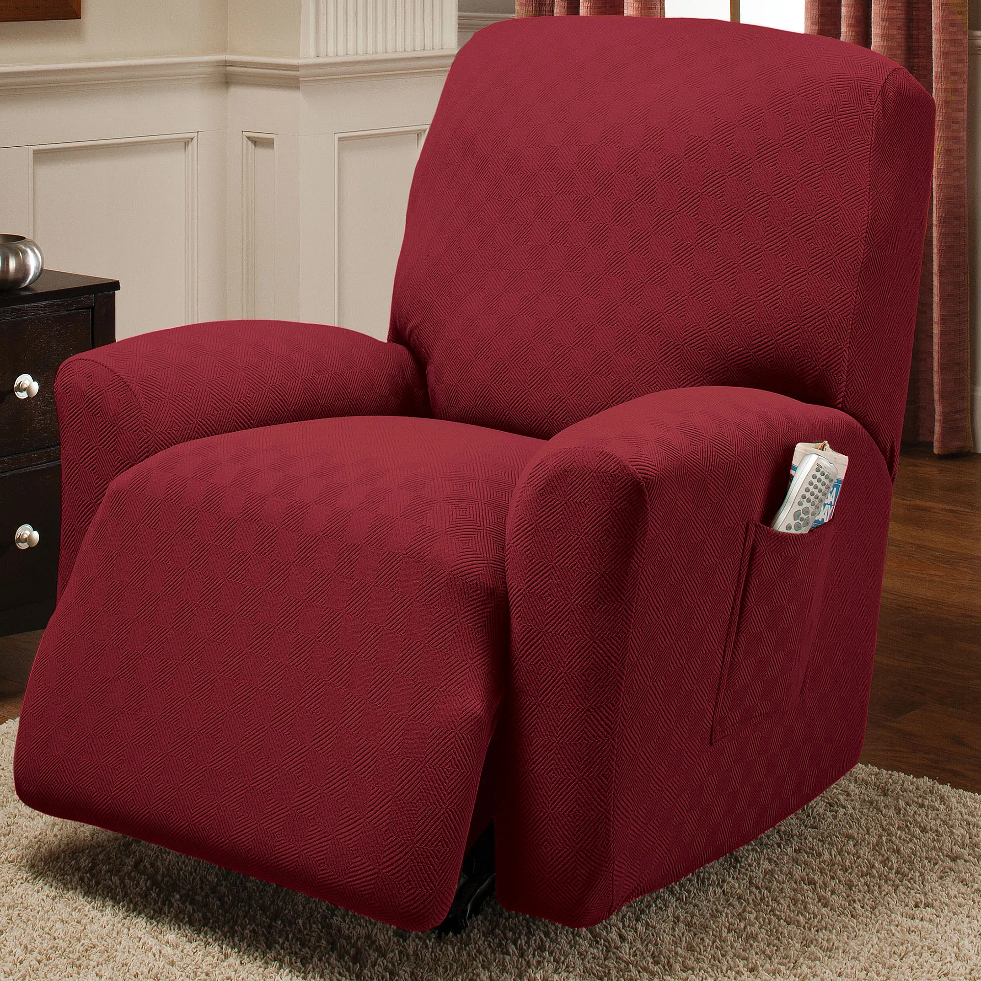 Recliner Slipcover is a four-piece slipcover (two arm covers, back cover, and front cover). A pocket on the side of the left arm cover and a cut-out hole for the recliner handle on the right arm cover add to the convenience.