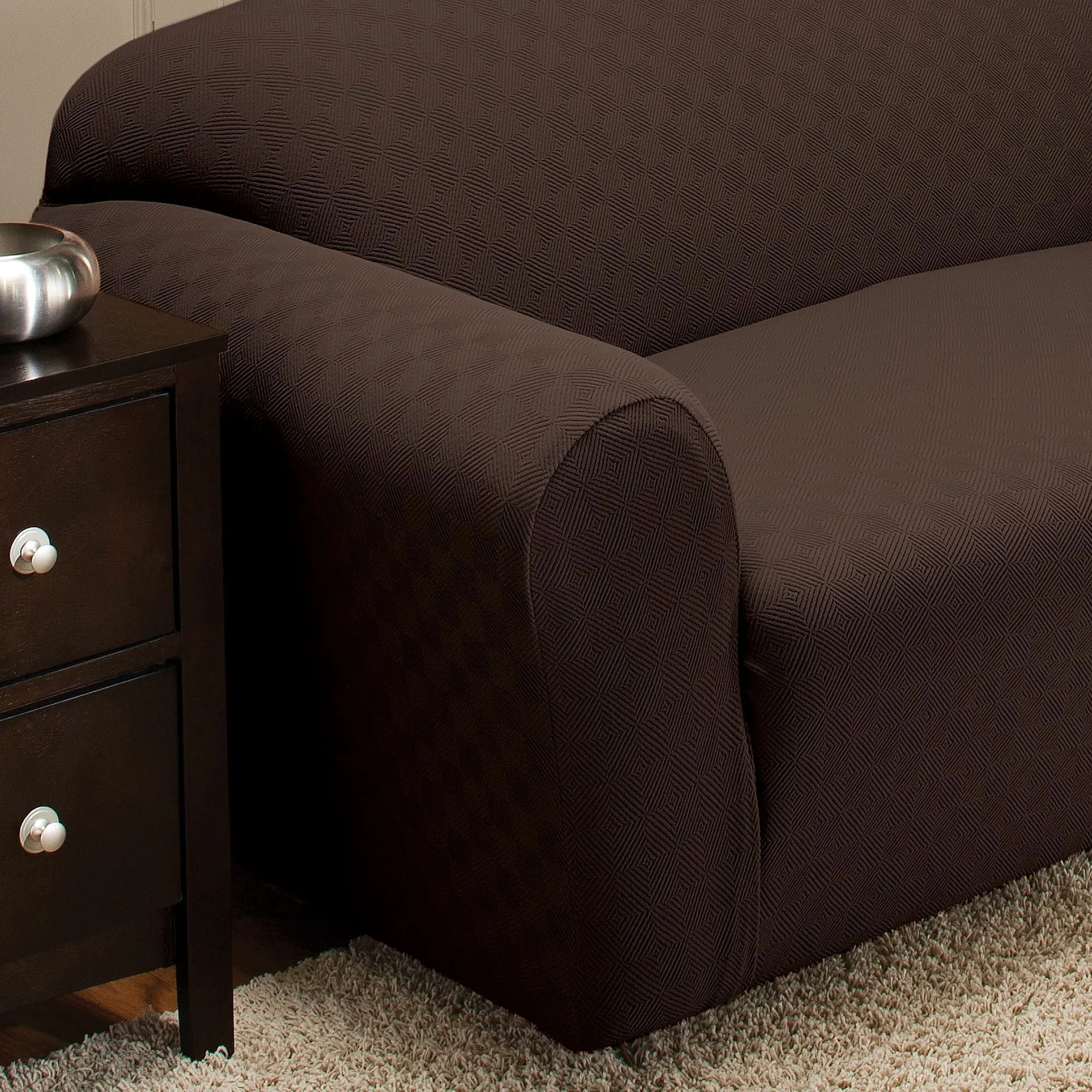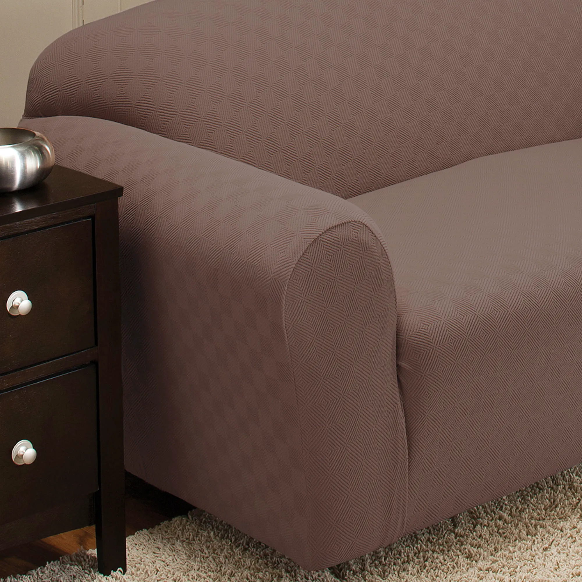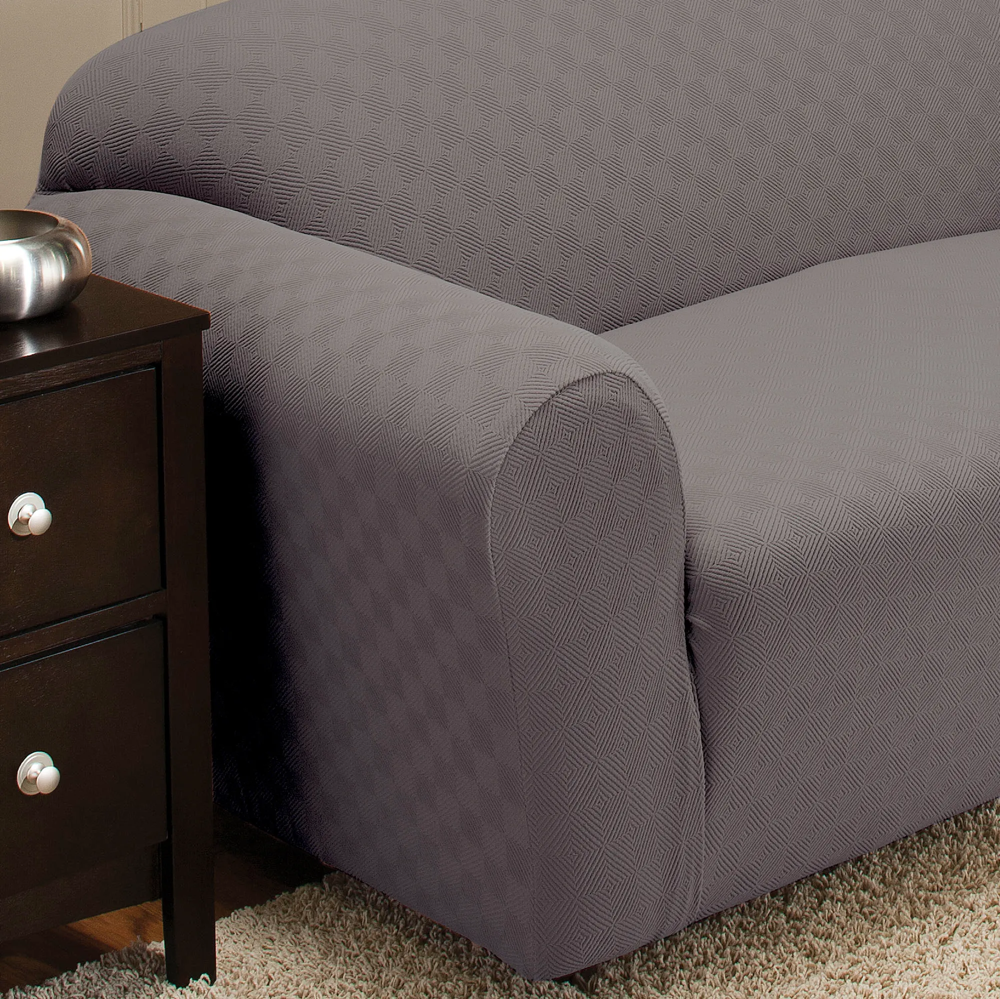 The Newport Sofa Slipcovers stretch over your furnishings, protecting them while adding a soft, intriguing design. Made of a polyester/spandex blend, each slipcover contains a raised block design. In addition to the Sofa Slipcover, the following styles are available: Recliner Slipcover, Jumbo Recliner Slipcover, Wing Chair Slipcover, or Loveseat Slipcover. Slipcovers cannot be used with all styles of furniture. Click on the Details tab for more information. Imported.