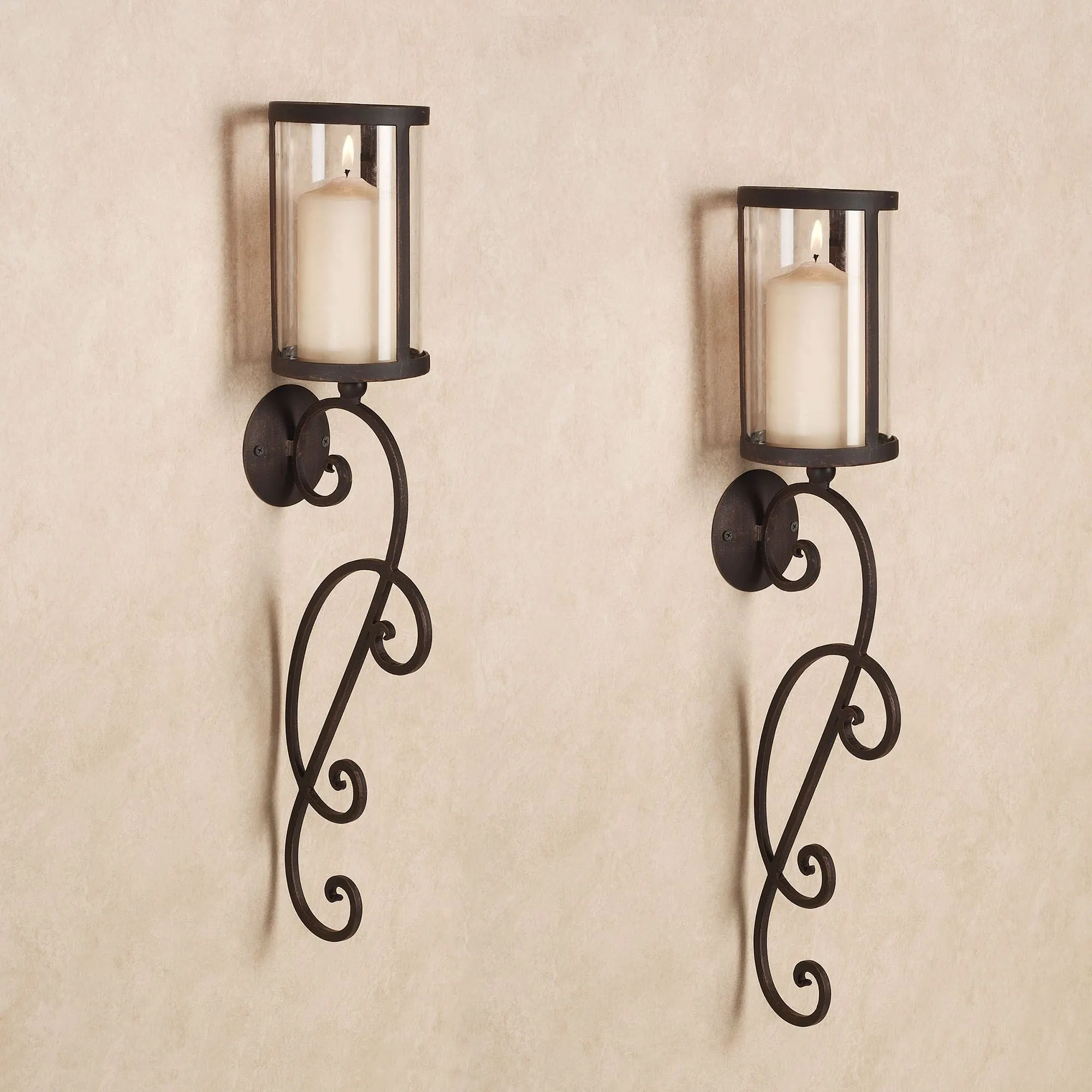 • Each metal wall sconce has a glass hurricane