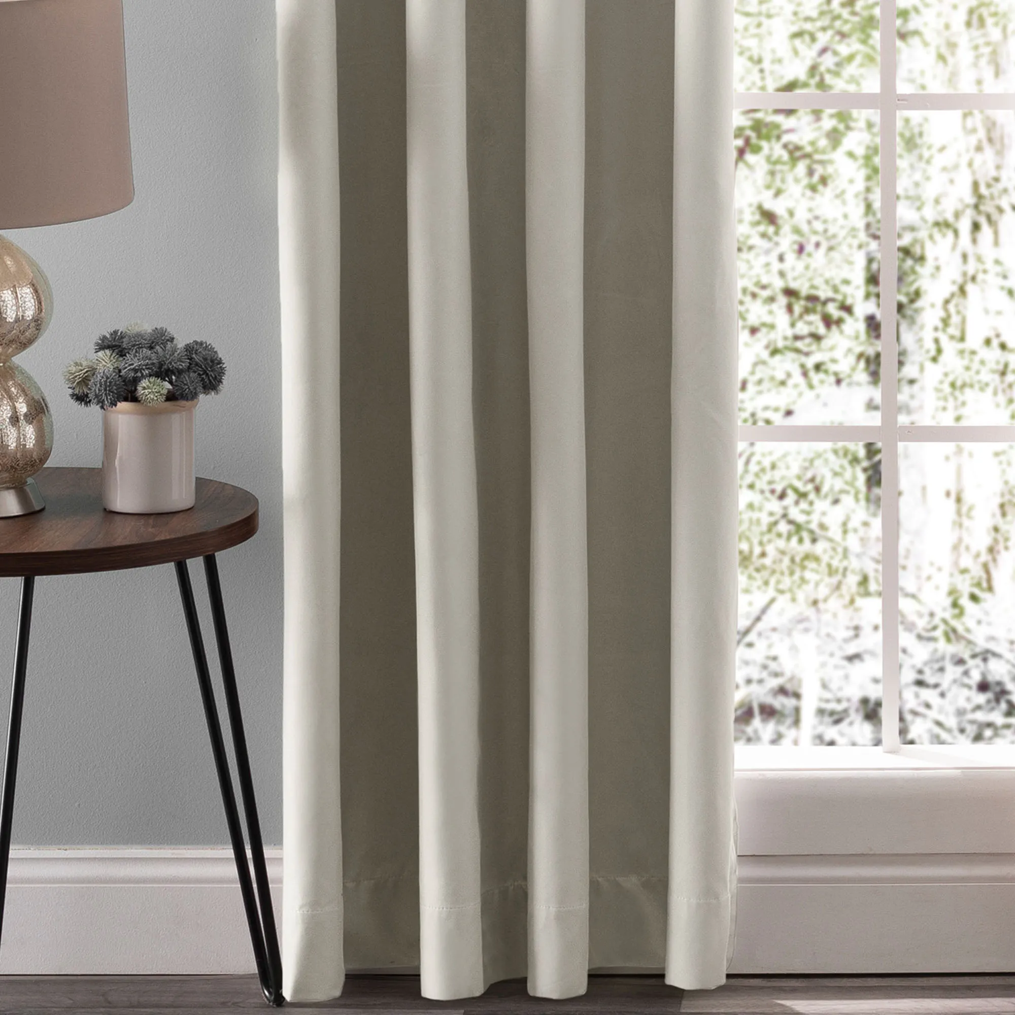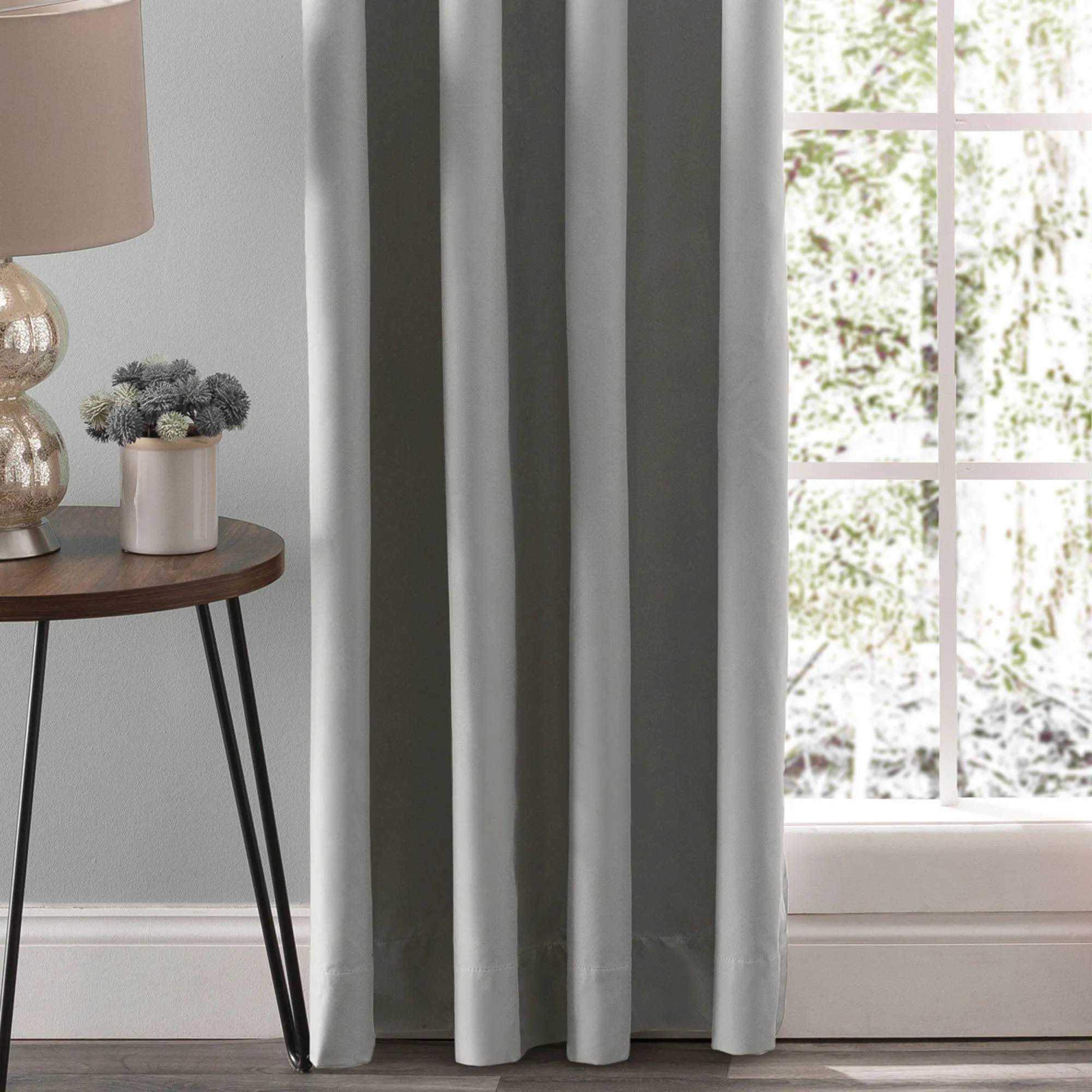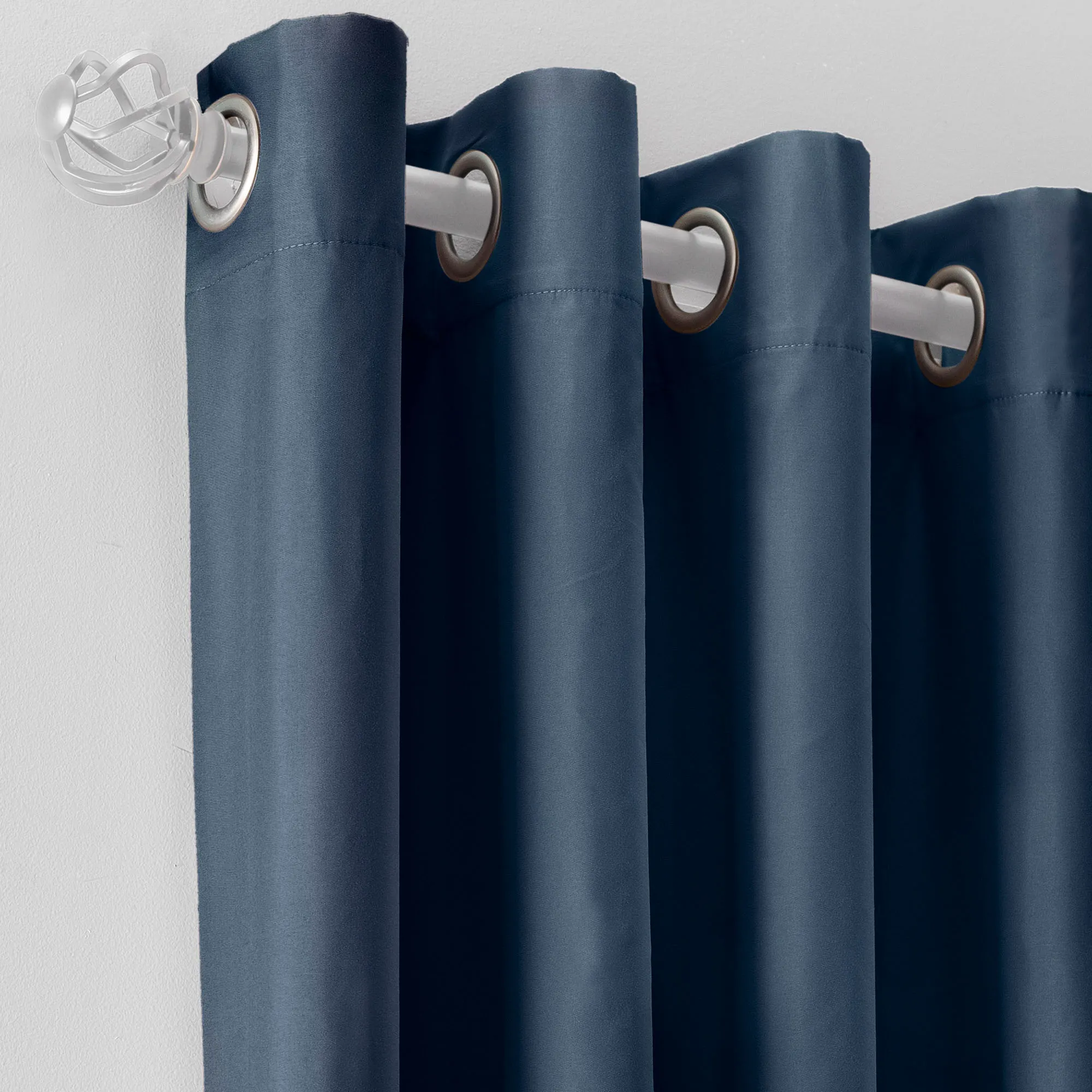 During the day and even at Nightfall, this energy-efficient grommet curtain panel looks casually elegant. Made of polyester, this solid color panel has acrylic lining to darken rooms, block 100% of light, reduce noise, and help with temperature regulation. Metal grommets, 1.5" dia., have a matte nickel finish. Grommet curtain panel is sold individually; each is 52"W. Machine washable. Imported.