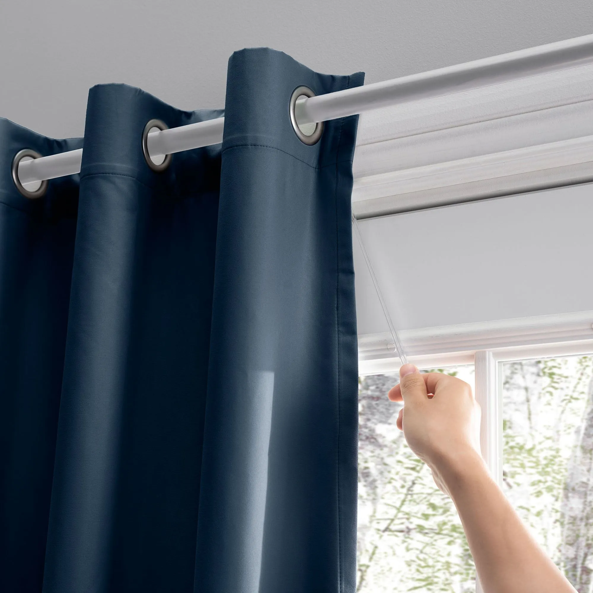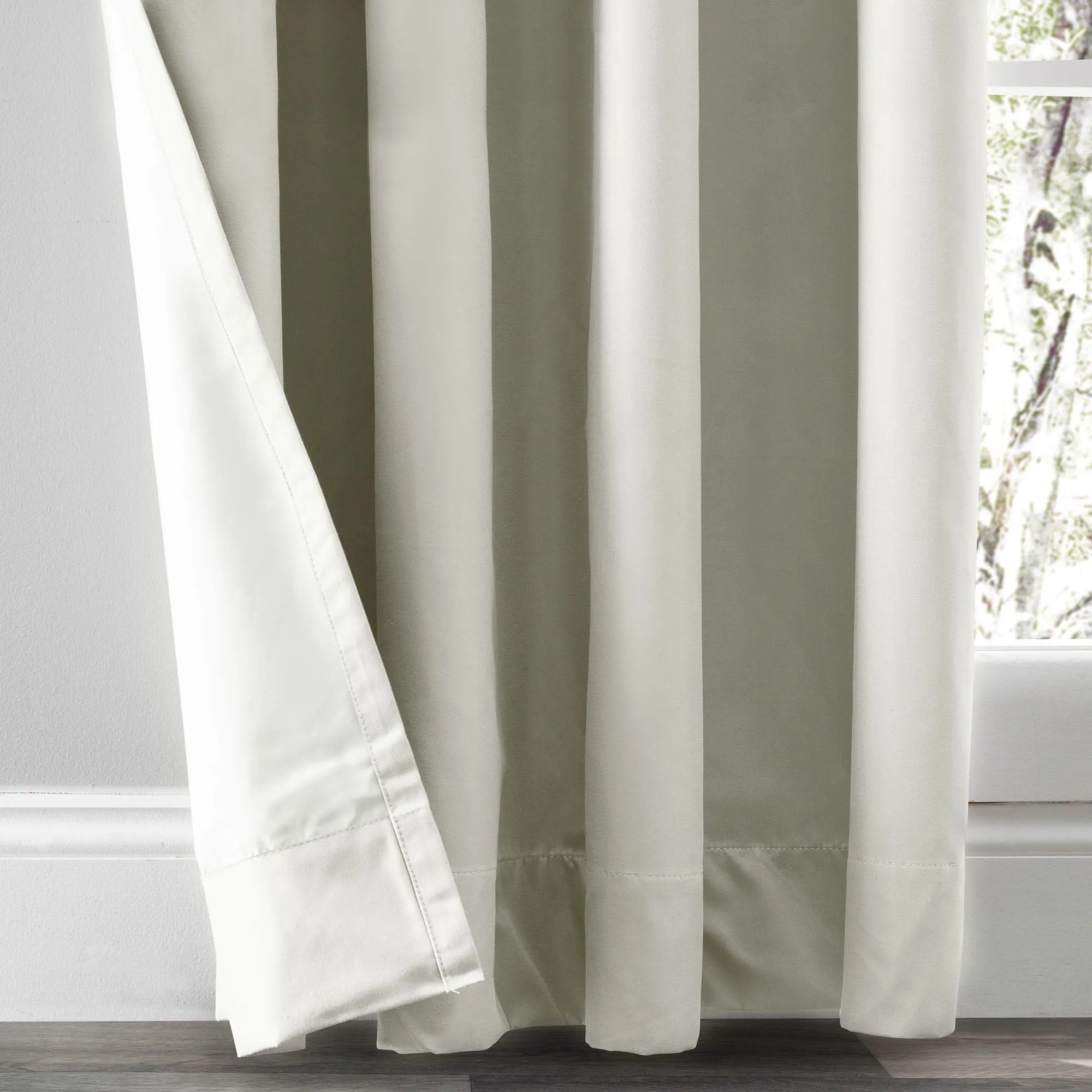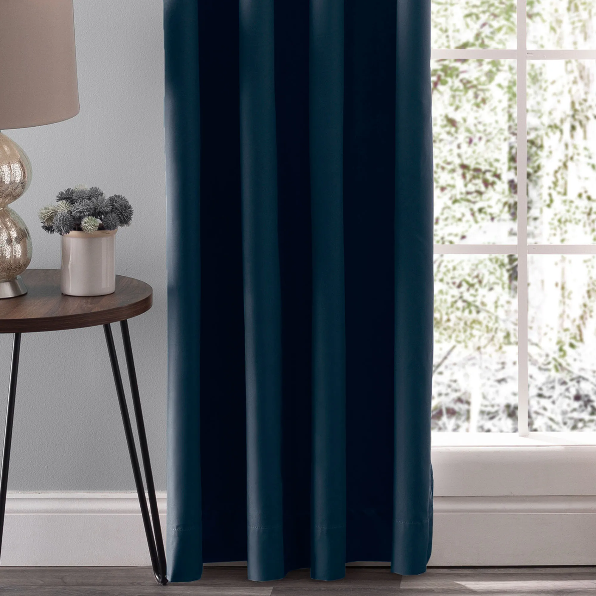 During the day and even at Nightfall, this energy-efficient grommet curtain panel looks casually elegant. Made of polyester, this solid color panel has acrylic lining to darken rooms, block 100% of light, reduce noise, and help with temperature regulation. Metal grommets, 1.5" dia., have a matte nickel finish. Grommet curtain panel is sold individually; each is 52"W. Machine washable. Imported.