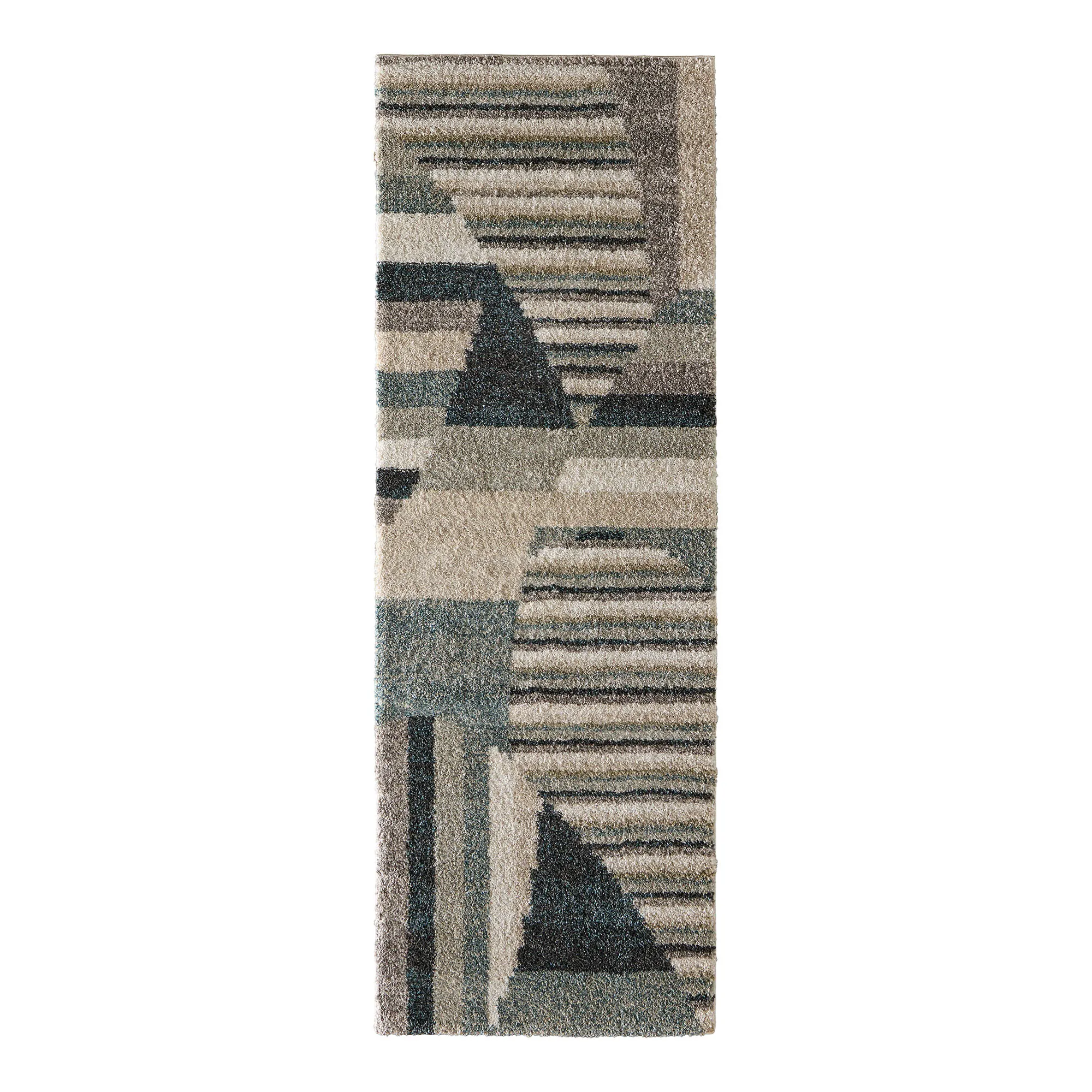 Straight lines embrace flowing angles within the Niklas Abstract Rug. Power-loomed from stain- and fade-resistant polypropylene, the plush, .94" thick rug features bold and thin stripe designs that converge with abstract stepped, angular lines. A rich neutral palette of gray, ivory, taupe, charcoal, navy, beige, and tan hues fills the simplistic motifs and complements a variety of decor styles. Backing is jute. We recommend professional cleaning by a rug cleaner. Imported.
