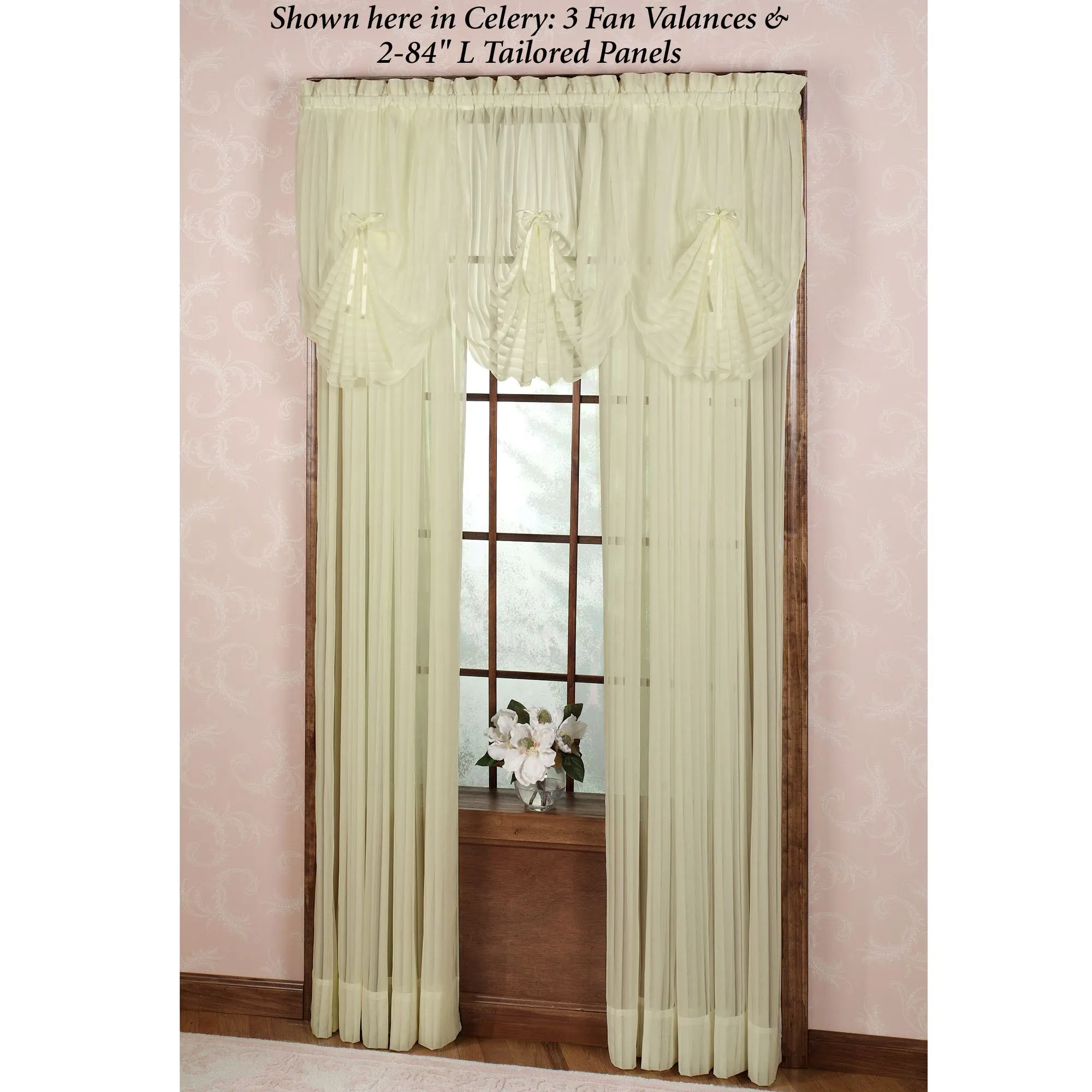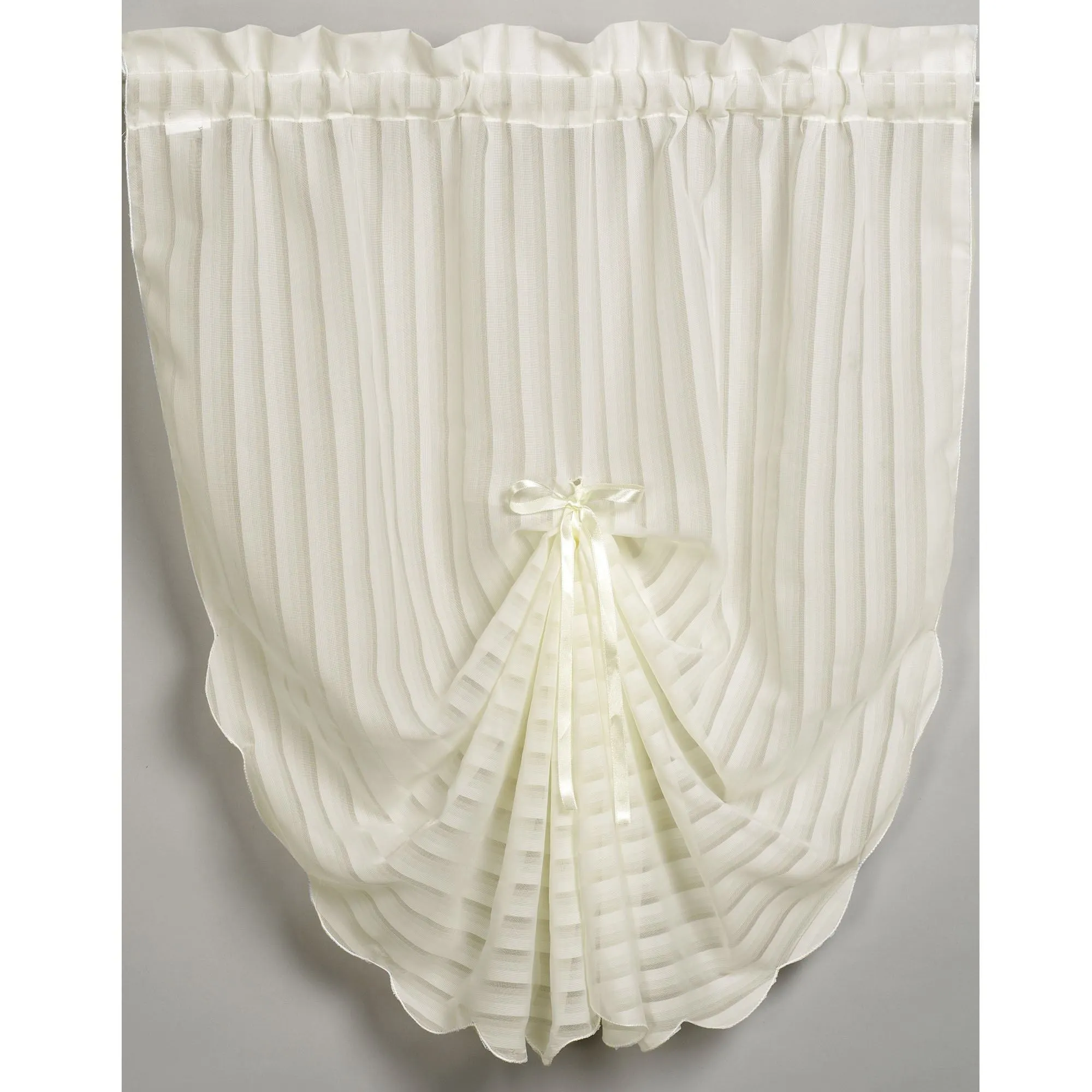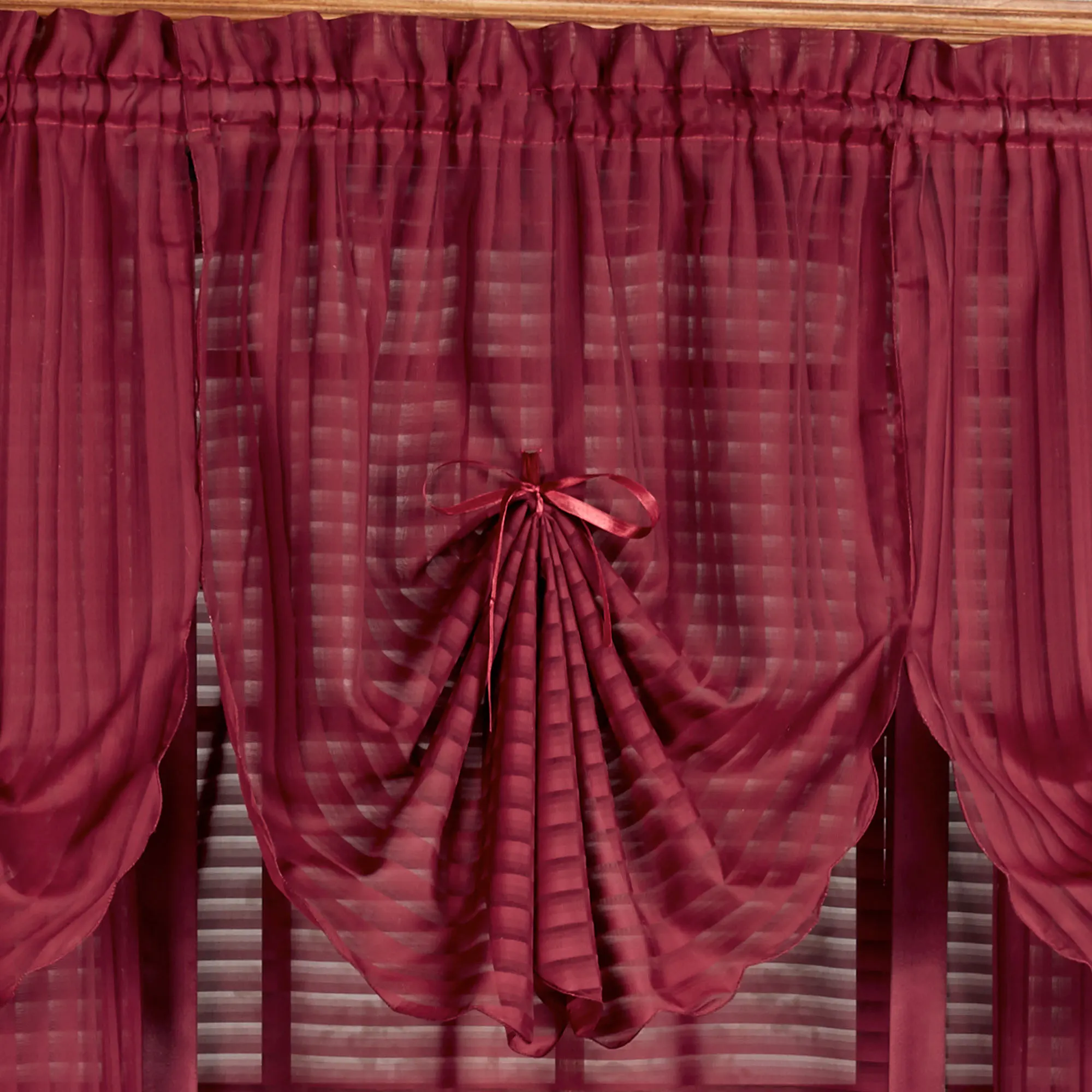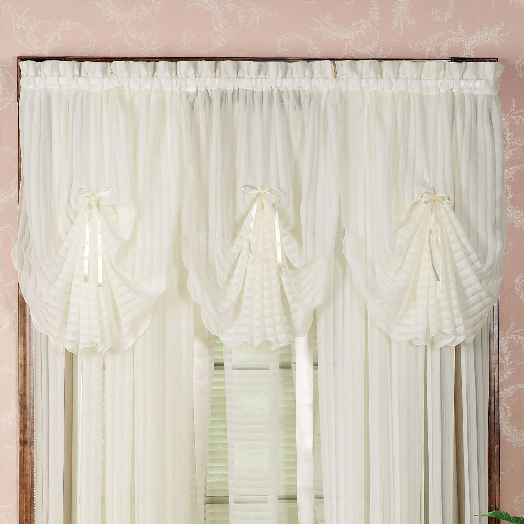 See More Views: Tailored Curtain Panel has sheer vertical stripes. Choose from two lengths. Ascot Valance has horizontal stripes, satin trim, and an acrylic jewel. Tie-up Shade has two silky satin ribbon ties. Swag Valance Pair has sheer stripes and a silky satin bottom edge. Gathered Valance has sheer stripes and a silky satin bottom edge. Scarf Valance has sheer stripes and is available in two lengths.