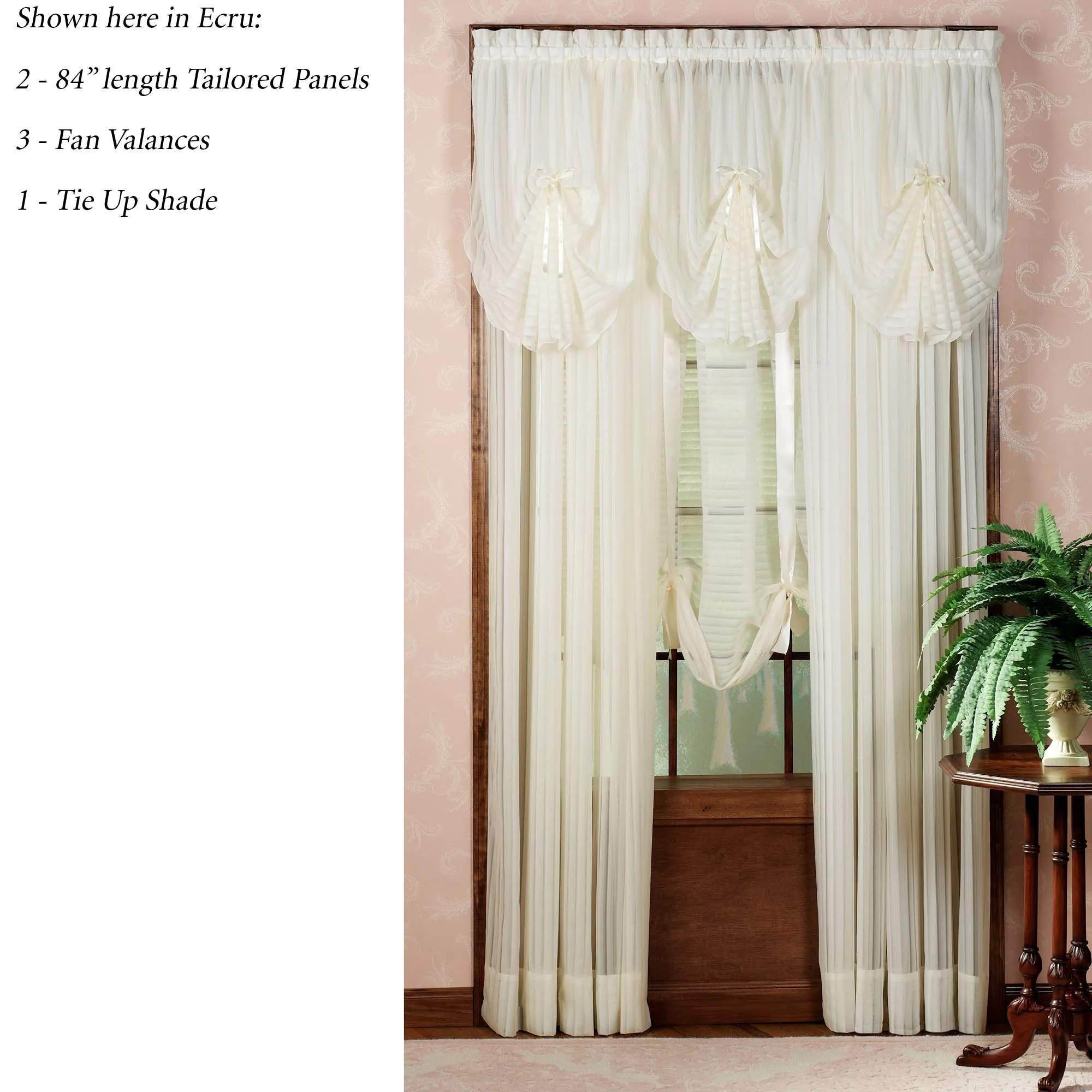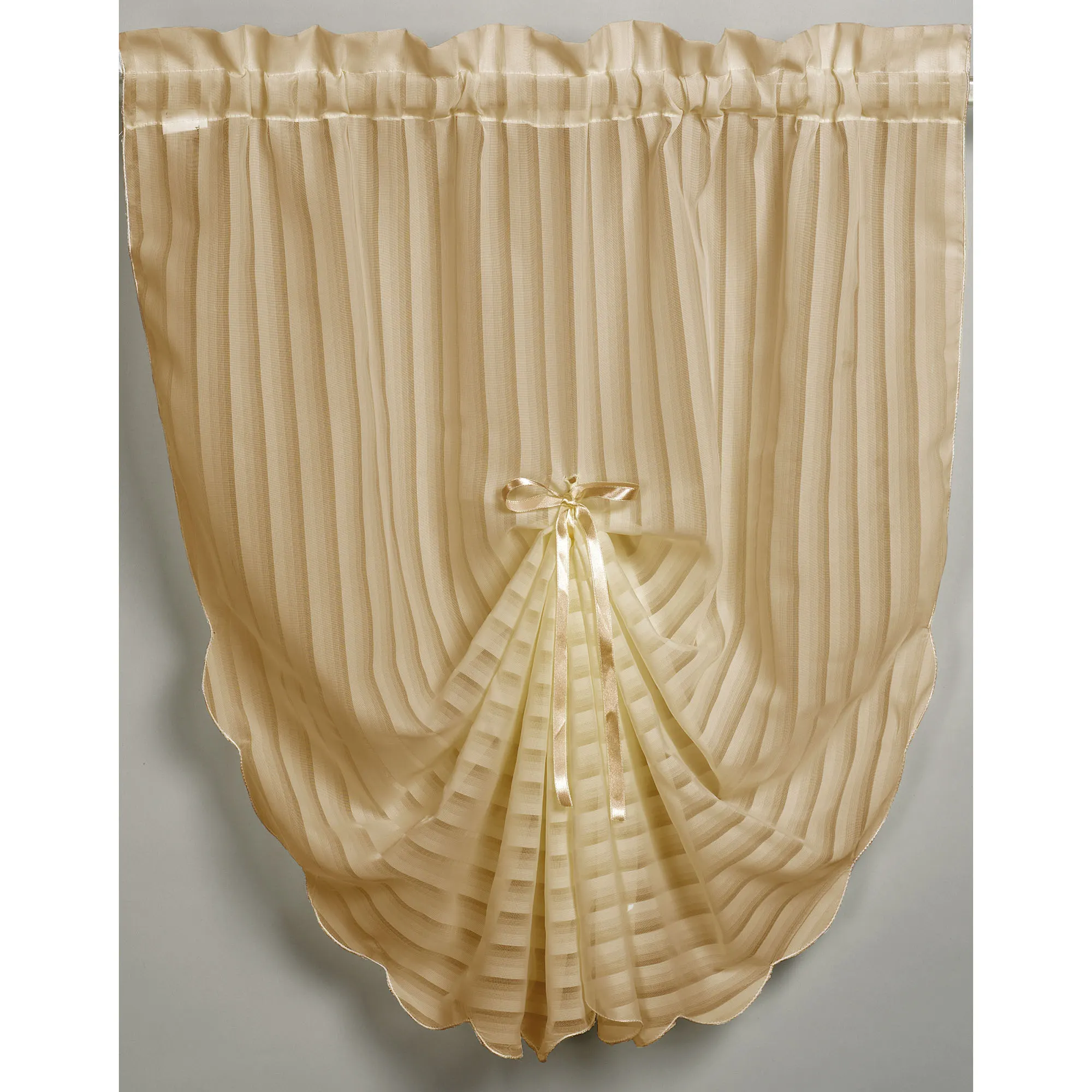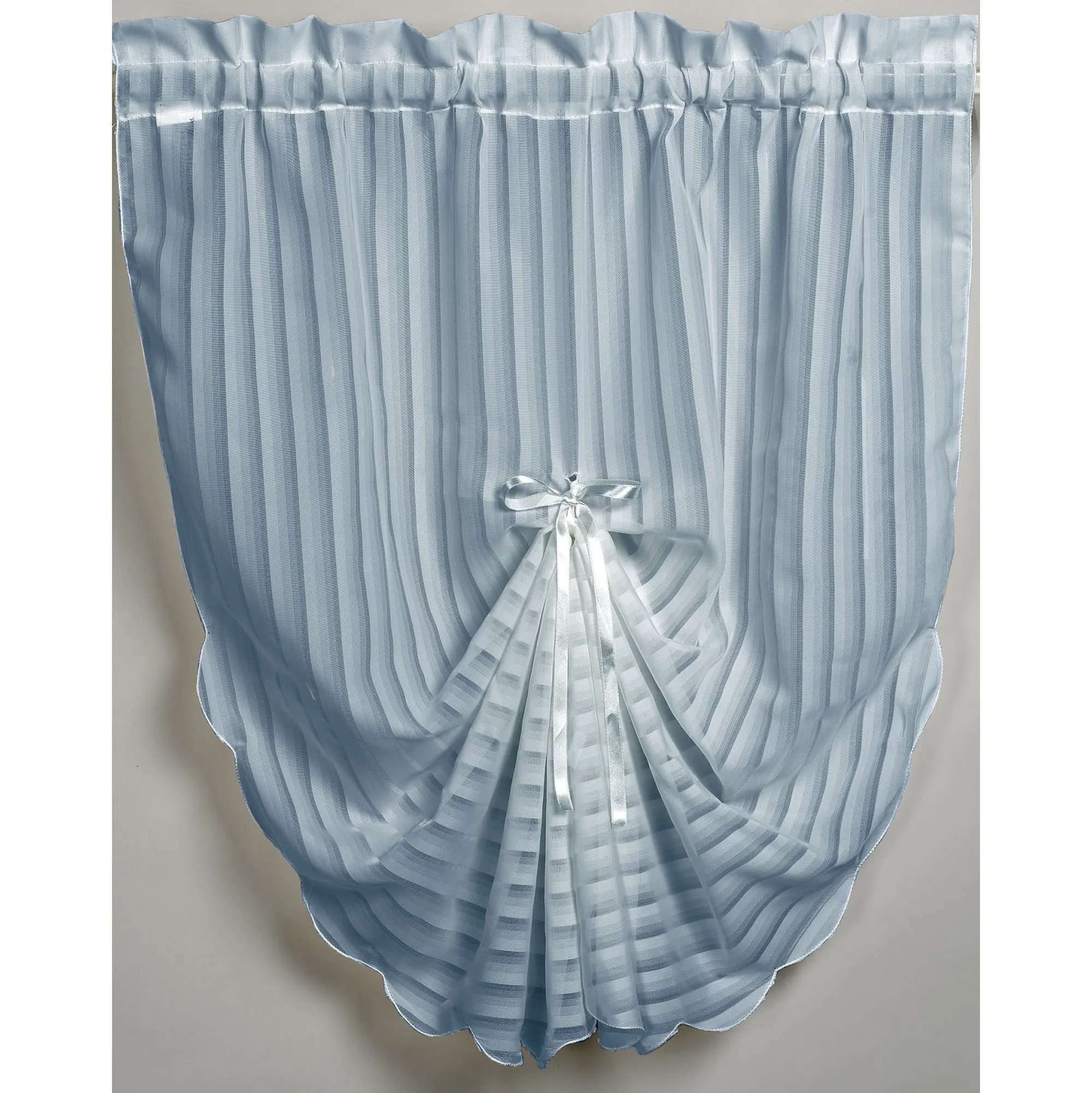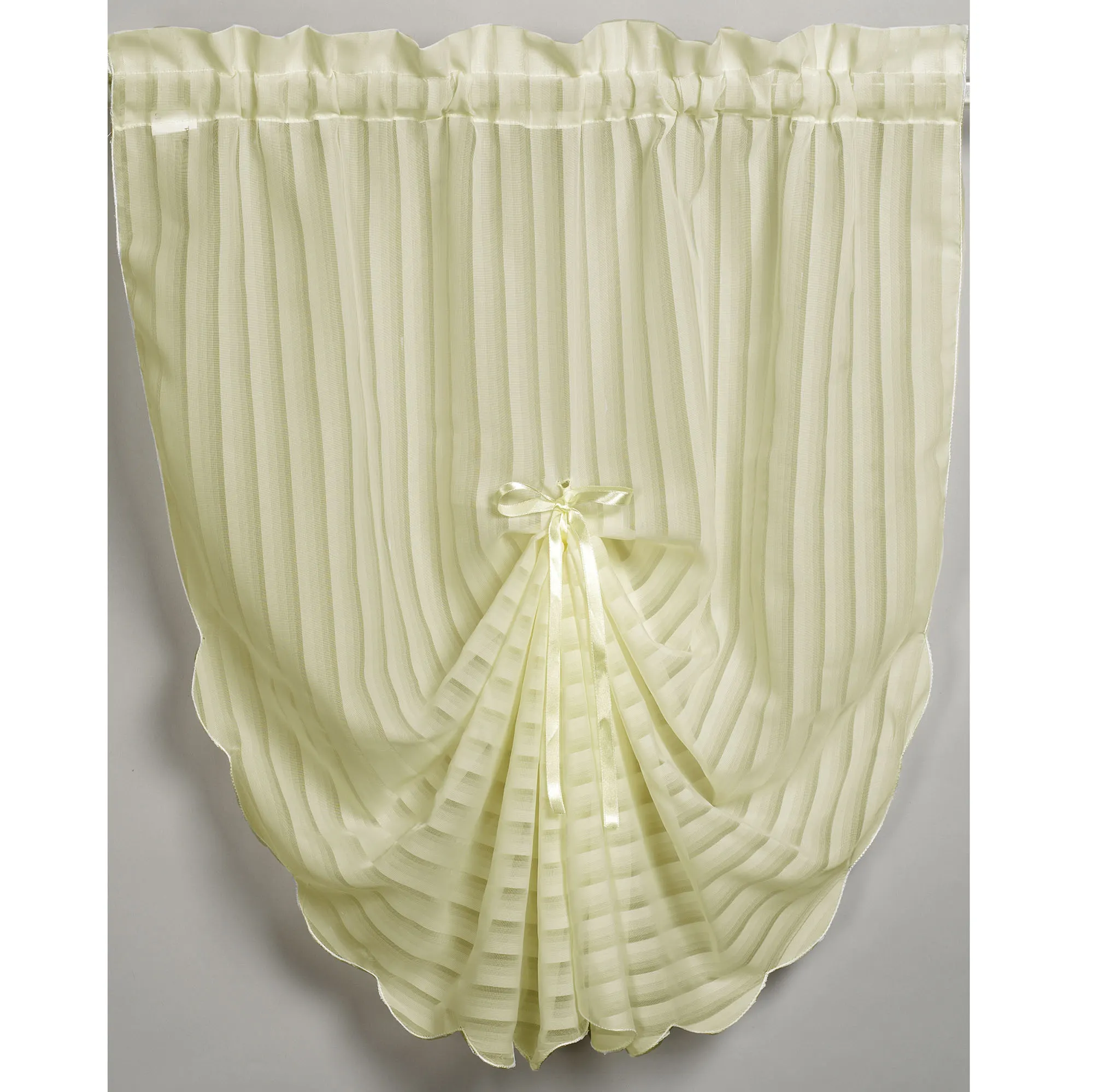 See More Views: Tailored Curtain Panel has sheer vertical stripes. Choose from two lengths. Ascot Valance has horizontal stripes, satin trim, and an acrylic jewel. Tie-up Shade has two silky satin ribbon ties. Swag Valance Pair has sheer stripes and a silky satin bottom edge. Gathered Valance has sheer stripes and a silky satin bottom edge. Scarf Valance has sheer stripes and is available in two lengths.