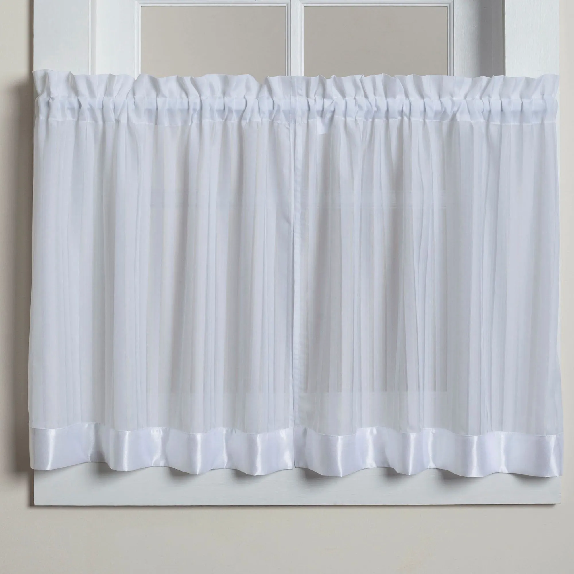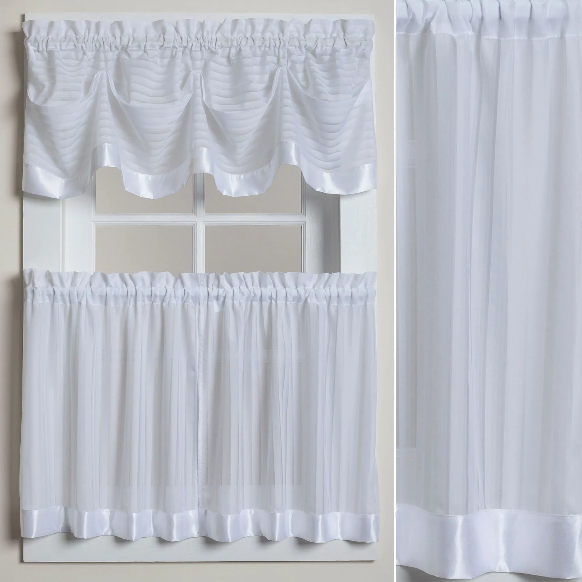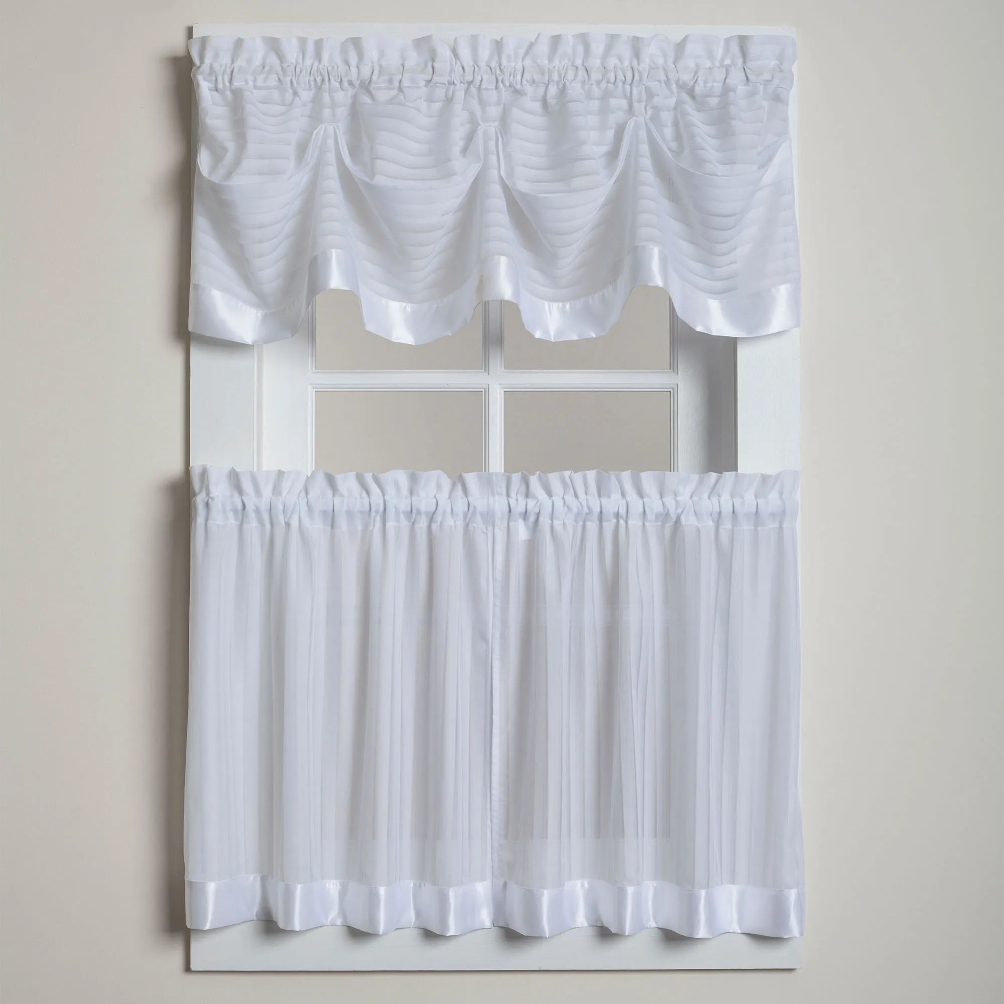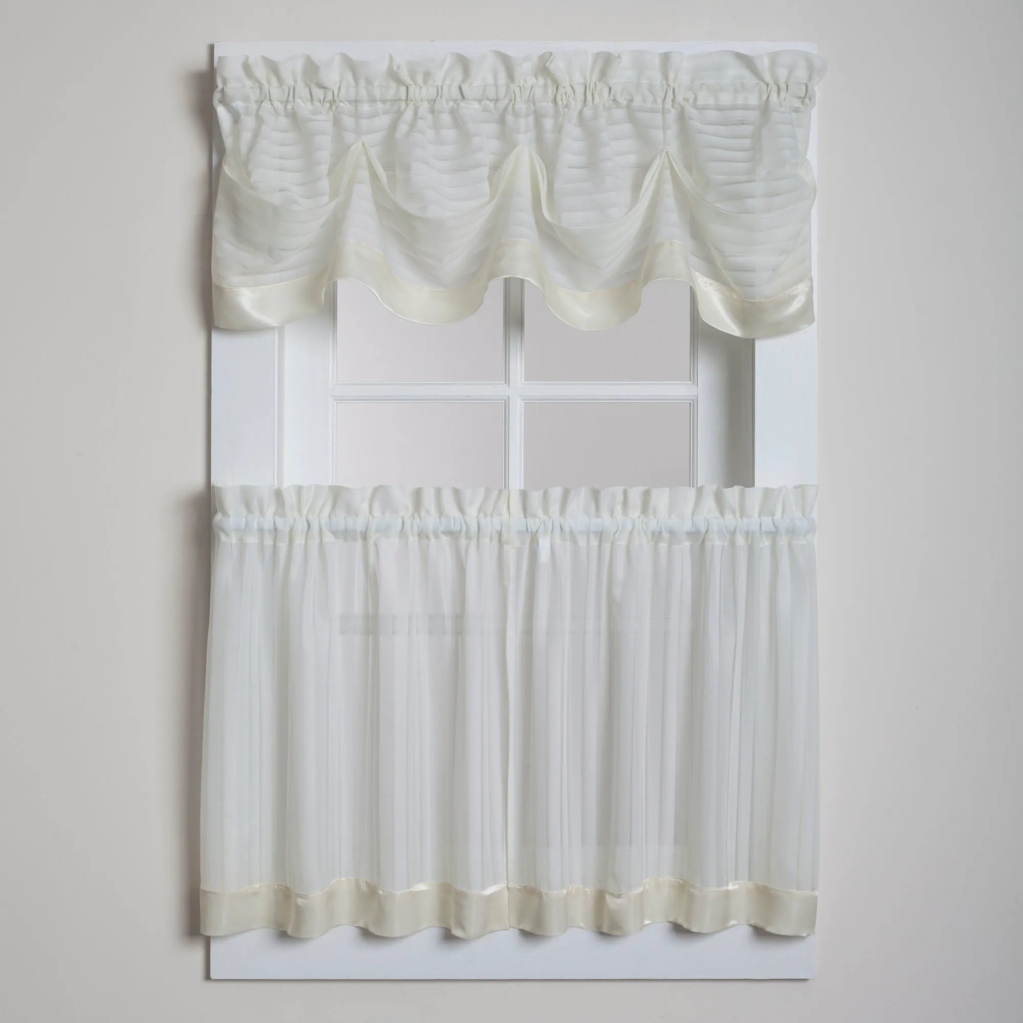 Stylishly subtle and airy, the delicate Nimbus Stripe Tier Window Treatment uses a striped pattern and sheer fabrics for a great visual appeal. Polyester window treatment is a solid color with sheer stripes. Specify Tier Pair, 60"W; or Tuck Valance, 60"Wx14"L. Window treatment has 1.5" rod pockets and satin trim on the bottom edge. Machine washable. Imported.