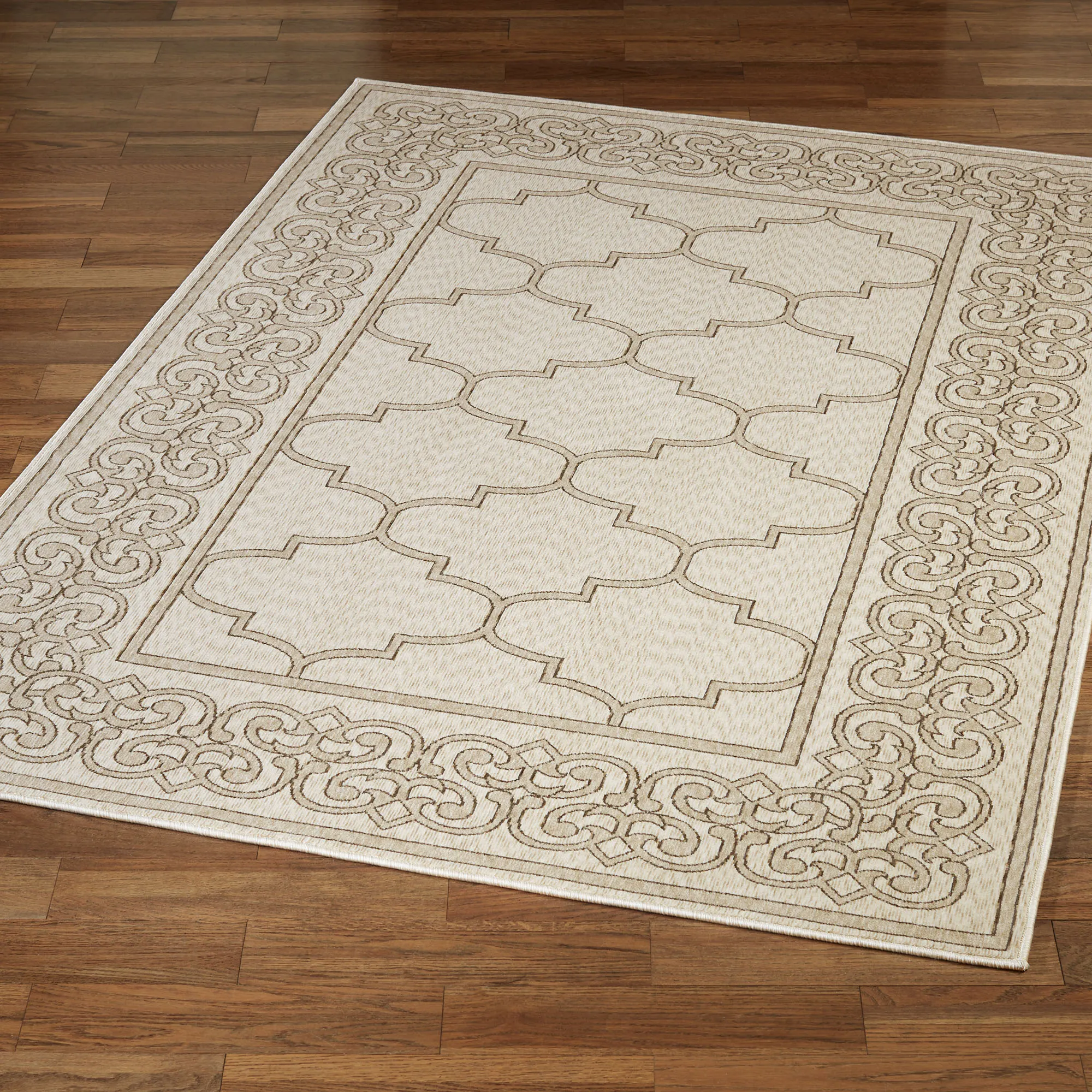 Quatrefoil and medallion designs reign supreme on the Nobility Rug. This power-loomed, polyester area rug, .30" thick, has ornate motifs that decorate with elegant splendor. Colors include warm beige, deep brown, and ivory. We recommend professional cleaning by a rug cleaner. Imported.