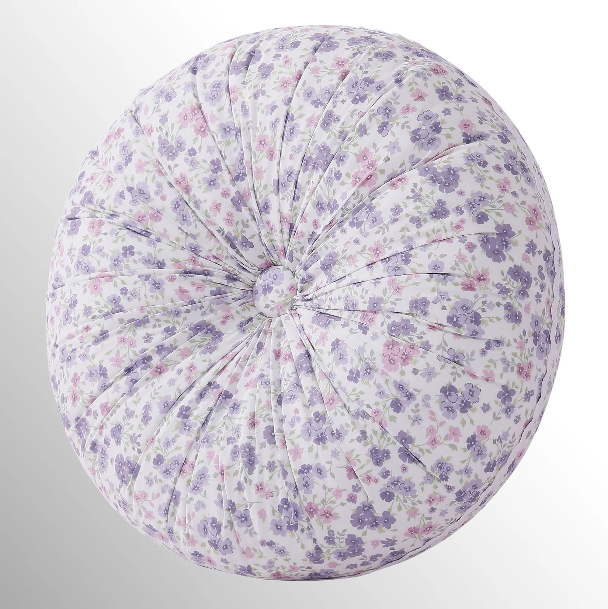 Pillows are reversible. Spot clean. Square has florals and gingham plaid pleated flange; reverses to florals. Quilted Rectangle has florals pieced with a miniature floral frame and piped edges; reverses to miniature florals. Reversible handmade Round has miniature florals and a button-tuft center.
