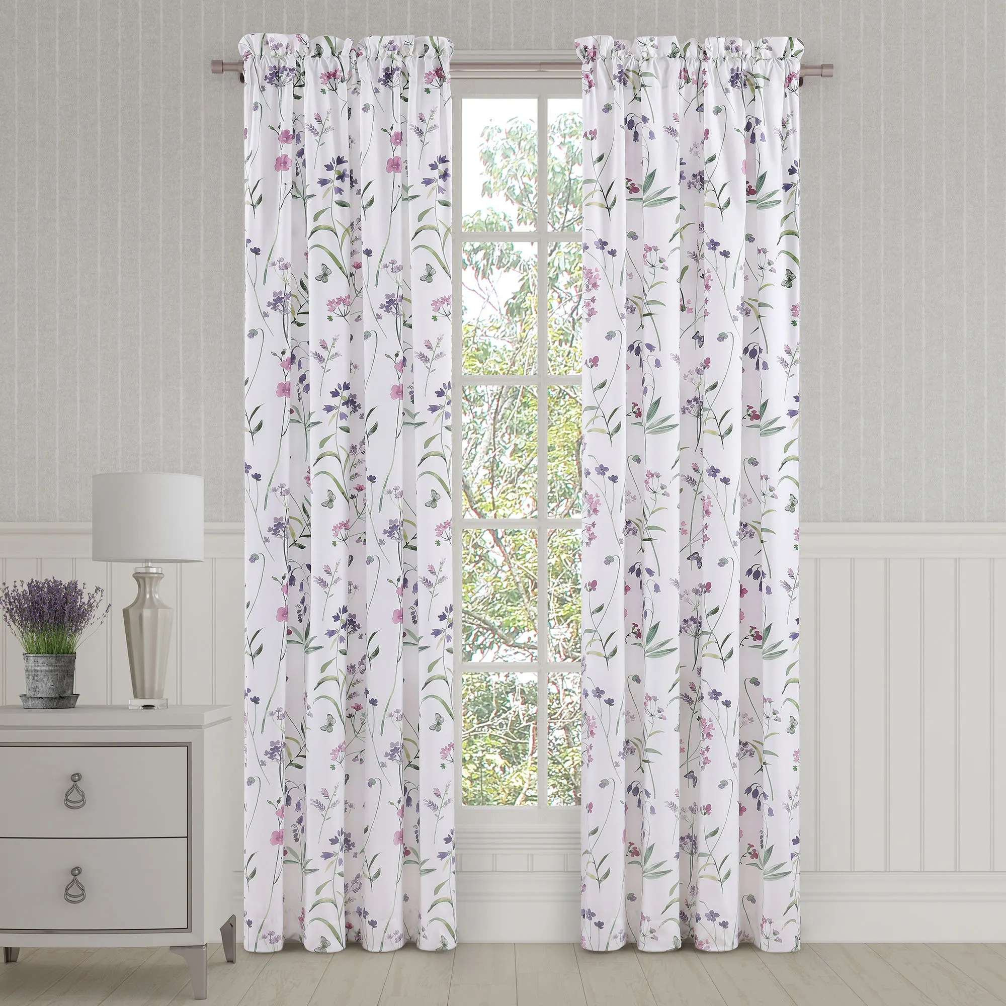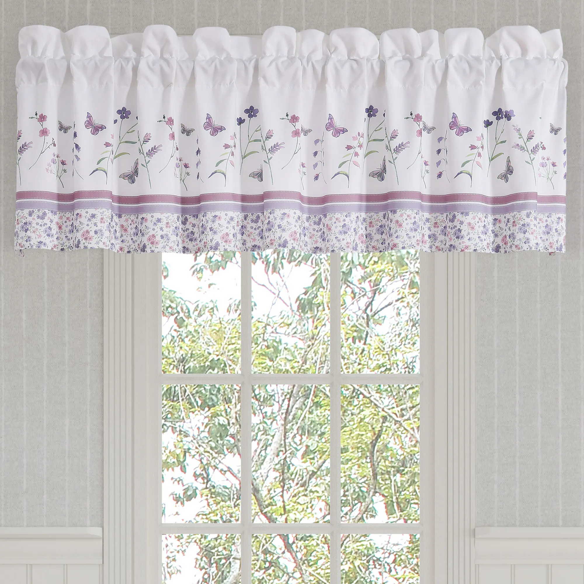 Lined Window Treatments have florals, tailored edges, and 3" rod pockets. Curtain Pair includes tiebacks. Valance has orchid and lavender ribbon accents and a miniature floral bottom.