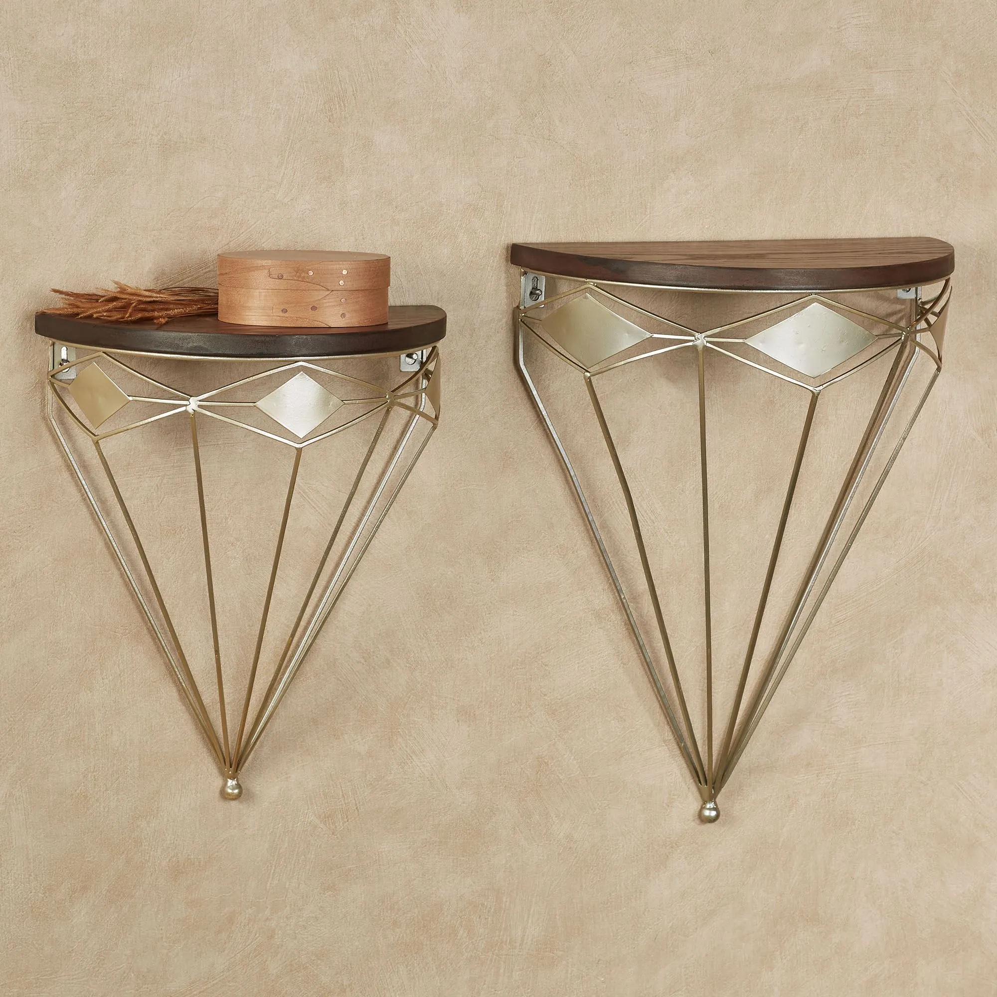 The Nolan Wall Shelf Set displays your mesmerizing style. Each openwork metal wall shelf features a platinum finish, diamond accents, and a dark wooden shelf atop the prismatic design. Small is 11.5"Wx6.5"Dx14.5"H; large is 13.5"Wx7.5"Dx18"H.