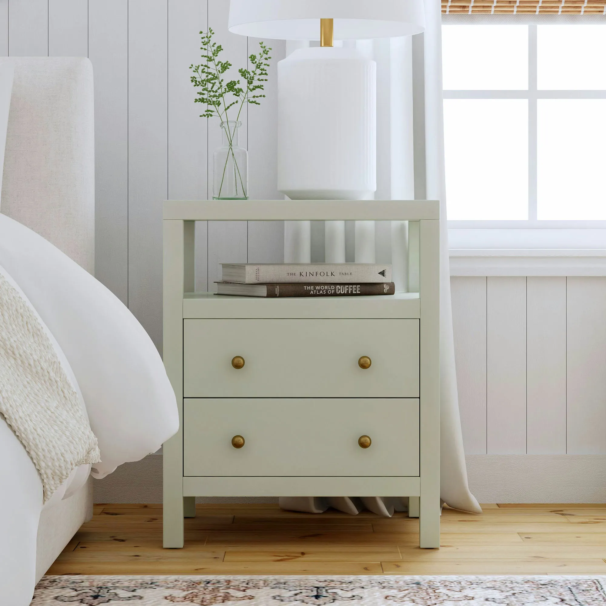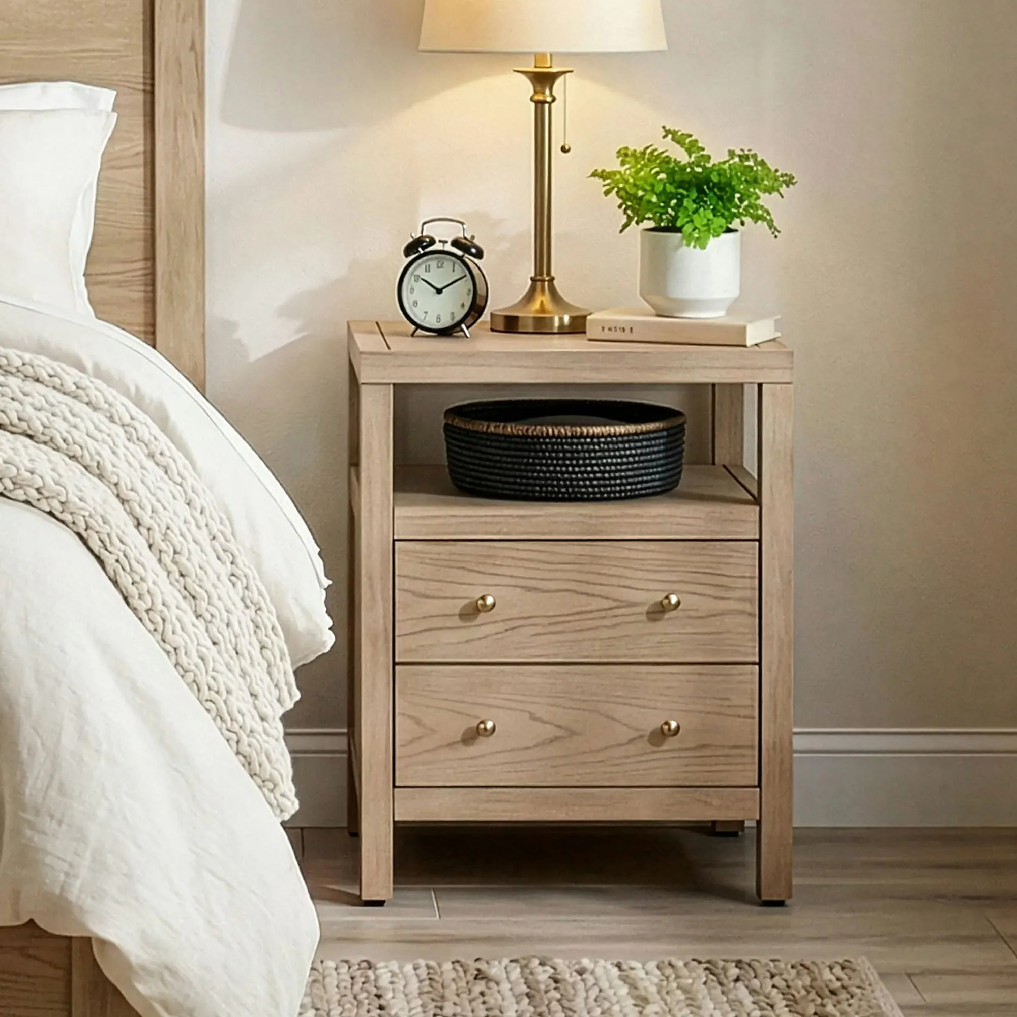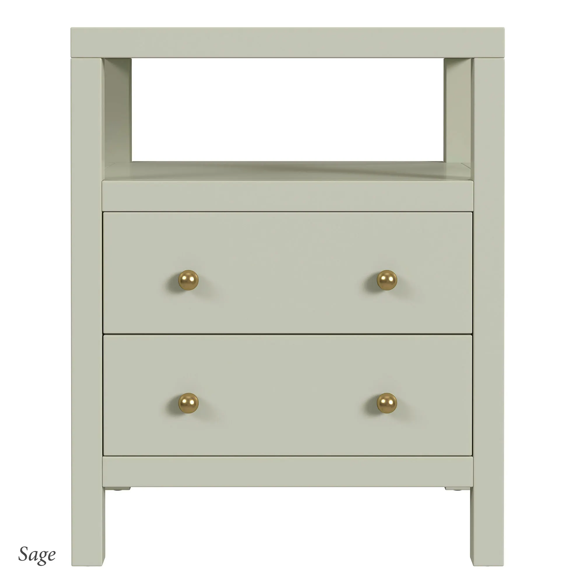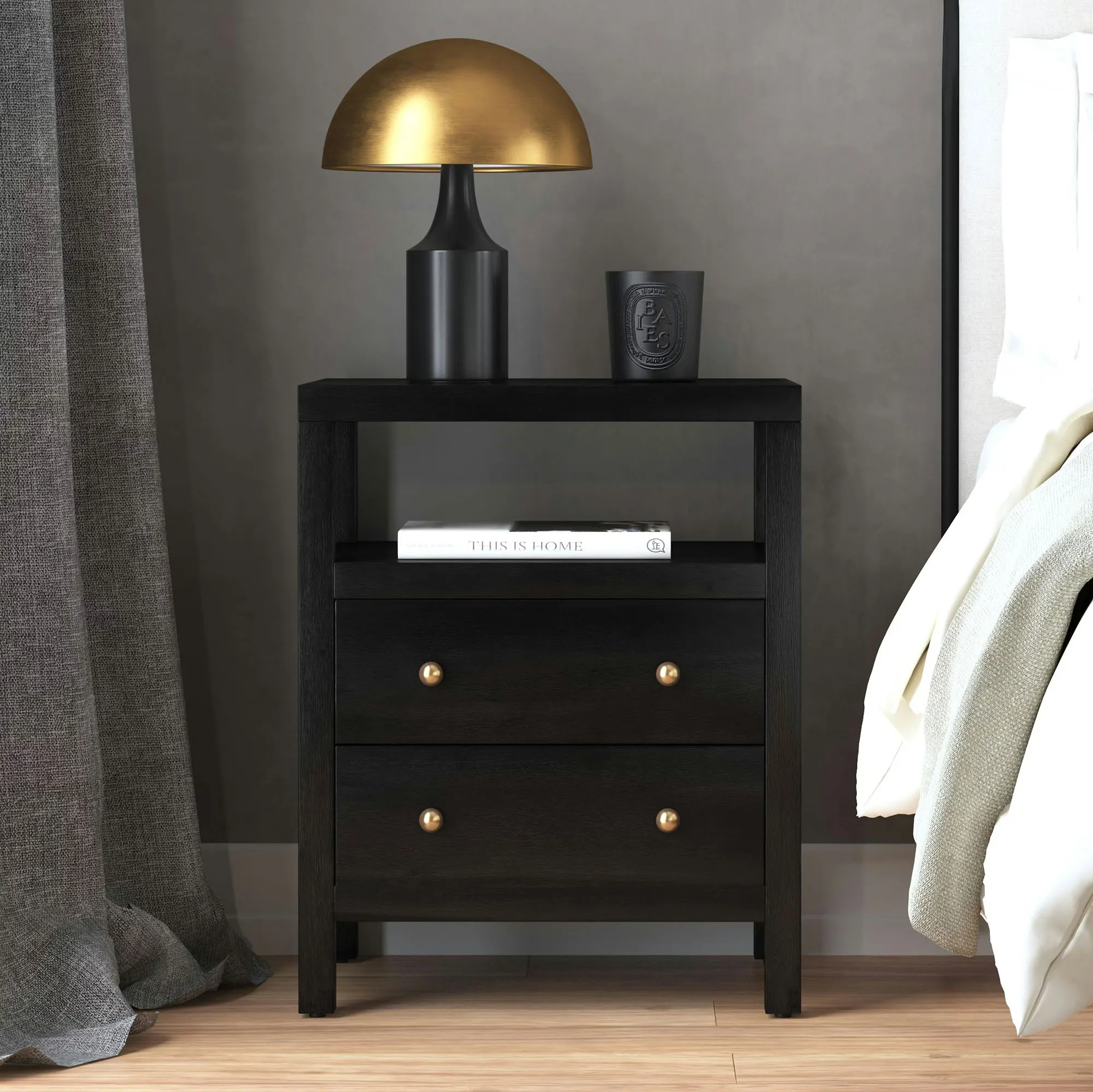 • Nightstand has a shelf and two drawers