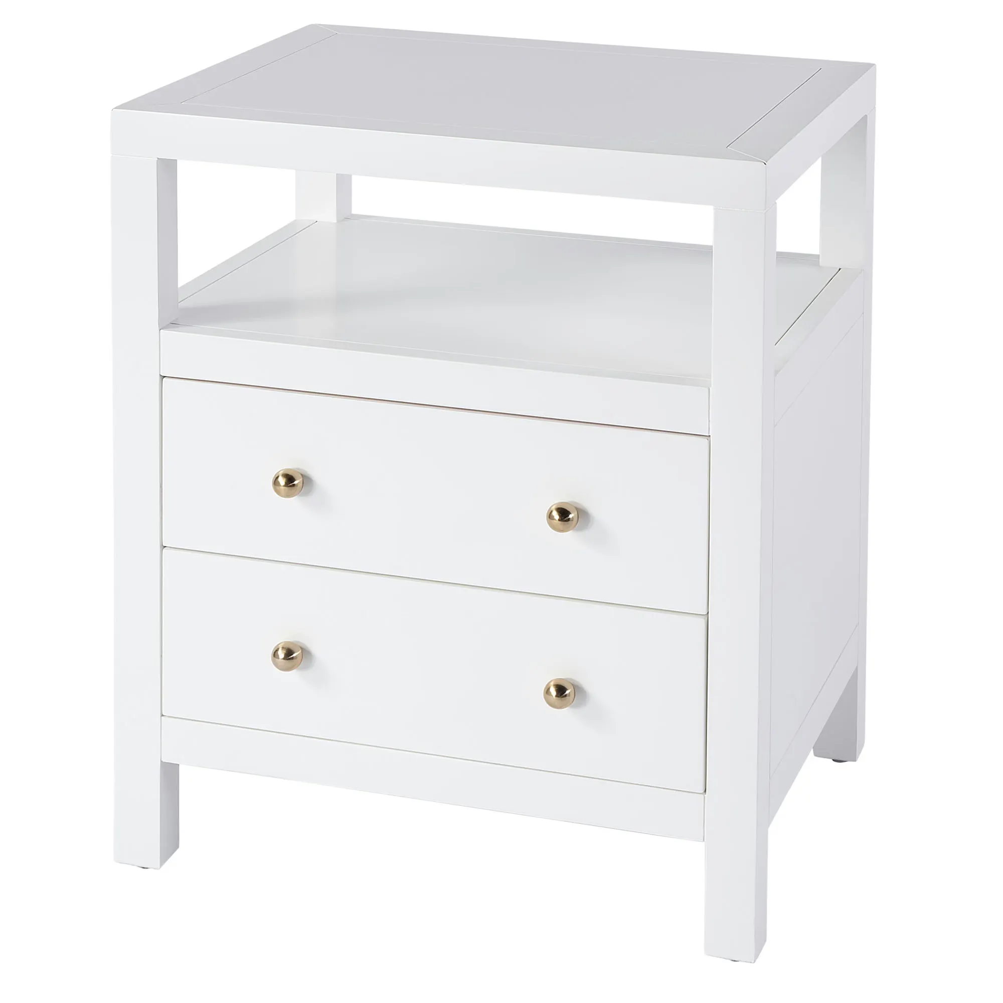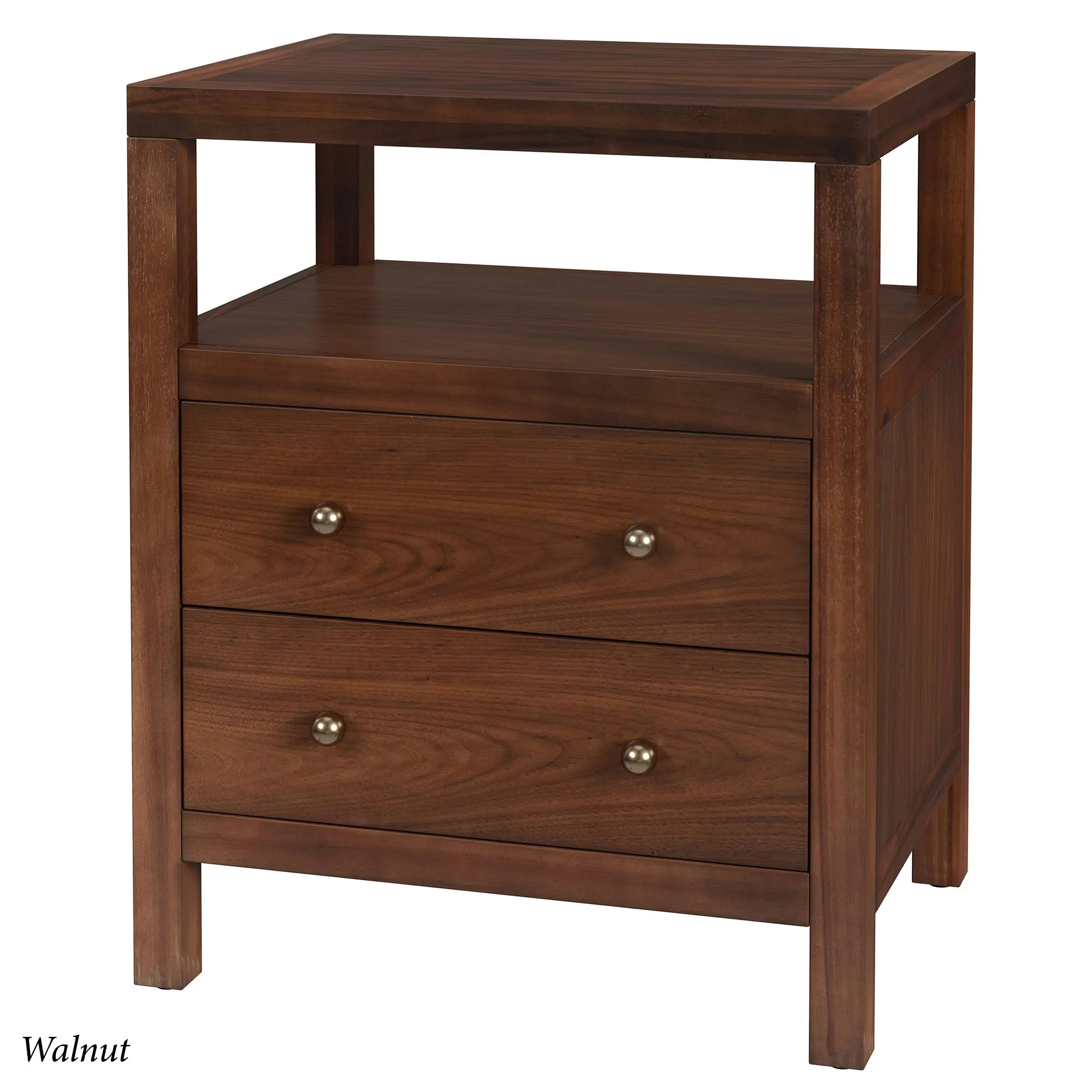 The Nora Nightstand has a sleek style that will look fabulous in a bedroom or as a side table in a living room. This wooden furnishing, from Butler Specialty, has a shelf and two drawers. The drawers, 16"Wx12.5"Dx3.75"H each, have under-mount glides and round metal pulls with a gold finish. The open shelf is 21"Wx17"Dx6"H. The maximum recommended weight is 200 lbs. Overall, the nightstand table measures 21"Wx17"Dx26.5"H; weighs 39 lbs.