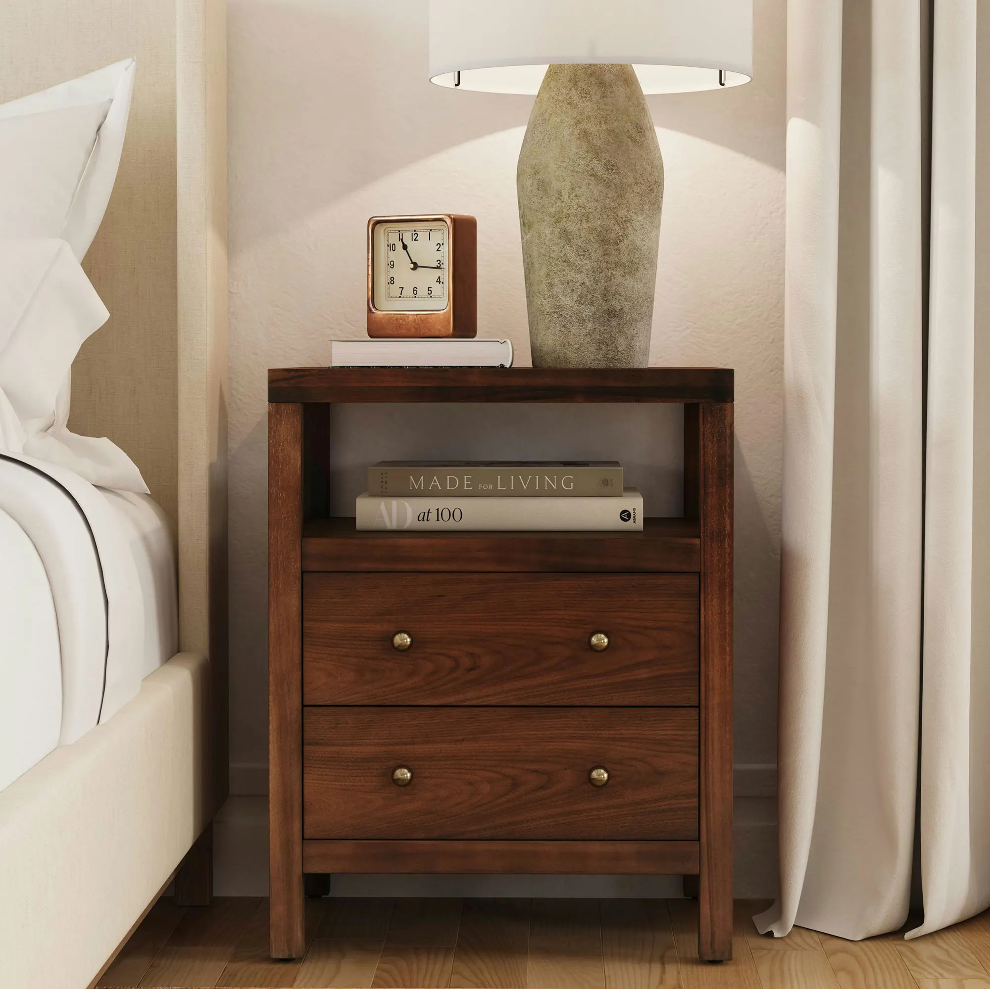 The Nora Nightstand is wooden with metal drawer pulls.