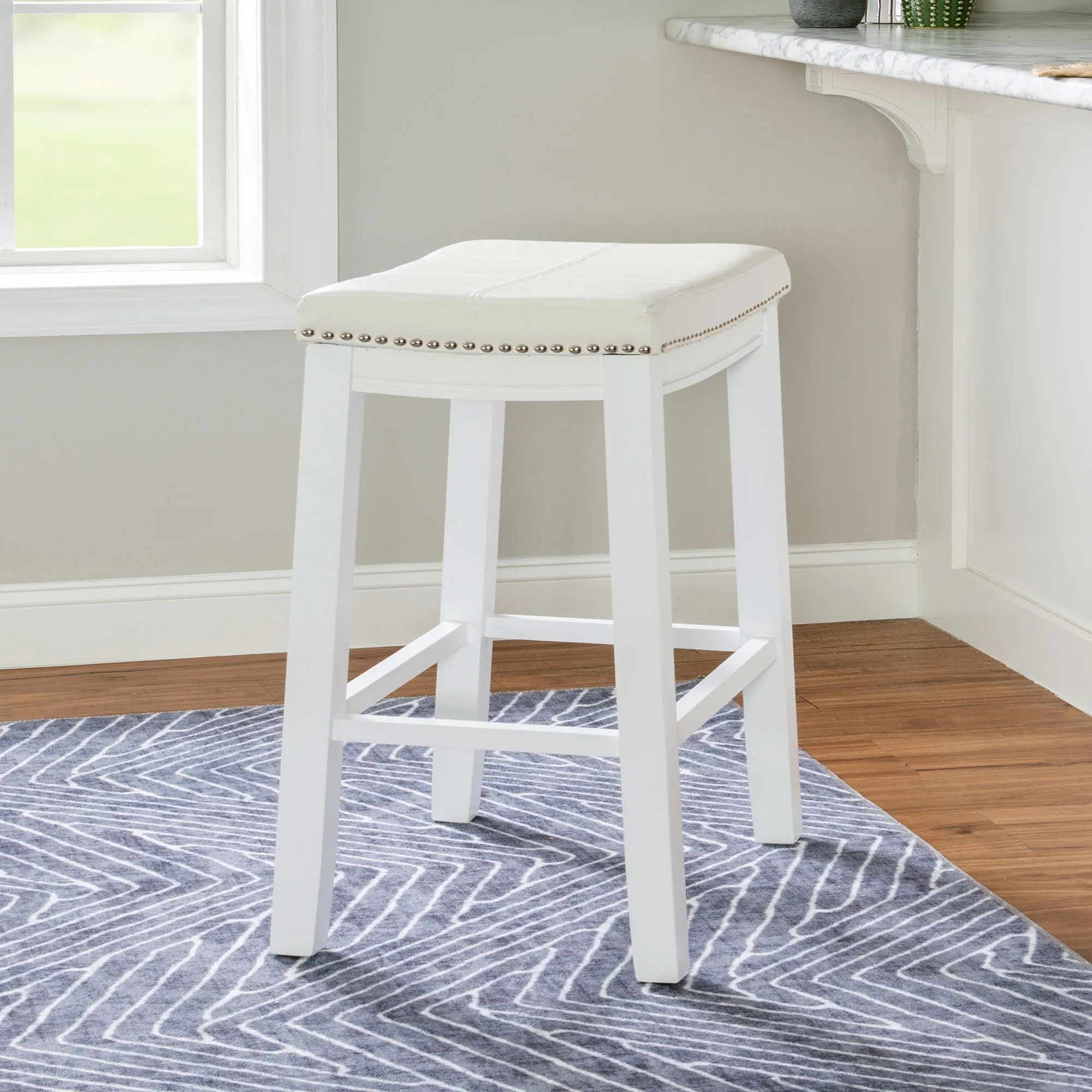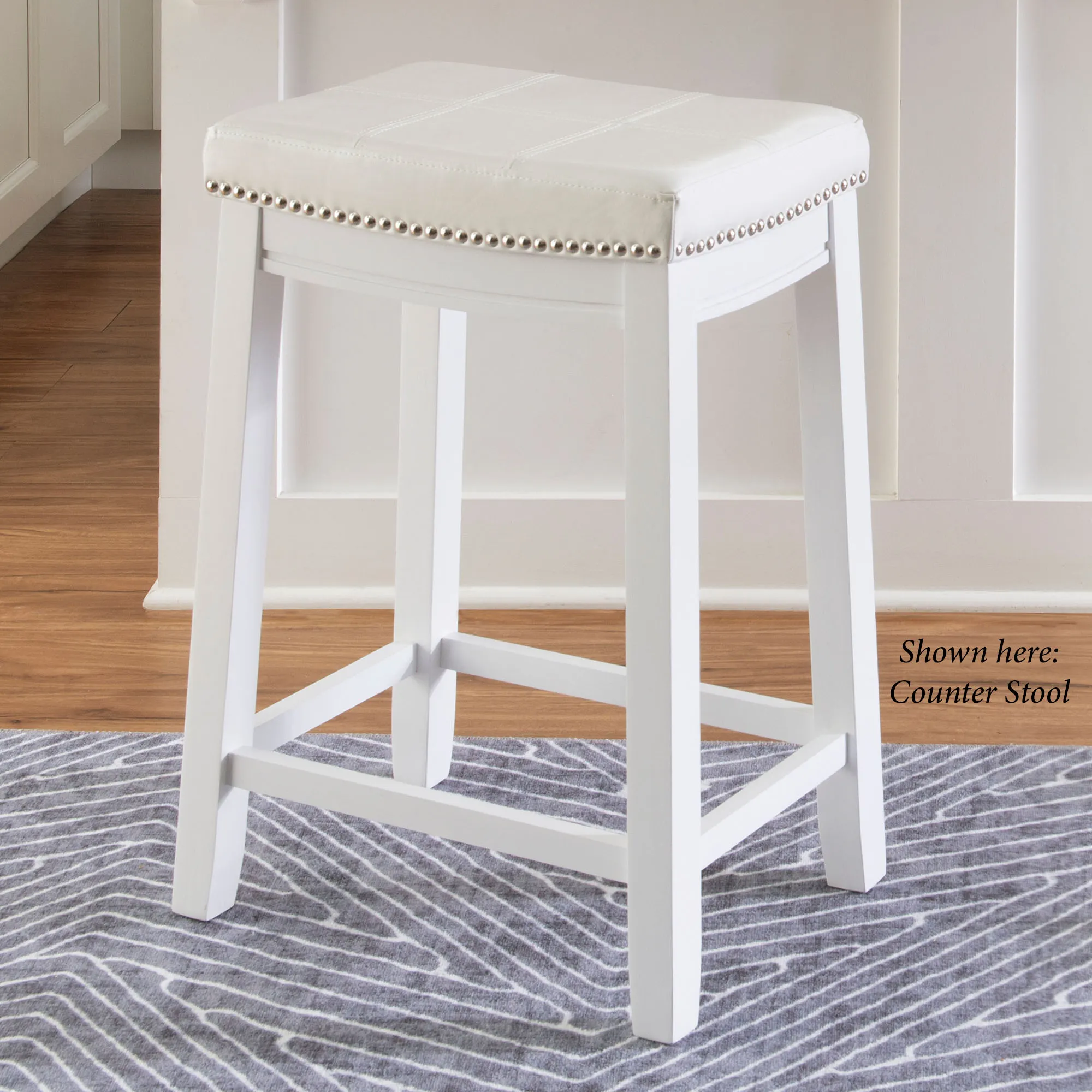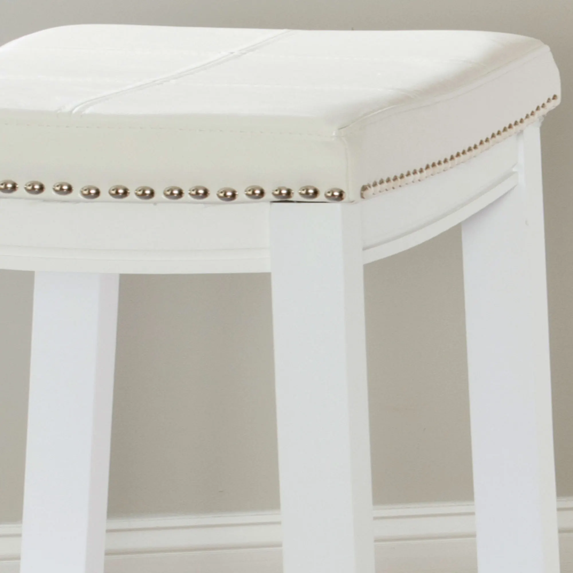 Charming details add a lovely finishing touch to the North Haven Kitchen Stool. With a painted white finish, the backless wood stool features sleek lines and a convenient footrest. Shiny silver nailhead trim and double needle accent stitching embellish the white faux leather, upholstered foam-cushioned seat for a detailed flourish and added durability. Maximum weight is 275 lbs. Perfect for counter heights of 41" to 43", the Bar Stool measures 19"Wx13.5"Dx32.5"H and weighs approx. 18 lbs. Perfect for counter heights of 35" to 39", the Counter Stool measures 18.5"Wx12.5"Dx26.5"H and weighs approx. 12 lbs. Wipe the fabric clean.