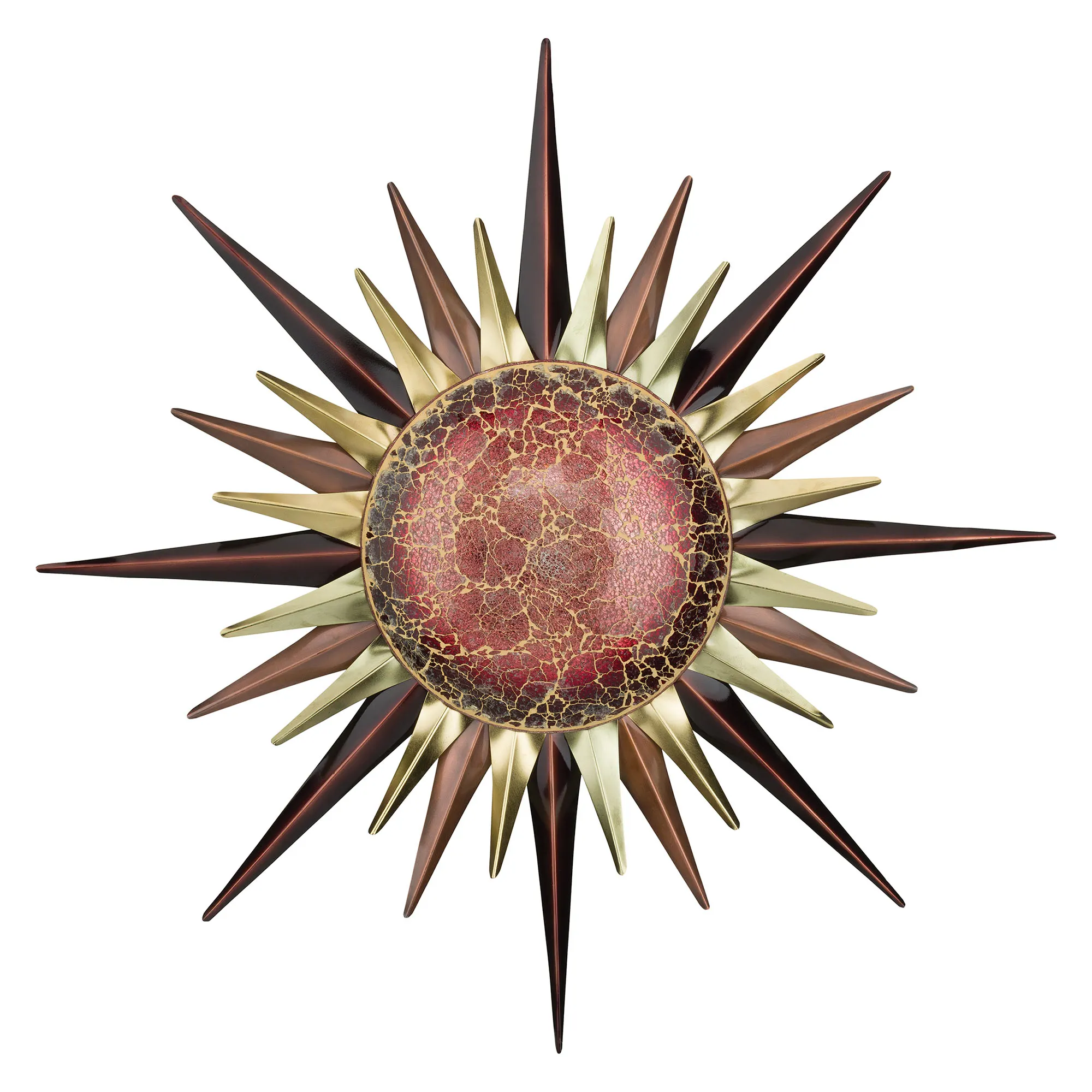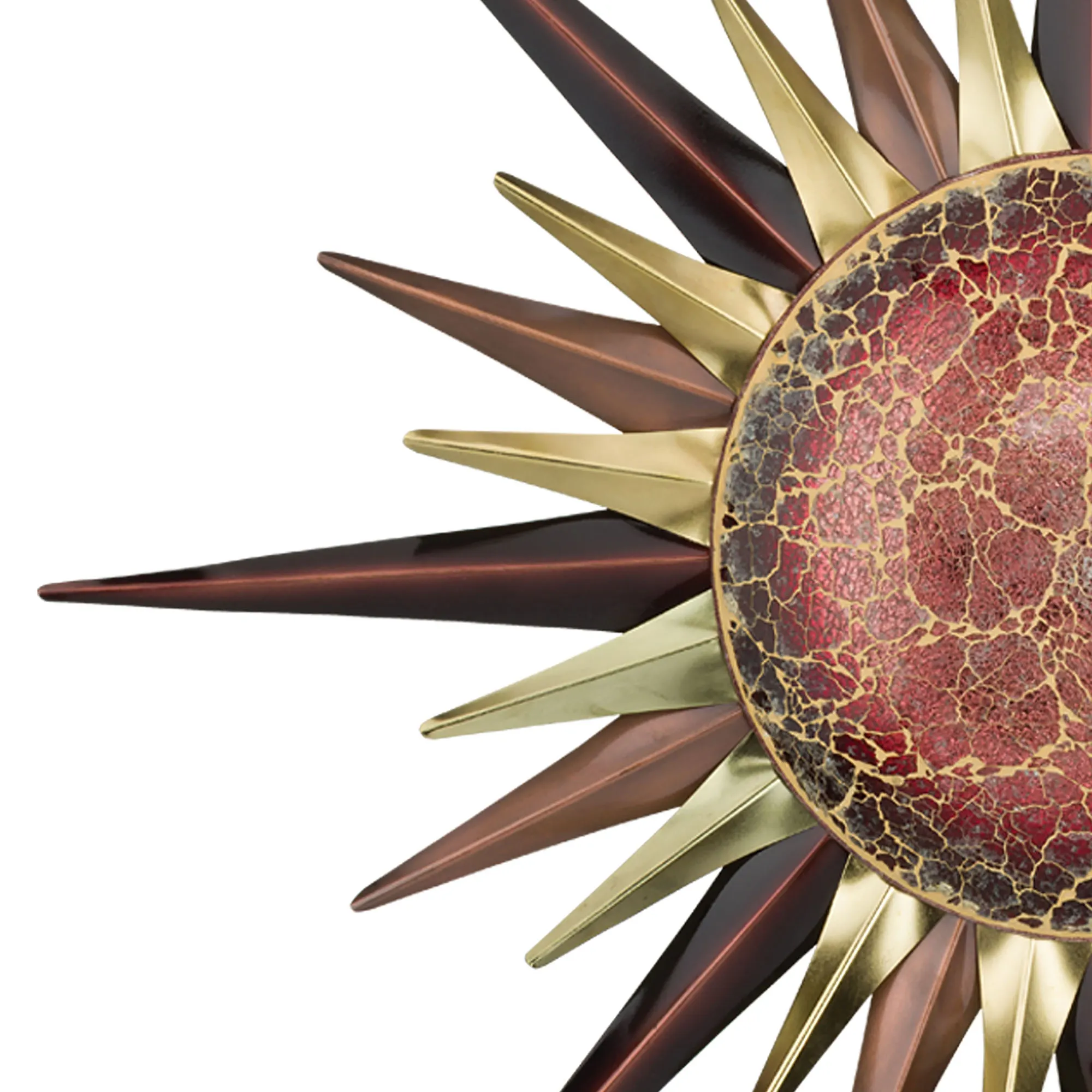 The North Star Mosaic Wall Art guides your indoor or outdoor decor toward beautiful tastes year round. Resembling a striking sun or star, the dynamic celestial wall art features a crackled mosaic glass center surrounded by layered metal dimensional rays. Resisting weather and fading, rich warm tones of gold, bronze, and burgundy color the wall sculpture. Measures 30"dia.x2.5"D.
