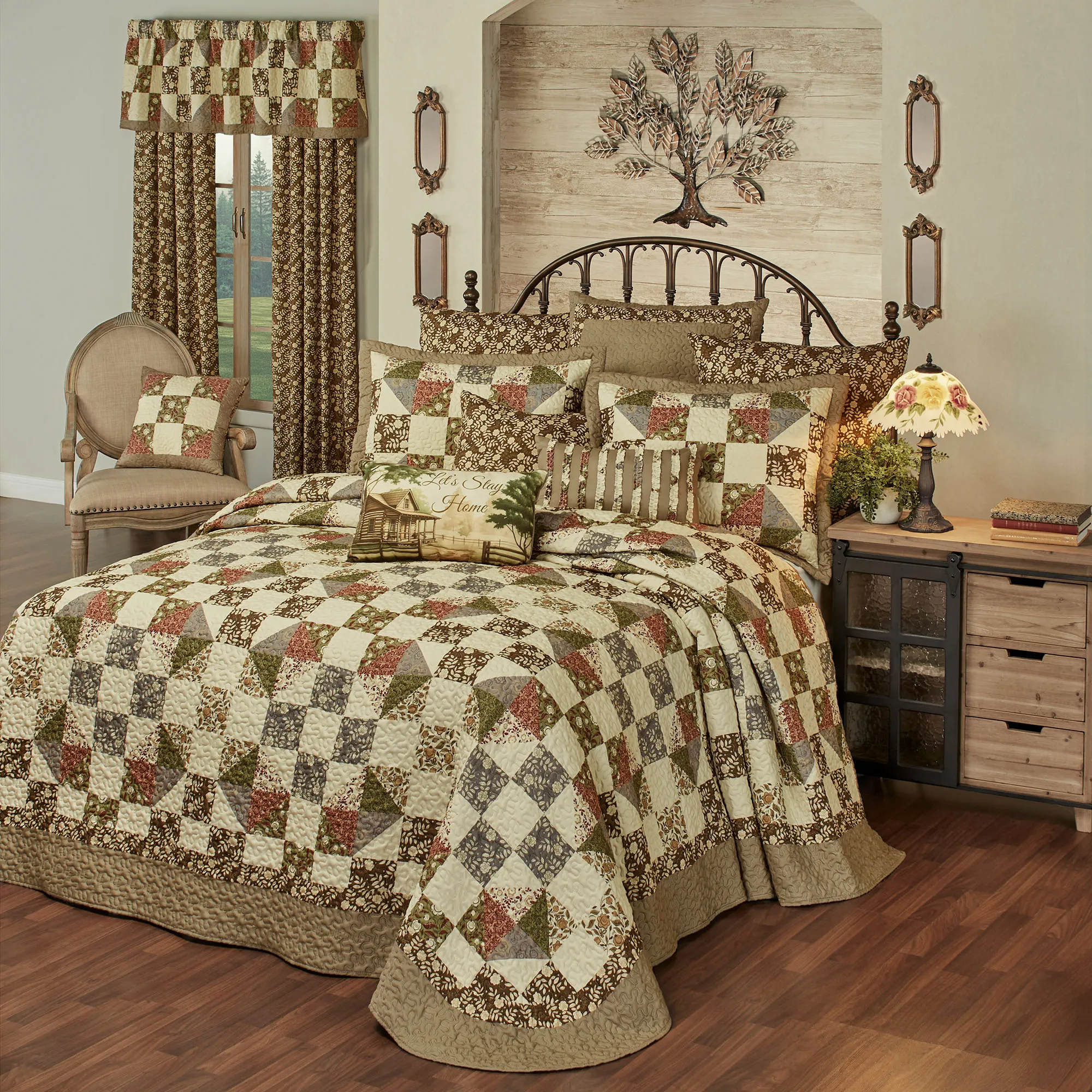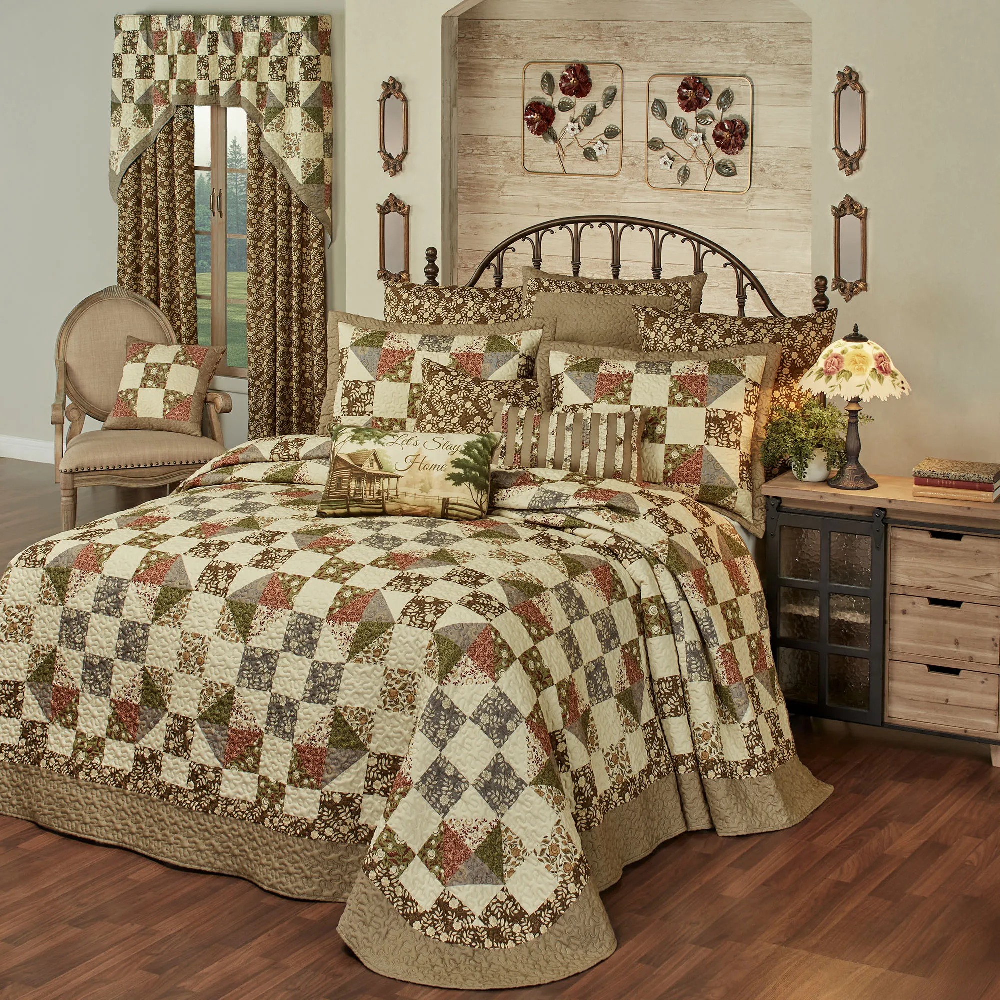 Pillows: Spot clean. Tailored Square is pieced with a taupe frame and reverses to leafy florals. Tailored Rectangle is taupe with coordinating random-cut ruched ruffles. Piped Rectangle reads "Let's Stay Home" with a picturesque cabin view.