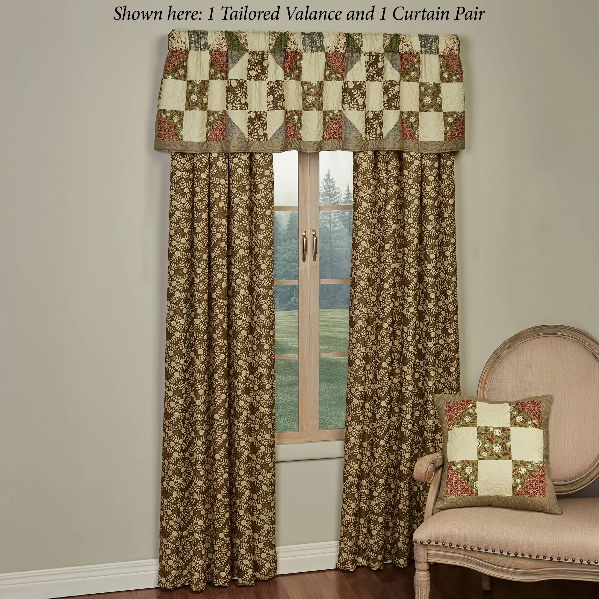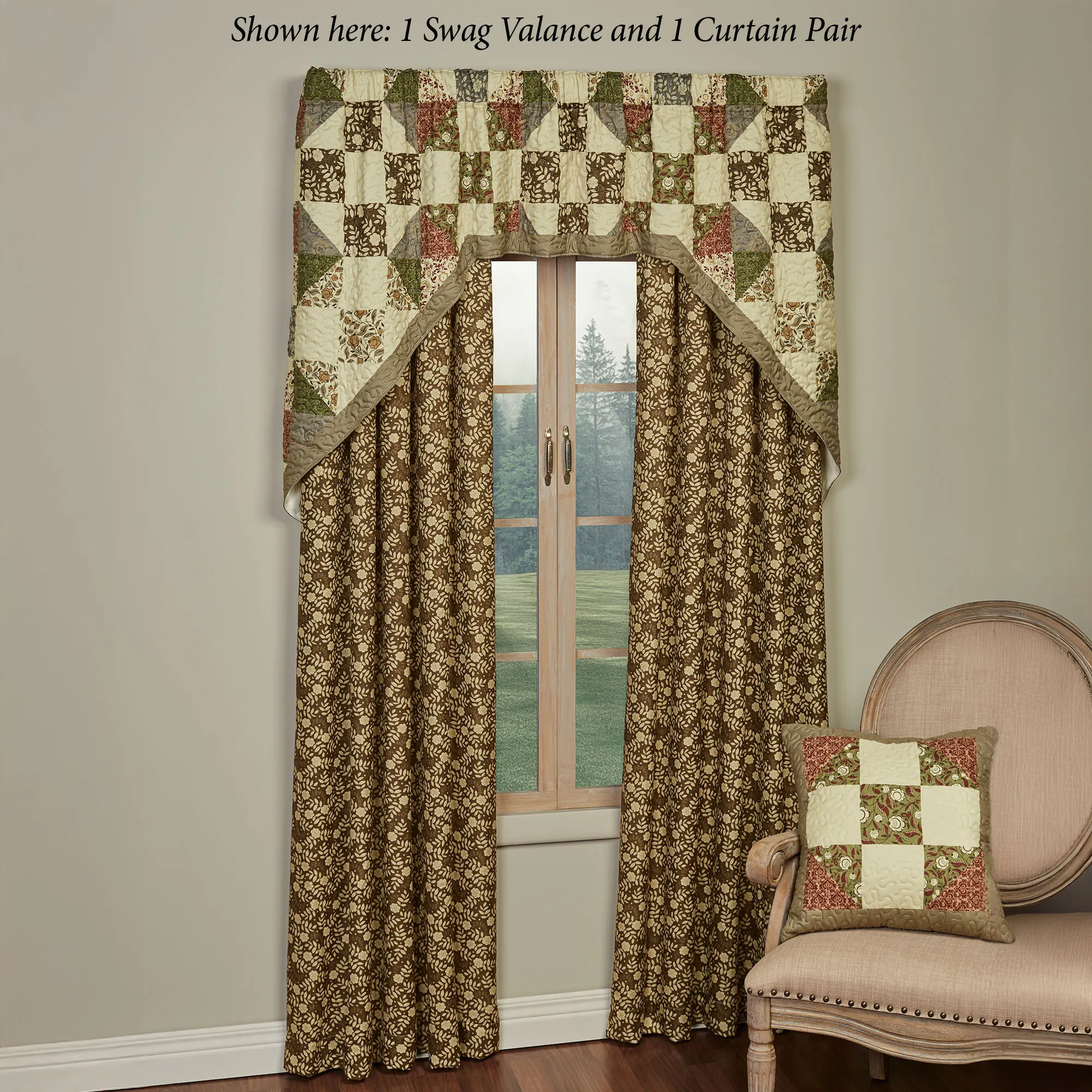 Lined Window Treatments have tailored edges and 3" rod pockets. Curtain Pair has leafy florals and includes tiebacks. Swag Valance has a taupe bottom edge. Tailored Valance has a taupe bottom edge.