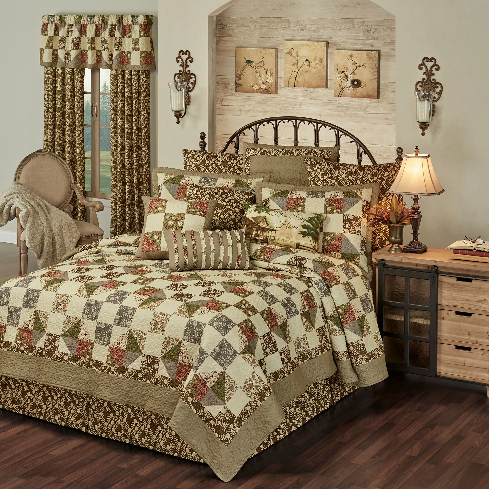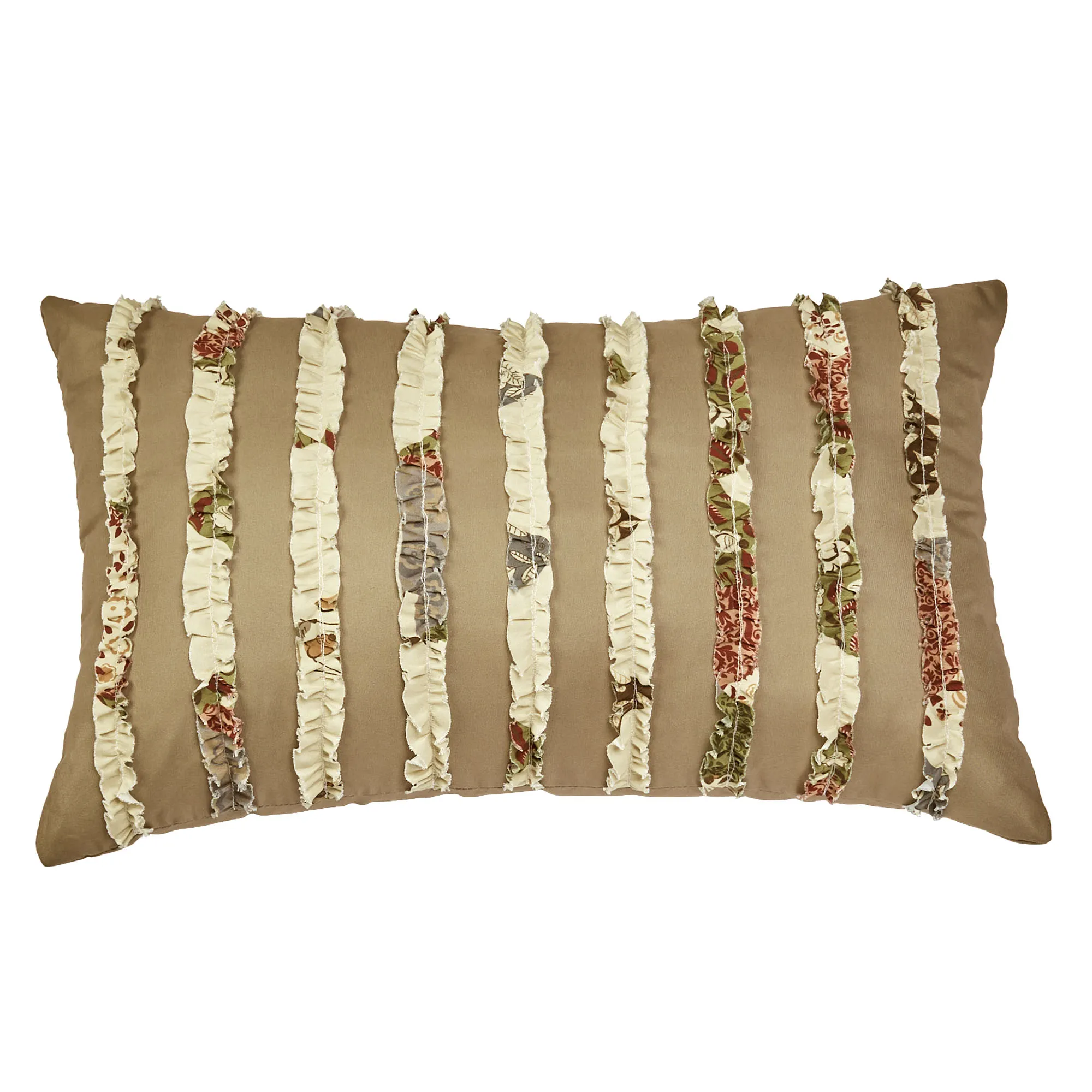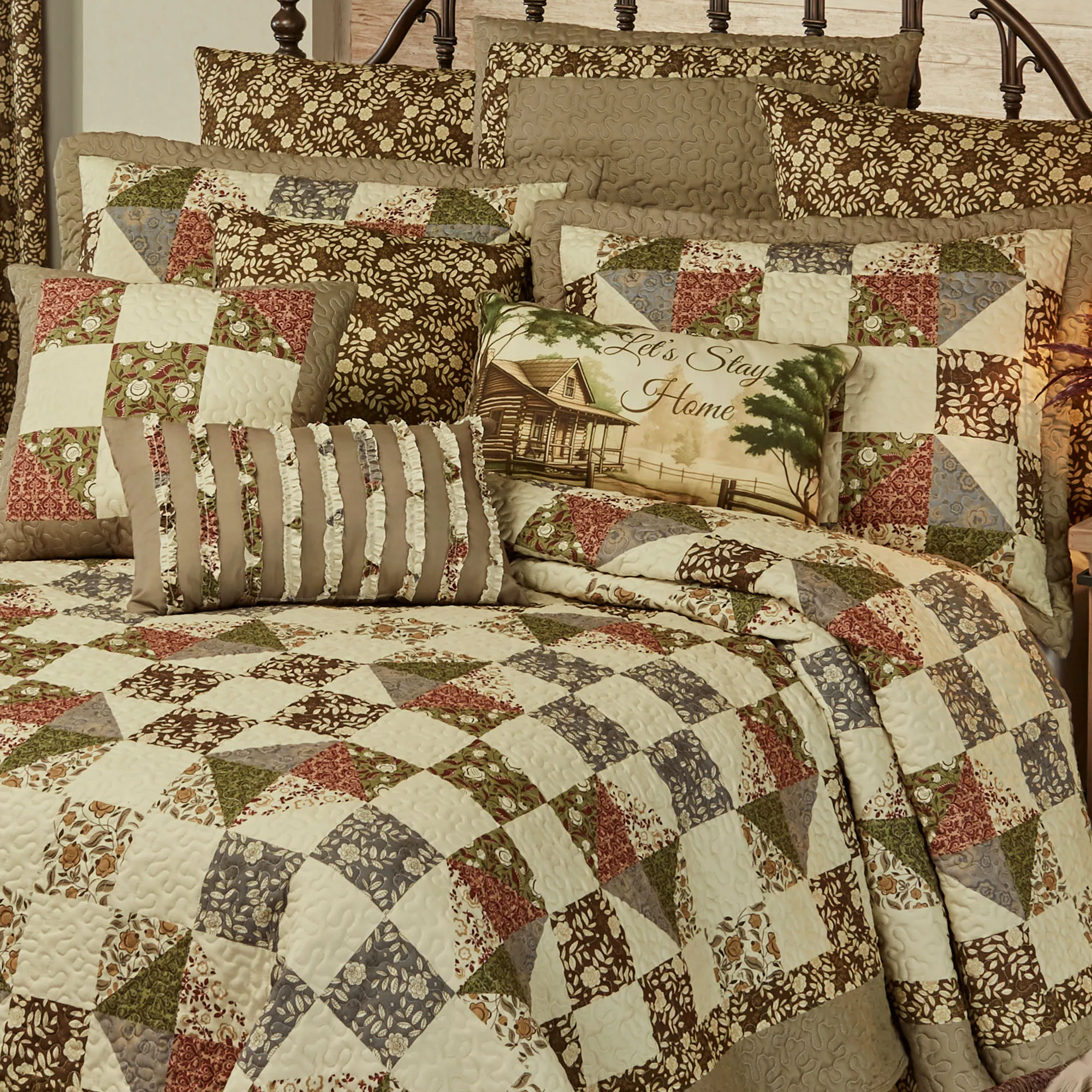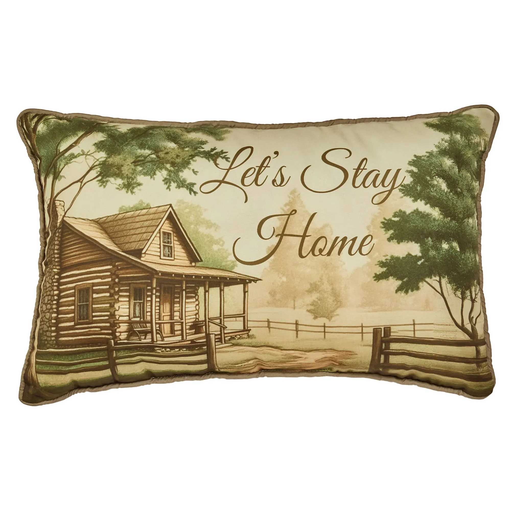 Pillows: Spot clean. Tailored Square is pieced with a taupe frame and reverses to leafy florals. Tailored Rectangle is taupe with coordinating random-cut ruched ruffles. Piped Rectangle reads "Let's Stay Home" with a picturesque cabin view.
