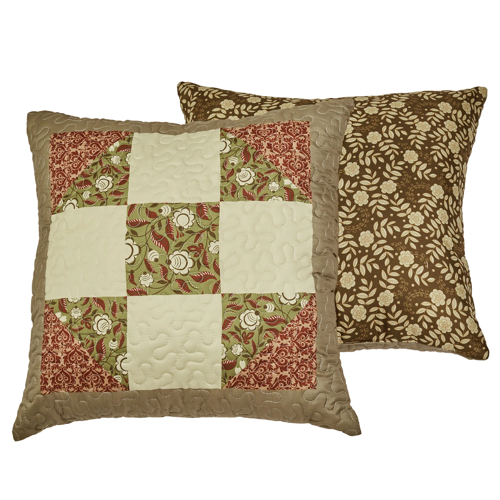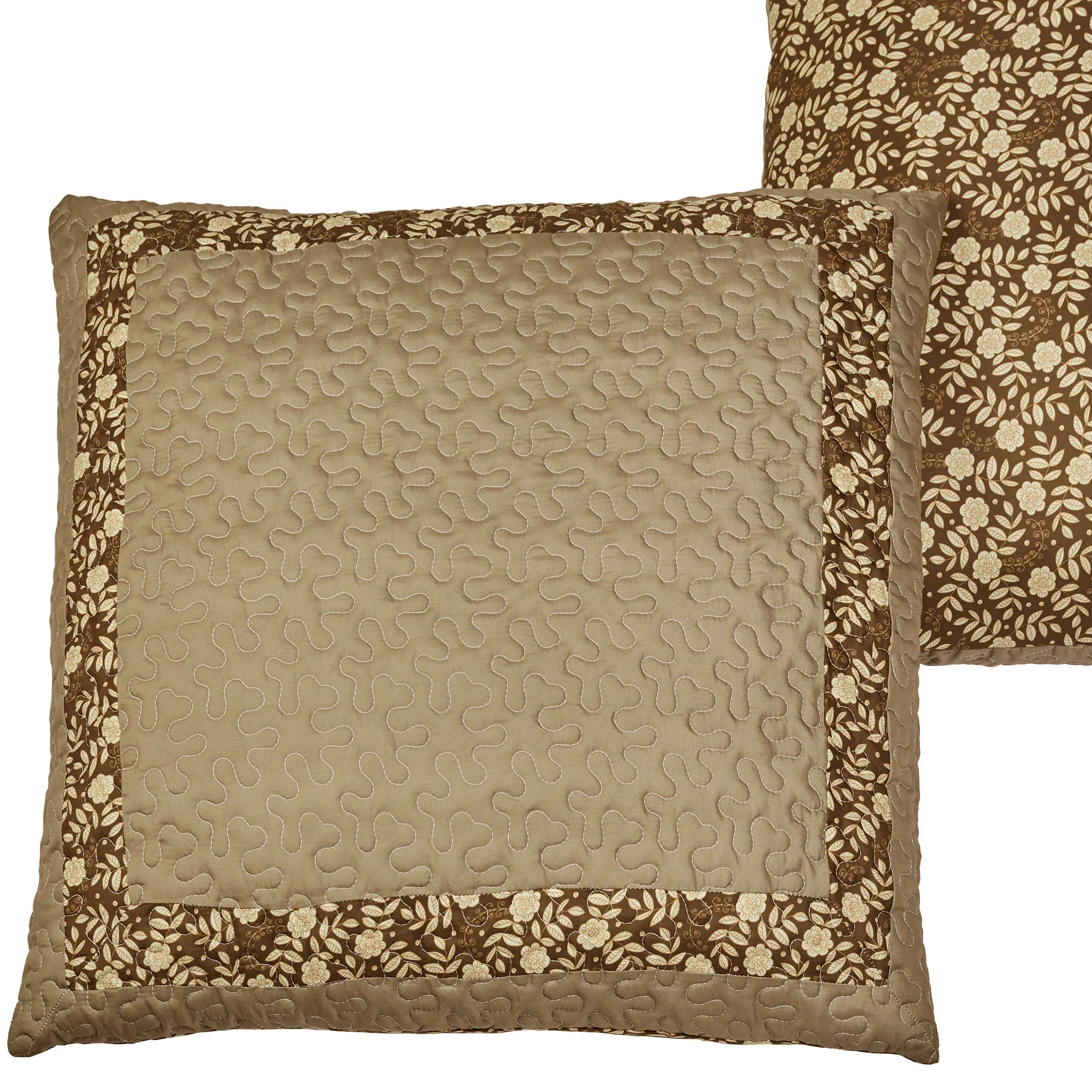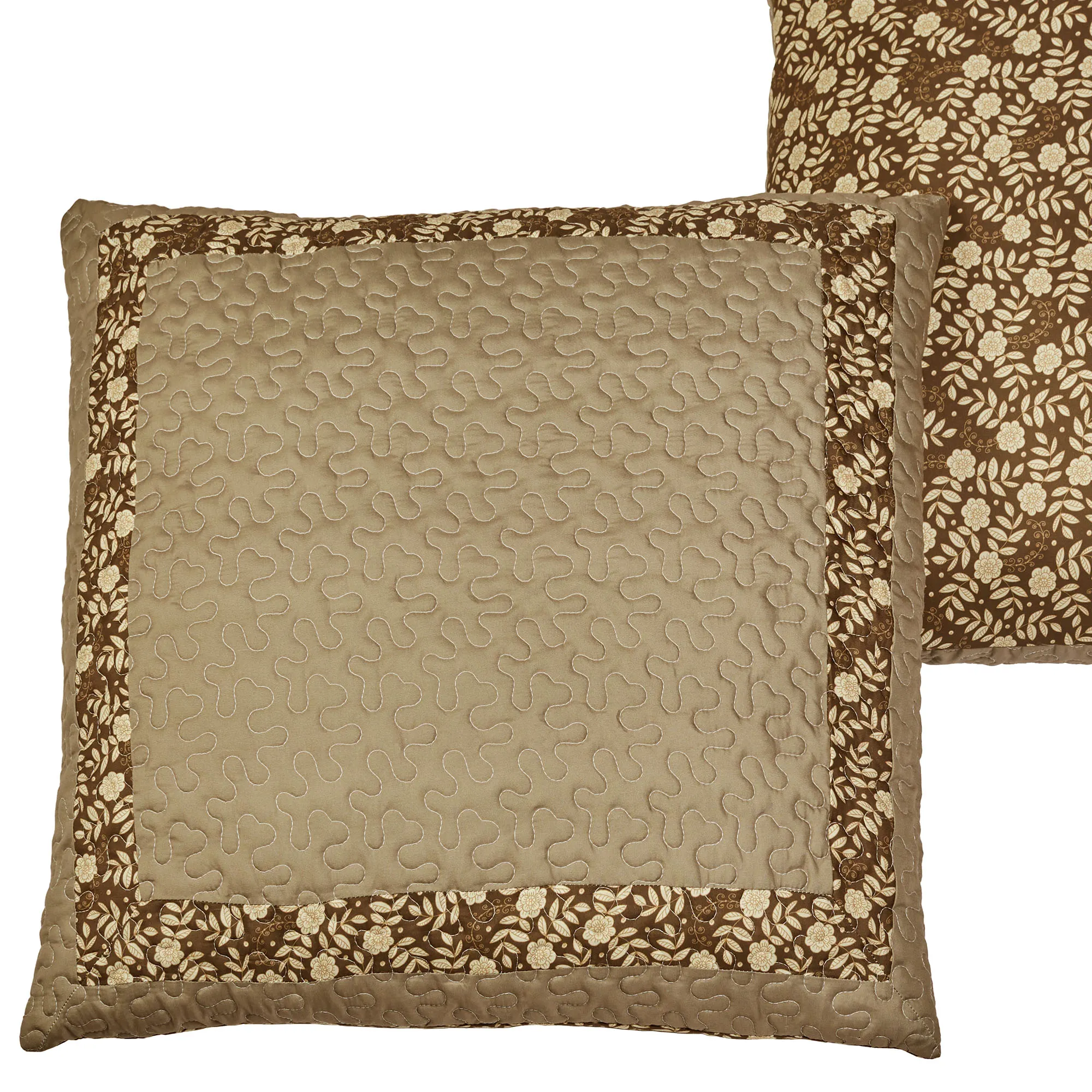 European Sham is taupe pieced with a leafy floral accent border and tailored edges; reverses to all-over leafy florals; zipper closure.