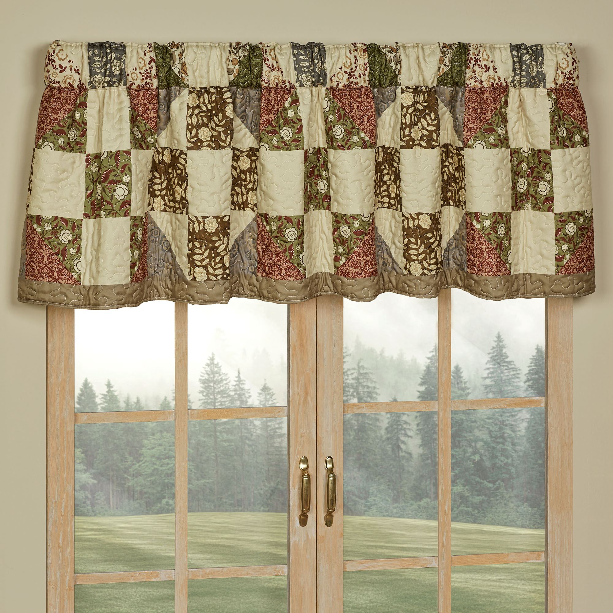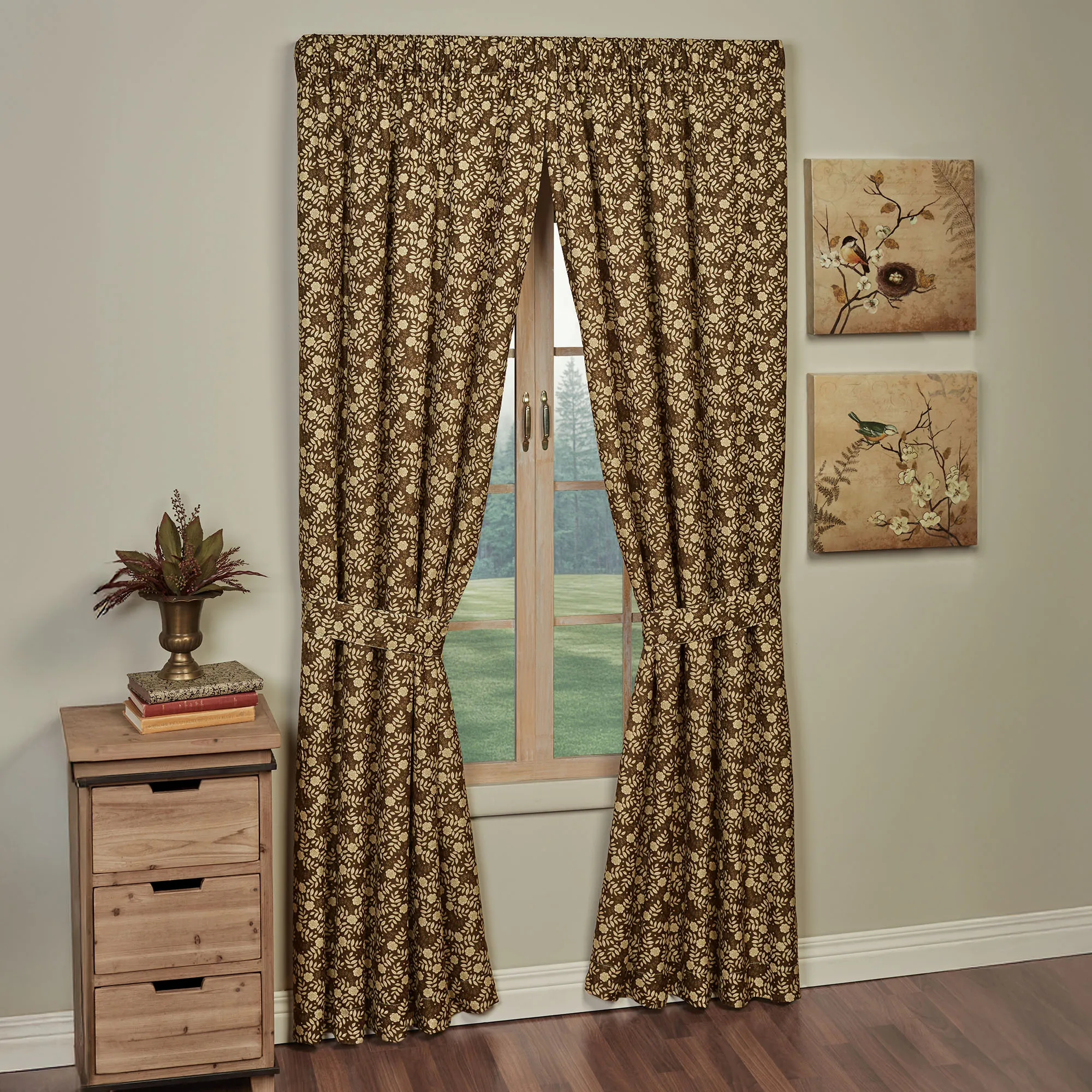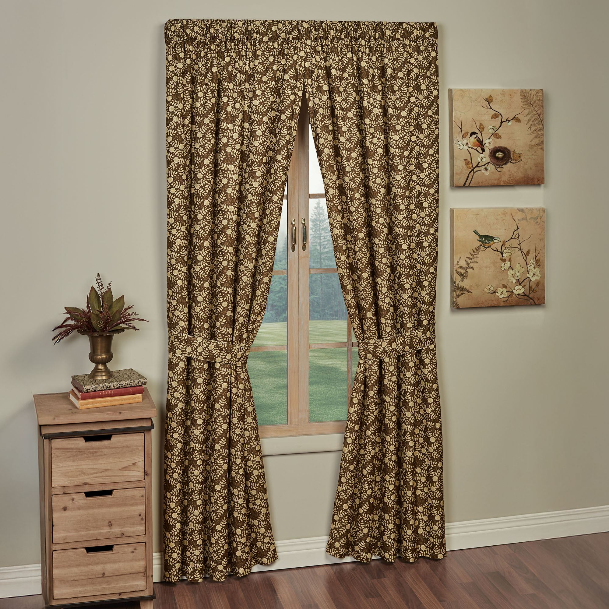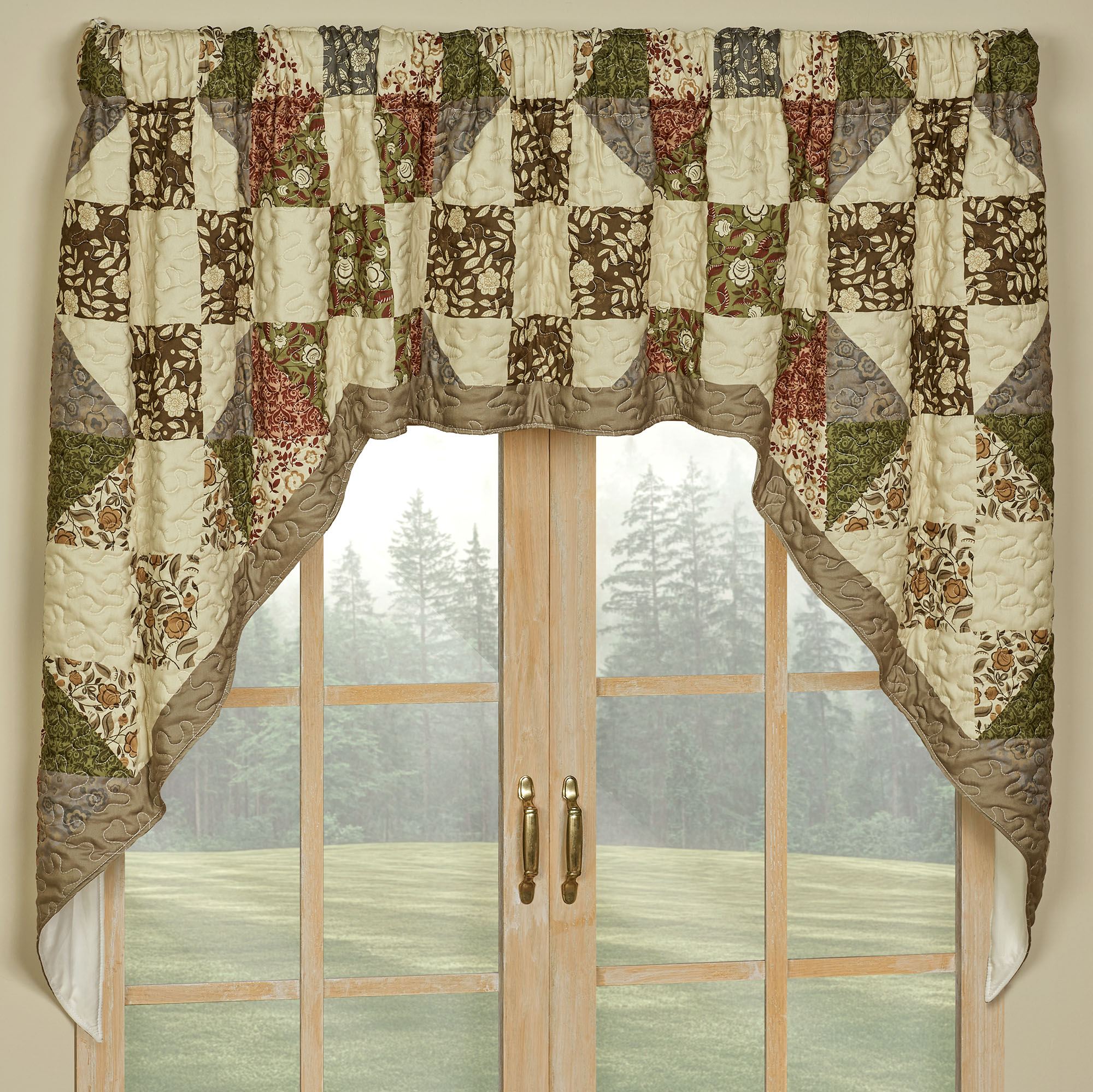 Lined Window Treatments have tailored edges and 3" rod pockets. Curtain Pair has leafy florals and includes tiebacks. Swag Valance has a taupe bottom edge. Tailored Valance has a taupe bottom edge.