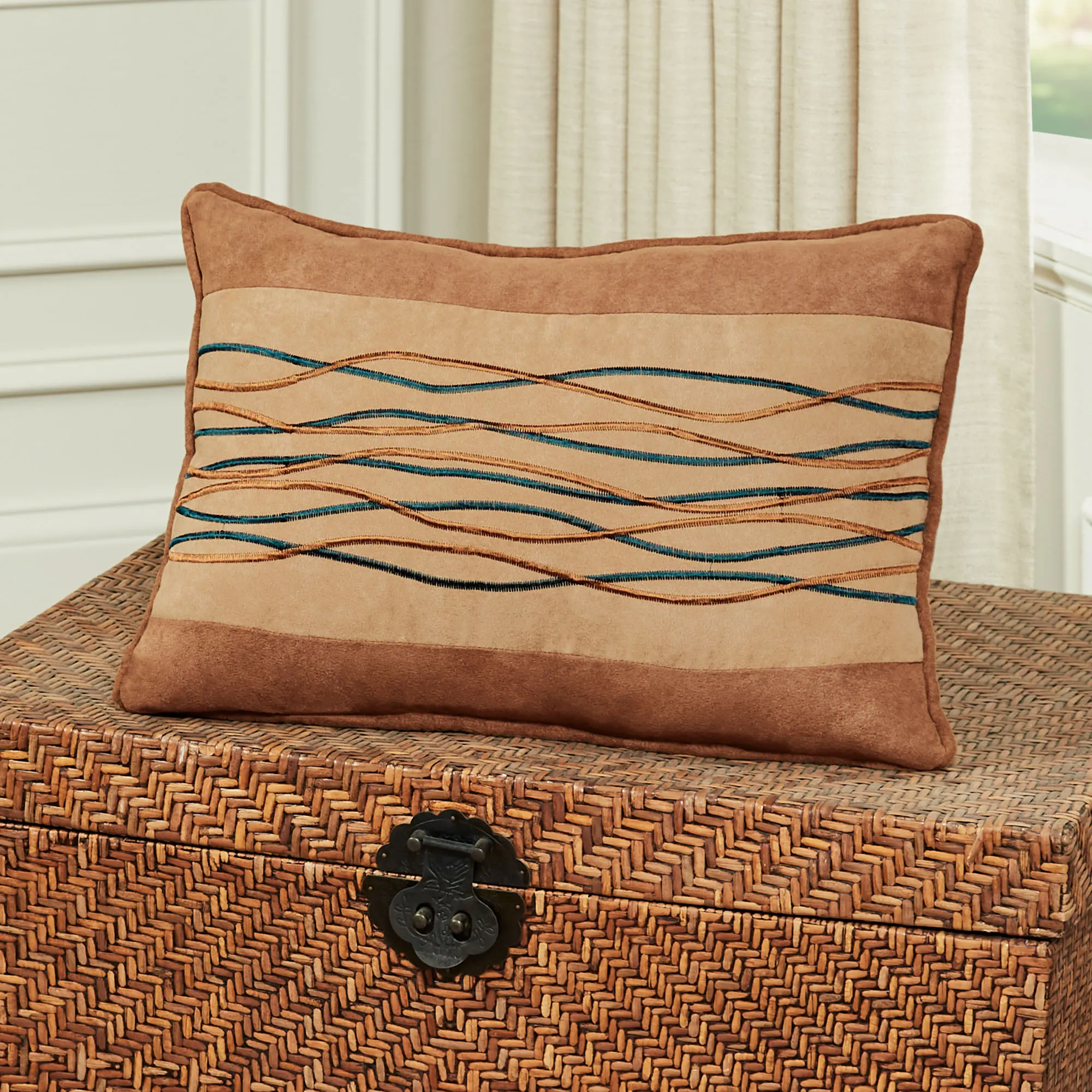 Waves of color give the polyester Oasis Accessories their unique appearance. These accents have a camel faux suede center with sapphire and saddle brown wave embroidery, flanked by saddle brown faux suede. The European Sham has decorative side ties and a French back closure. The piped Rectangle Pillow, 14"x20" is bordered on the top and bottom with faux suede; pillow fill is polyester. Dry clean the European sham. Spot clean the pillow. Imported.