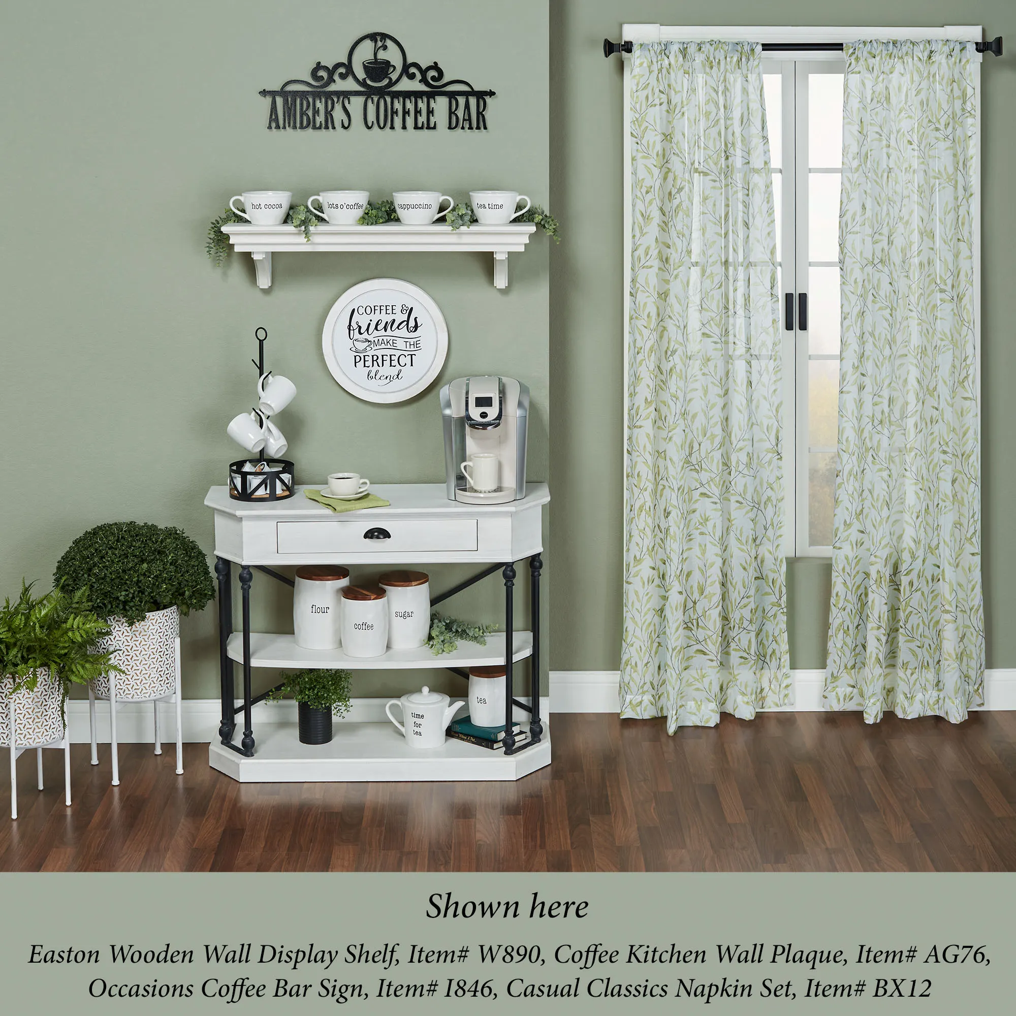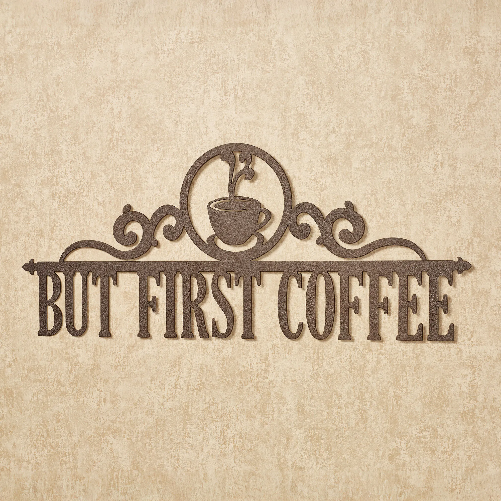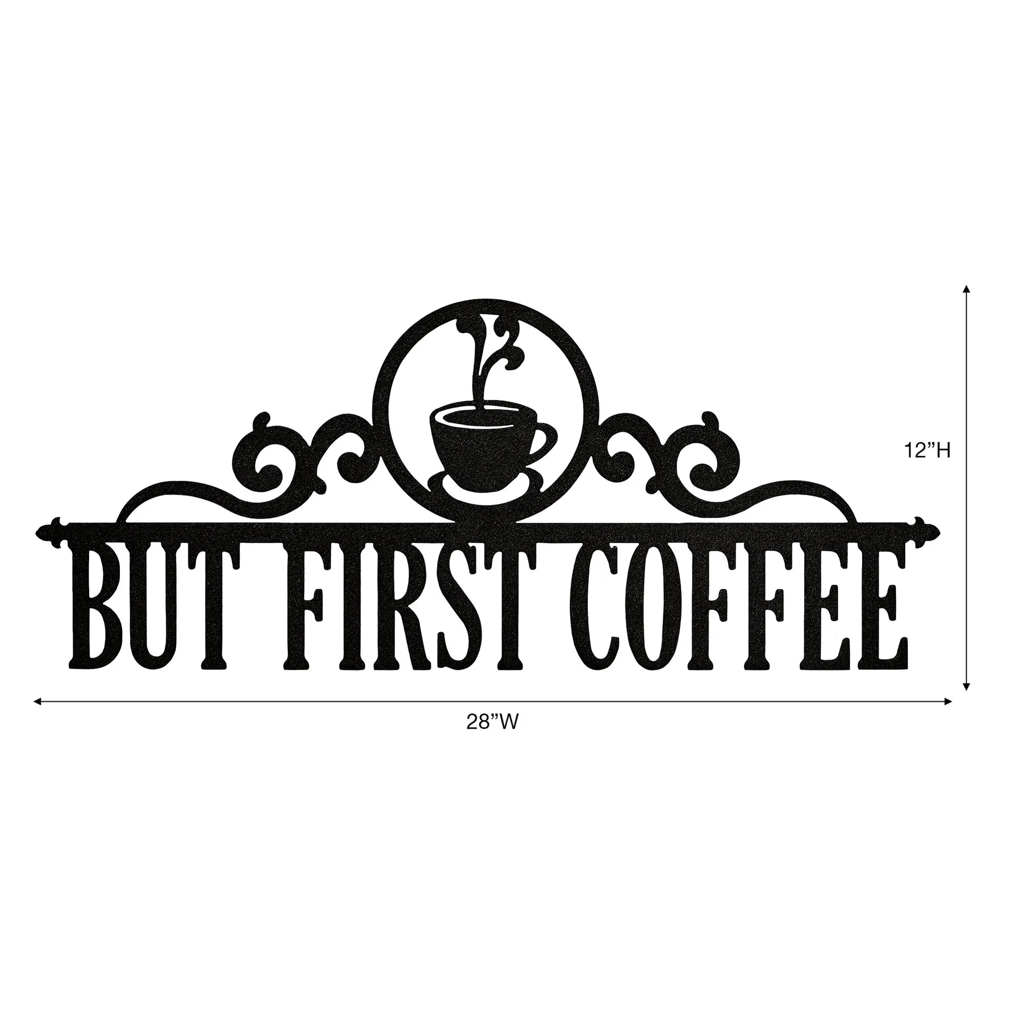 All Occasions deserved to be marked, so commemorate them with a beautiful JasonW Studios(R) artwork. Handcrafted in the USA by skilled craftsmen, this personalized wall art is precision-cut from 14-gauge steel and finished in a UV-, weather-, and tarnish-resistant powder coat to complement your home indoors or outdoors year round. This wall art can be personalized with your chosen phrase (up to 18 letters, numbers, or characters) below a center line, scrolling accents, and circle emblem with a coffee cup. Measures 28"Wx12"H. Specify your phrase, up to 18 letters, numbers, or characters, including spaces. All letters must be UPPERCASE. A hyphen cannot be used. Letters are uppercase with the exception of names with a prefix. In those cases, the prefix will be uppercase and lowercase, like MacDONALD.