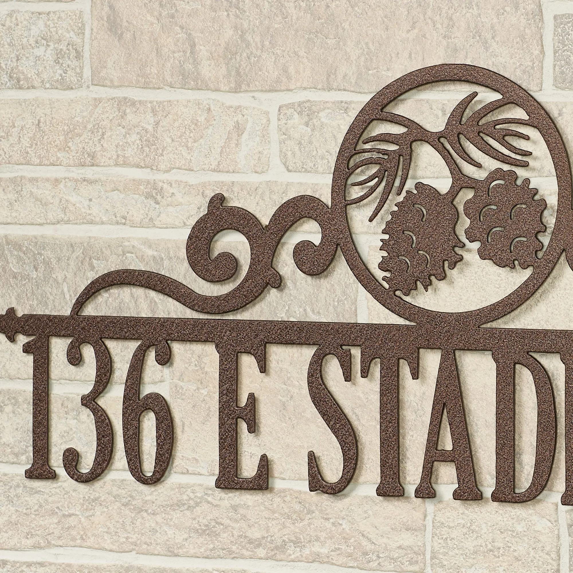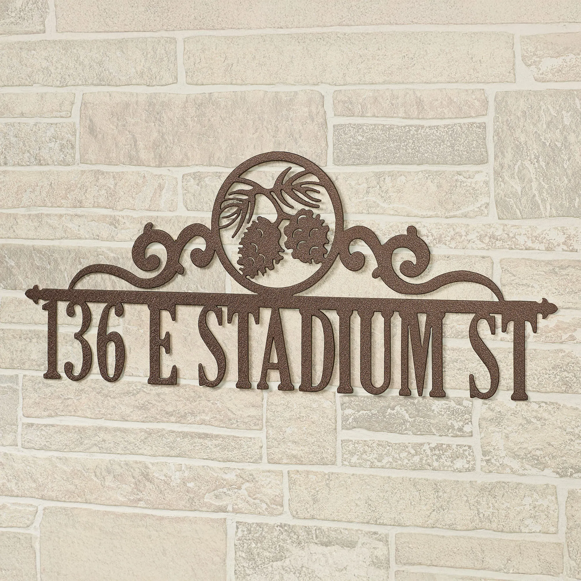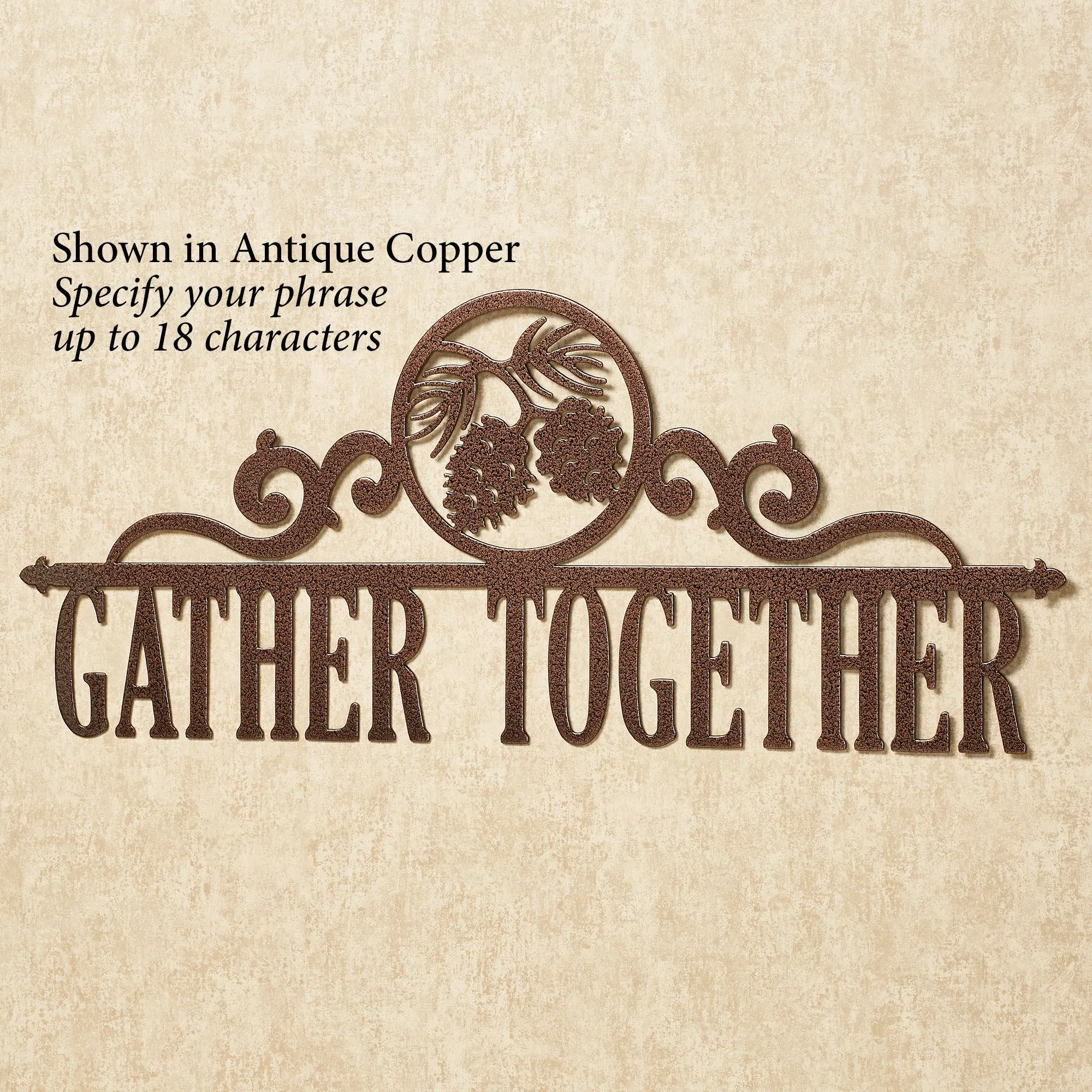 All Occasions deserved to be marked, so commemorate them with a beautiful JasonW Studios(R) artwork. Handcrafted in the USA by skilled craftsmen, this personalized wall art is precision-cut from 14-gauge steel and finished in a UV-, weather-, and tarnish-resistant powder coat to complement your home indoors or outdoors year round. This wall art can be personalized with your chosen phrase (up to 18 letters, numbers, or characters) below a center line, scrolling accents, and circle emblem with pine cones. Measures 28"Wx12"H. Specify your phrase, up to 18 letters, numbers, or characters, including spaces. All letters must be UPPERCASE. A hyphen cannot be used. Letters are uppercase with the exception of names with a prefix. In those cases, the prefix will be uppercase and lowercase, like MacDONALD.