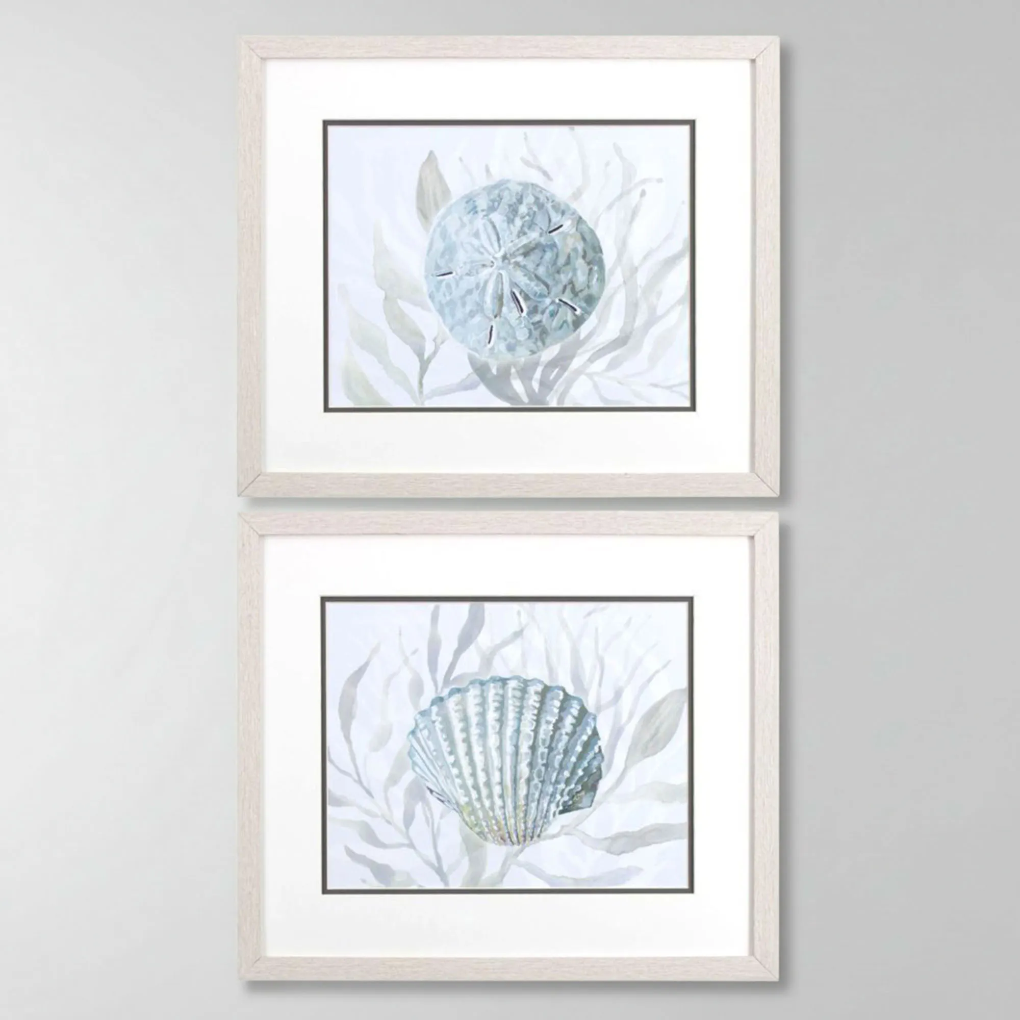 Ocean Beauty hides among the seagrasses and beneath the waves. From acrylic original artwork by the artist Christopher, the coastal prints in this wall art set feature a blue-toned sand dollar and scallop seashell against soft light gray and pale green seagrass silhouettes. Charcoal gray and white mats, glass inserts, and whitewashed polystyrene frames protect each artwork. Overall, each framed wall art print measures 20"Wx1"Dx17"H. Imported/USA.