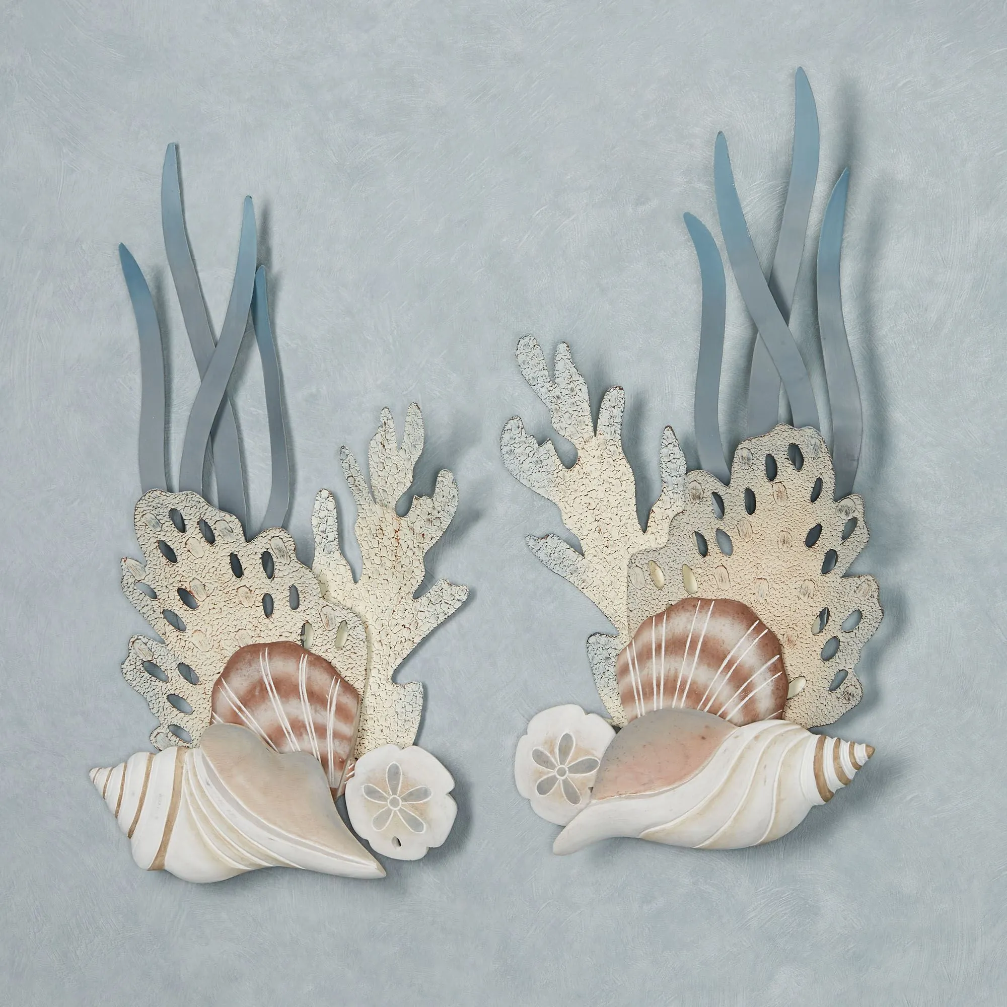 Discover Ocean Bliss with seashells, textured coral, sand dollars, and seagrass. Handcrafted of carved wood and metal, this coastal wall art set is by Joanne Ferrara and has handpainted natural hues with hints of blue. May be used indoors or outdoors in a covered area. Each measures 13.5"Wx3"Dx24"H.