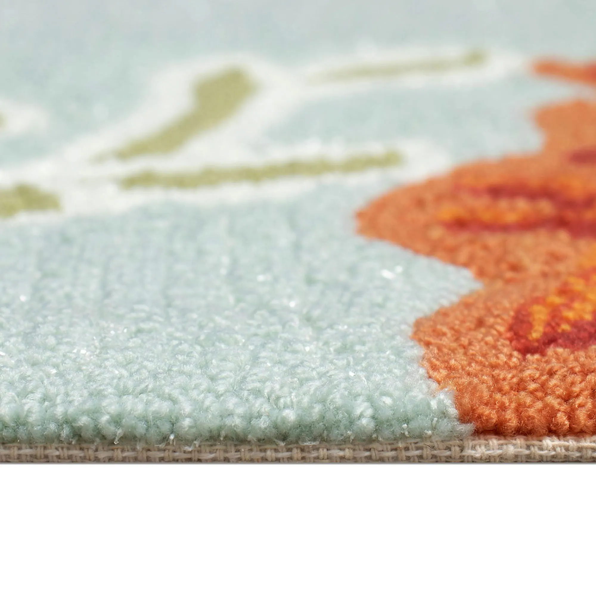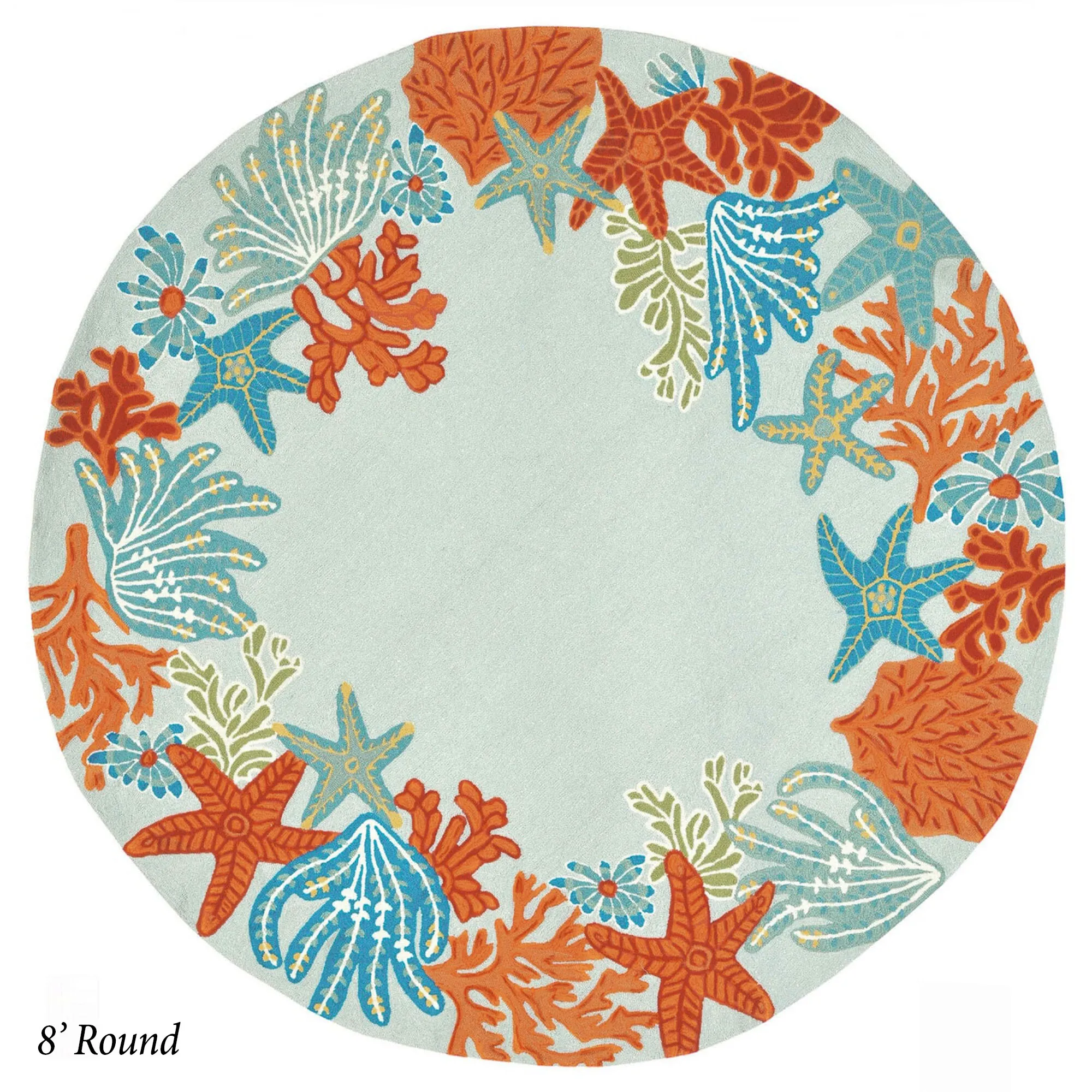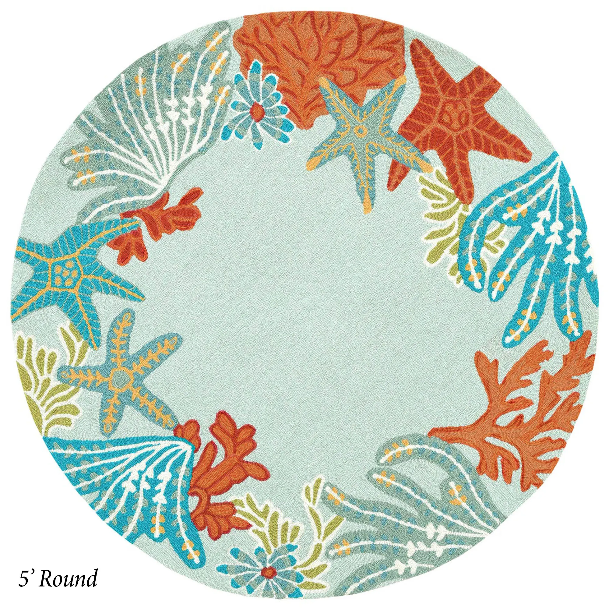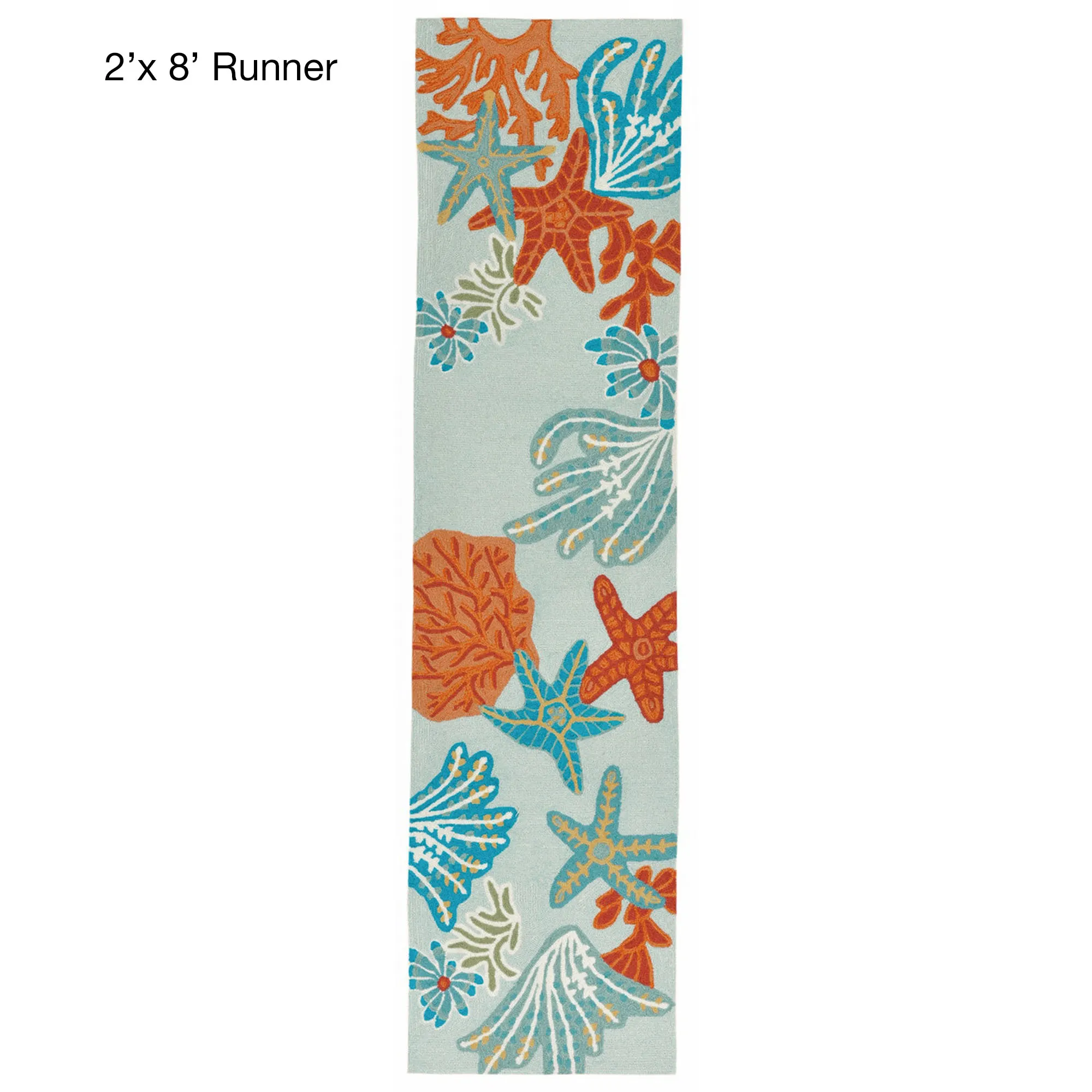 Turn your home into a true Ocean Scene with this perfectly themed indoor/outdoor rug. The hand-tufted, .5" thick, polypropylene/polyester-blend rug features Everywear(TM) durability to accent your home indoors or outdoors. Accented with shiny glistening fibers, the design features coral, starfish, and seaweed in hues of peridot, scarlet, orange, ivory, French blue, steel blue, and gold against a spring green ground. Do not expose this rug to freezing temperatures. Spot clean and rinse with a garden hose; for stubborn stains, we recommend professional cleaning by a rug cleaner. Imported.
