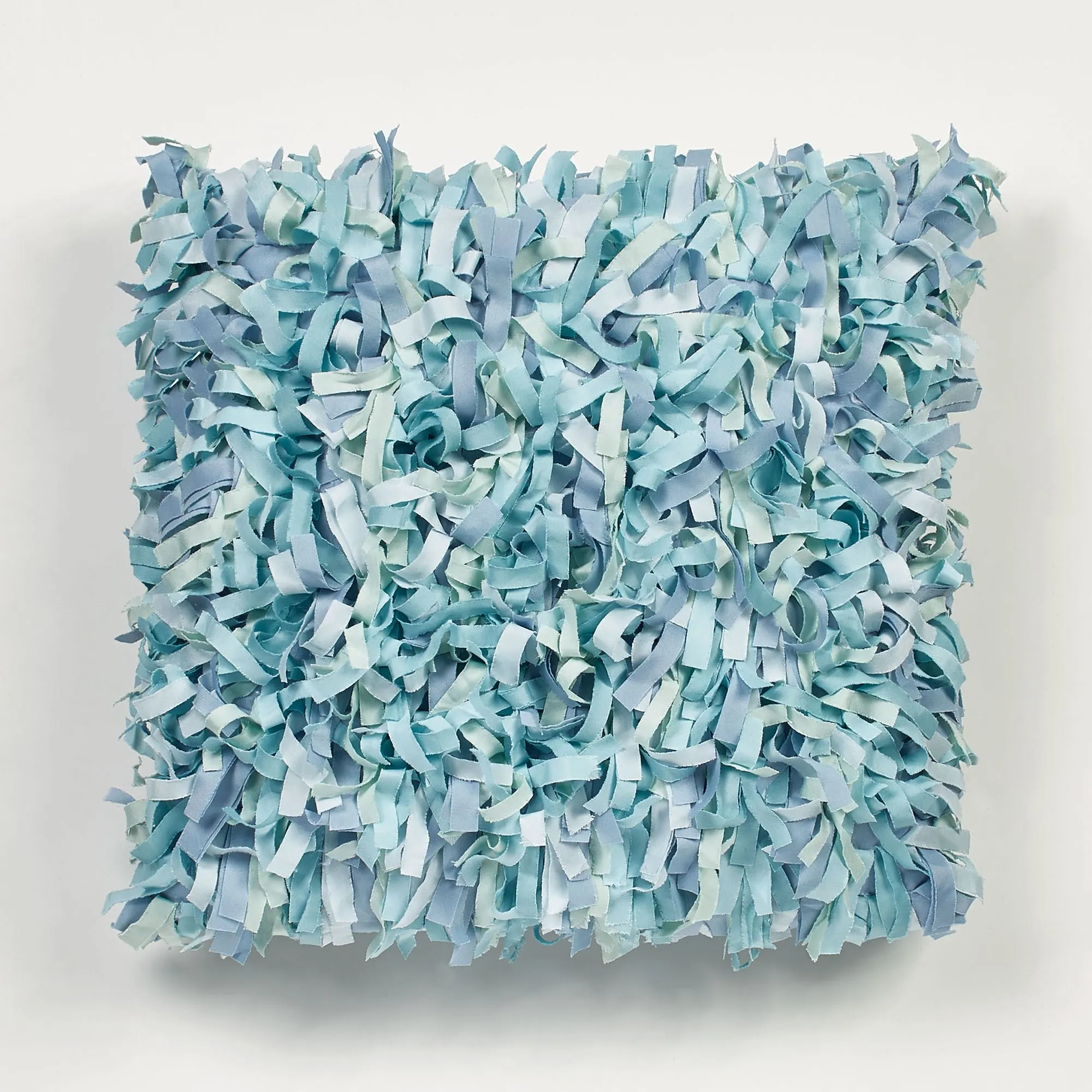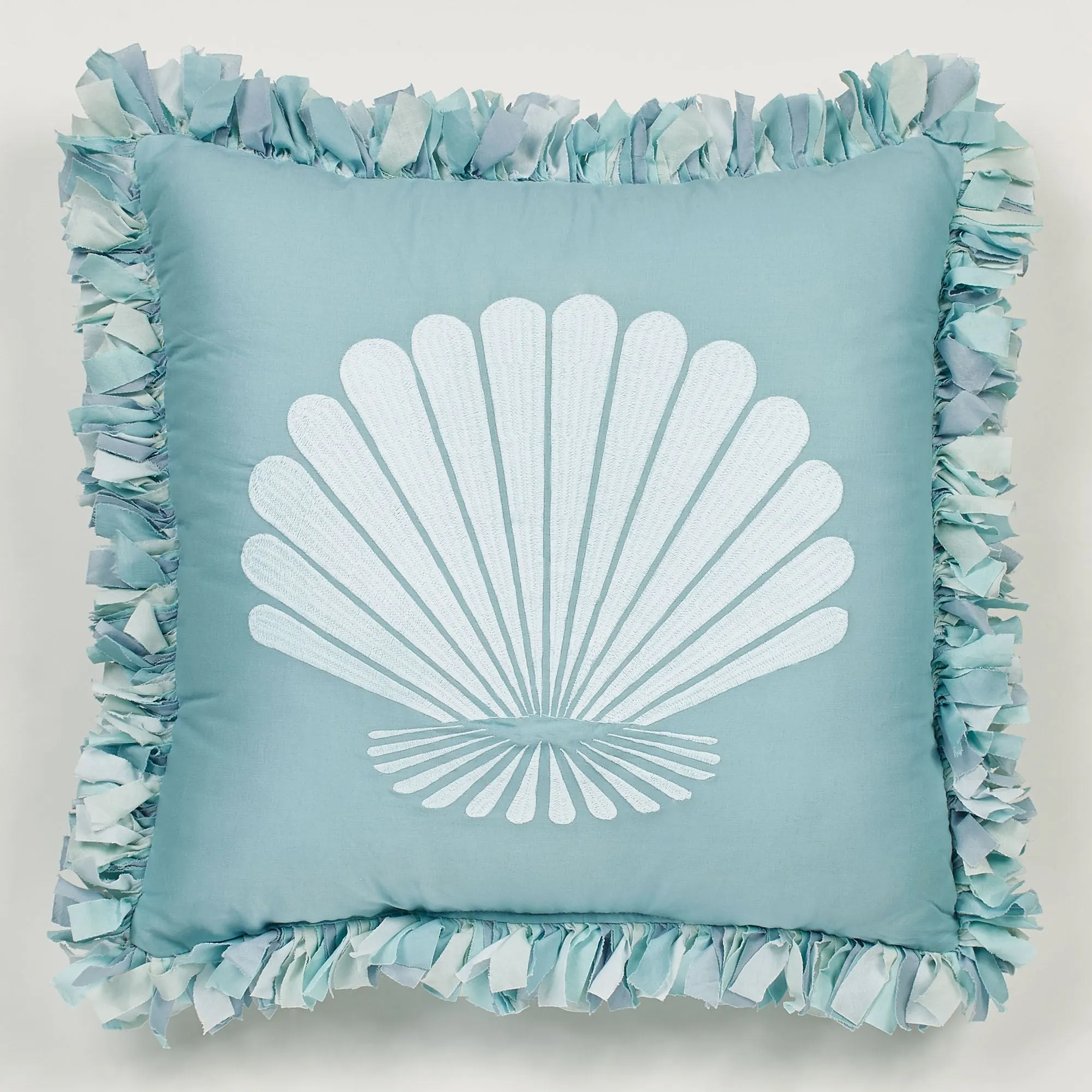 Pillows: Spot clean. Tailored Rectangle has waves. Embroidered Fringed 18" Square features an embroidered light steel blue shell on aqua with mingled, shaggy fringe edges. Shaggy 16" Square has a multicolored mingled face.