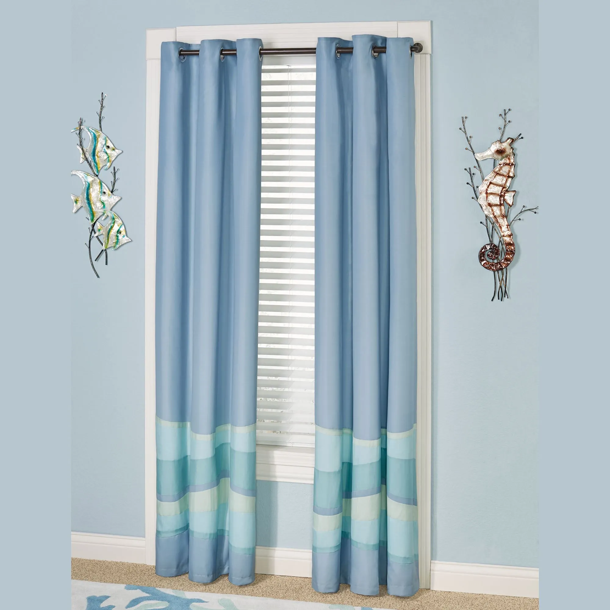 Window Treatments are lined. Grommet Curtains are cerulean blue with waves on the bottom; curtains have 2" dia. brushed nickel grommets. Grommet Valance is scalloped with waves and has 2" dia. brushed nickel grommets. Scalloped Valance is aqua with seashell embroidery, a 3" rod pocket, and mingled shaggy trim on the bottom edge.