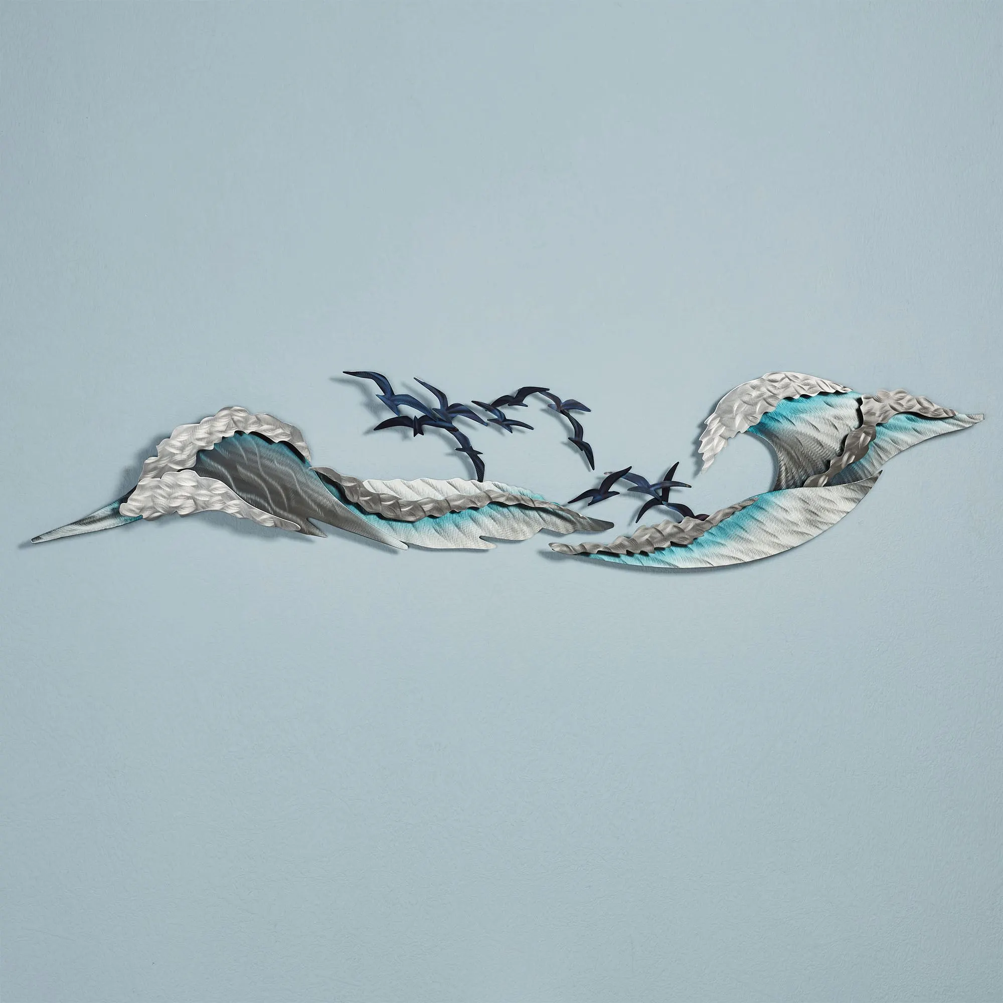 Ocean Waves churn throughout the sea, cresting to meet the gulls flying overhead. Designed by artist M. Malizia, the handcrafted steel and stainless steel wall sculpture set features hand-finished blue and silver surf and dark blue and purple seagulls embellished with a dynamic hand-grinded texture. A clear coat protects the design, making the wall art perfect for your indoor space, covered porch, or enclosed patio. Low wave is 45"Wx13"H. Birds are 12"Wx5"H. Crashing wave is 41"Wx13"H. Waves and birds can be arranged to your liking. Overall, the wall art set measures approx. 82"Wx3"Dx13"H, as shown, and weighs 20 lbs.