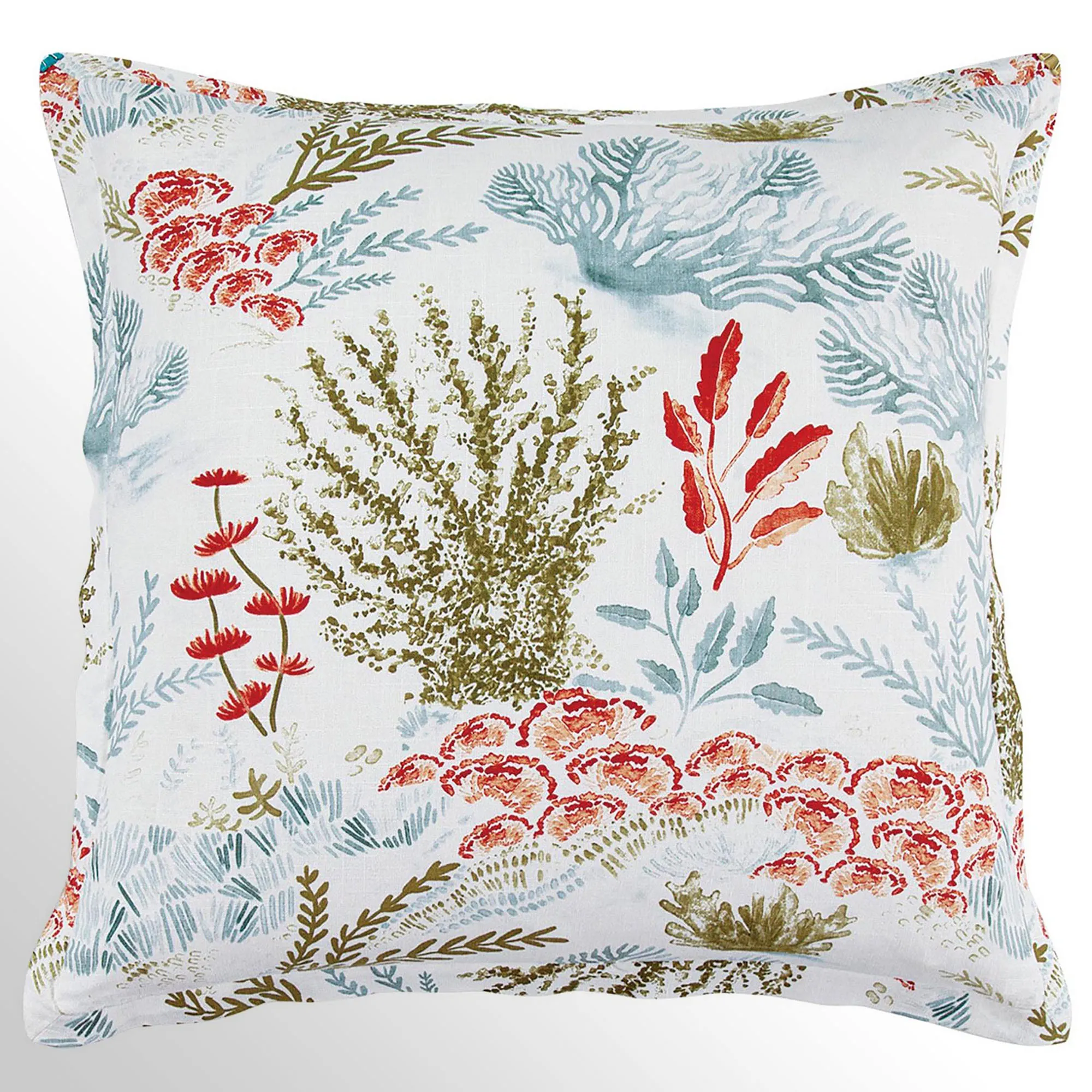 Beneath the seas of Oceania, sea foliage sways with the ocean's swift current. Printed in an artistic style, this crisp white, viscose/linen-blend bedding features beautiful coral, seaweed, sea fan, and seagrass designs in shades of blue, green, red, and coral. The Mini Comforter Set includes a comforter and shams. Oversized comforter has tailored edges and a white cotton back; fill is polyester. Reversible shams have flanged edges; zipper closure. Machine washable. Imported.