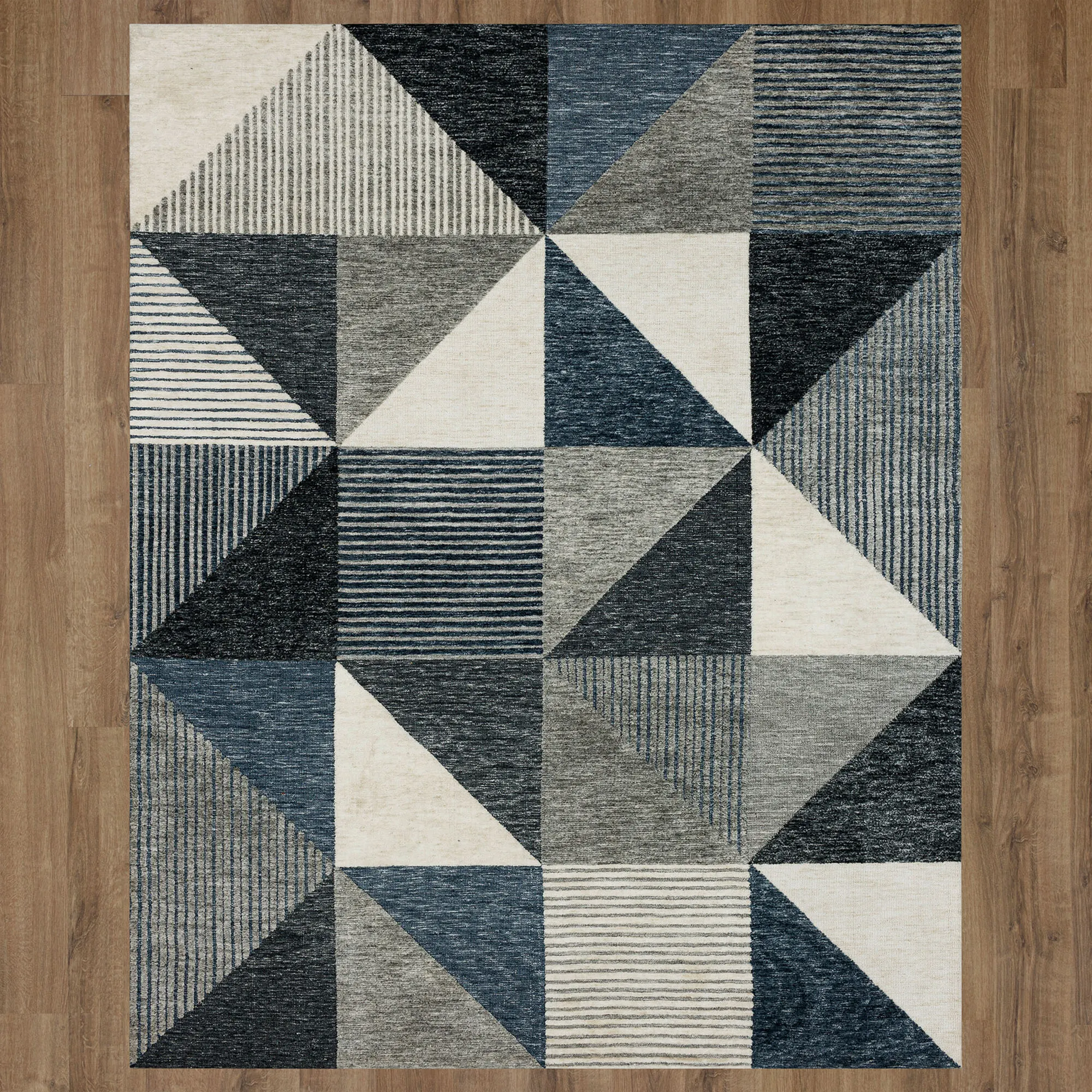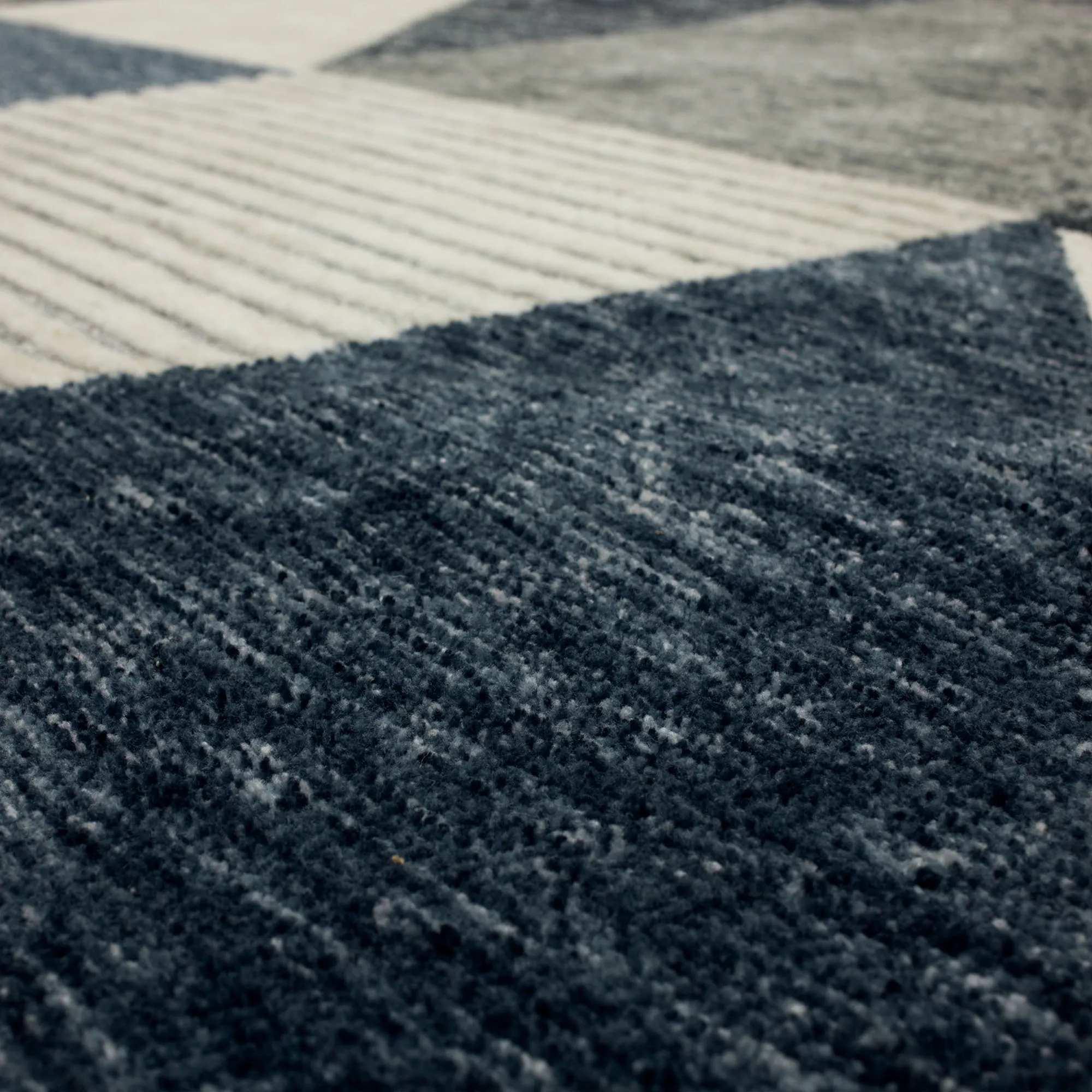 Geometric and abstract patterns artfully enhance the Octavio Blue Rug. The power-loomed, premium polyester area rug, .39" thick, has a textured hi-lo pattern with a cut and loop pile. The blue coloration includes hues of blue, gray, ivory, and black. Backing is cotton canvas. We recommend professional cleaning by a rug cleaner. Imported.