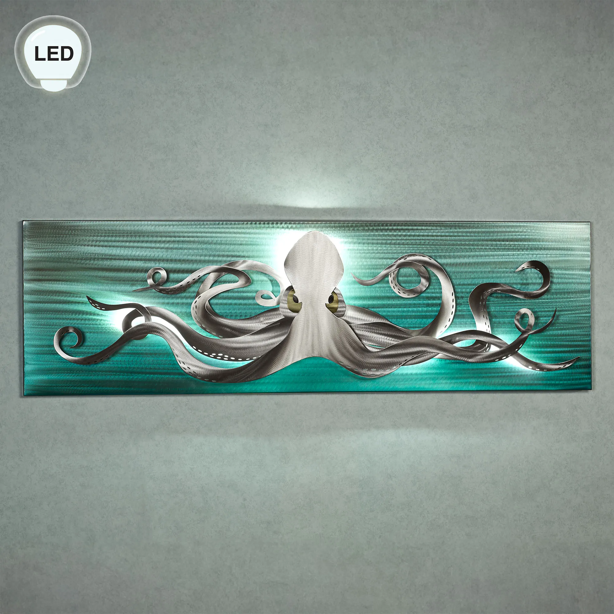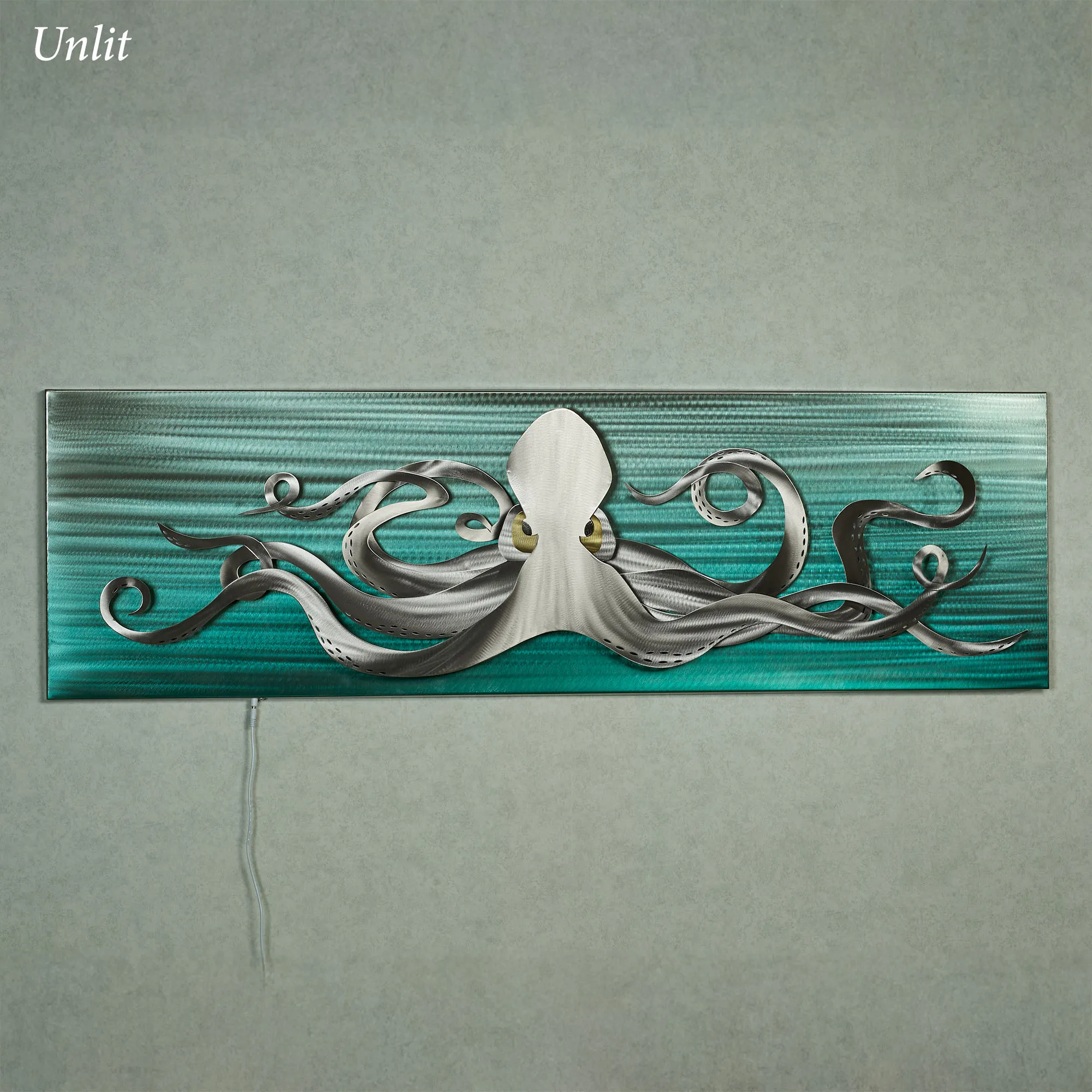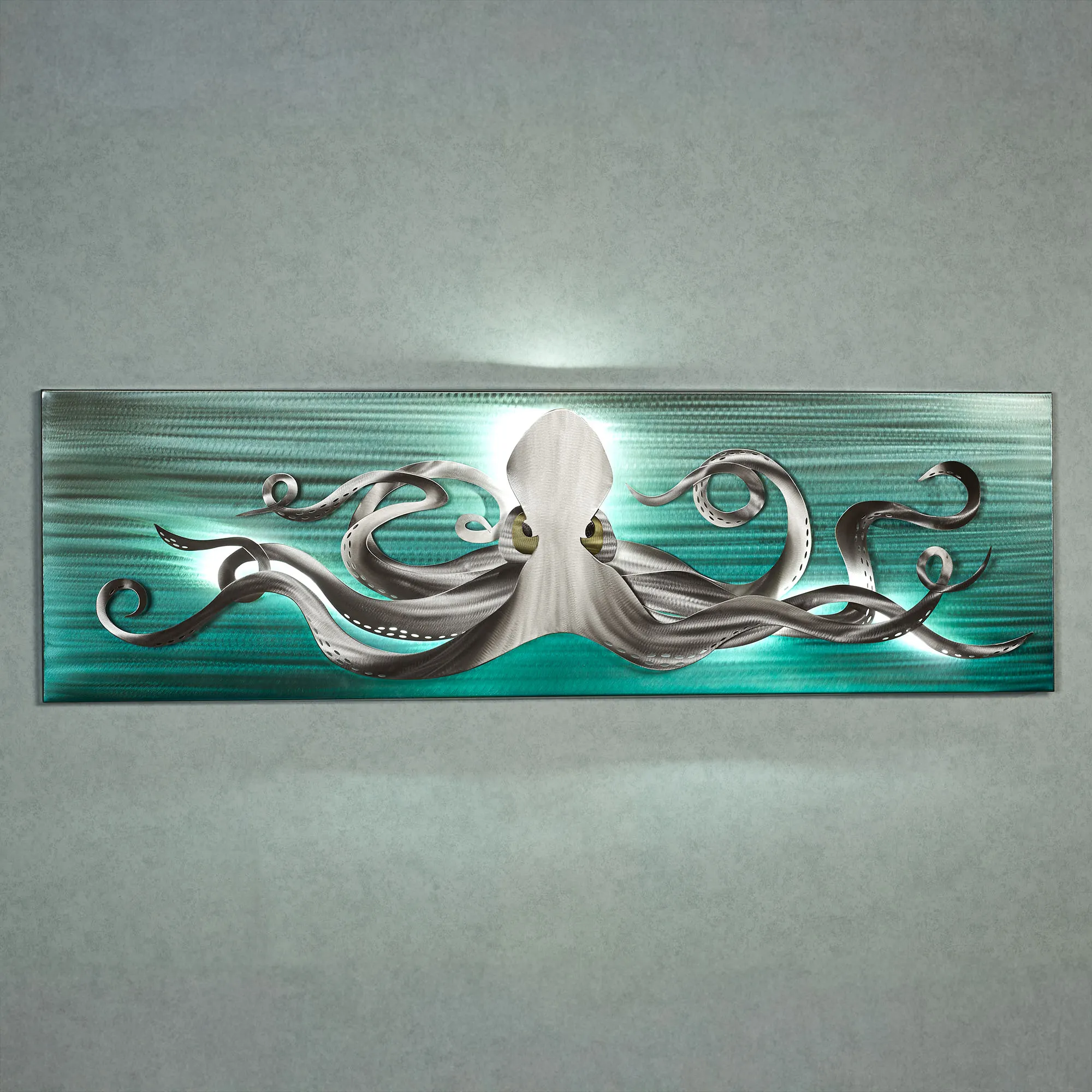 Emerging from the depths of the sea, this Octopus surfaces to showcase unique beauty. Captured by artist M. Malizia, the handcrafted stainless steel wall sculpture features a hand-grinded, hand-finished, and dimensionally layered silver octopus with brilliant detailing. Hidden LED lights help the creature to pop from the hand-dyed turquoise background. UL listed. Operates from an in-line on/off switch with a dimmer; AC adapter is included. Overall, the octopus wall sculpture measures 60"Wx3"Dx18"H and weighs approx. 15 lbs.