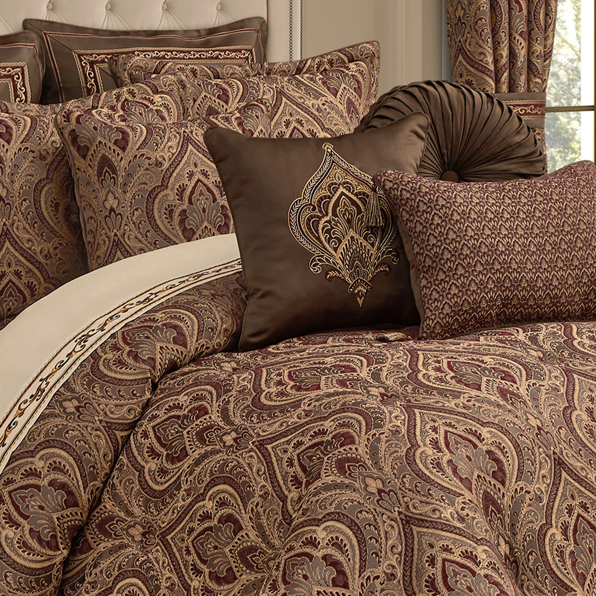 Decorate with the classic air of the Odette Damask Comforter Bedding by Five Queens Court. The jacquard-woven polyester bedding features stately damask in light gold, dark gold, chocolate, and crimson. Oversized comforter has a chocolate polyester back. Bedding fill is polyester. Dry clean only. Imported.