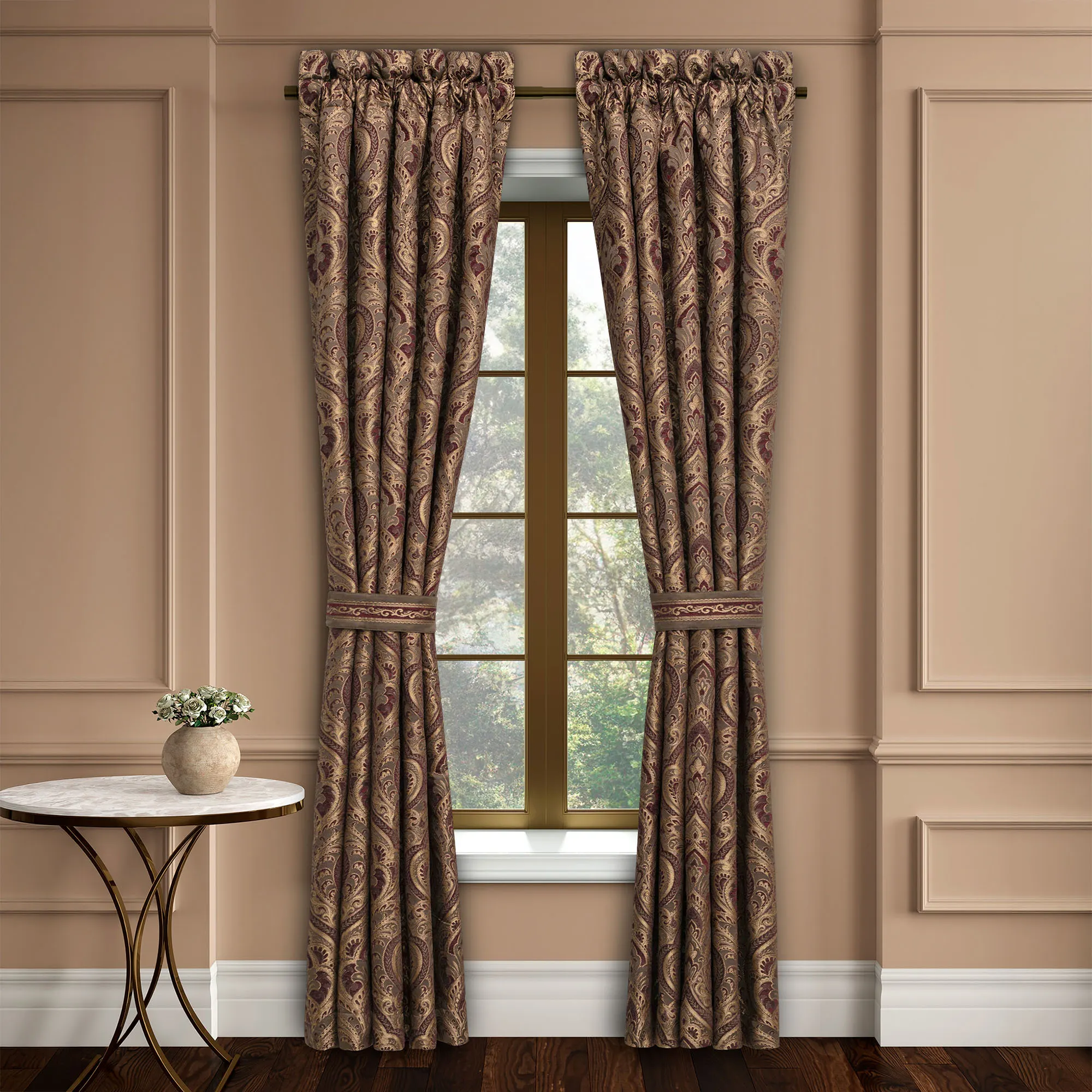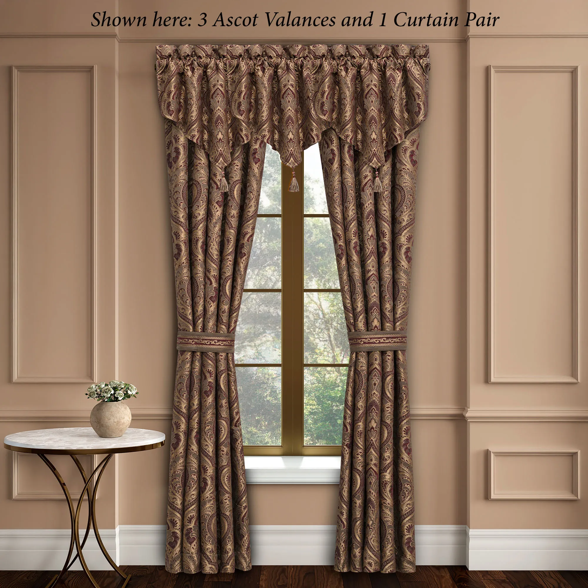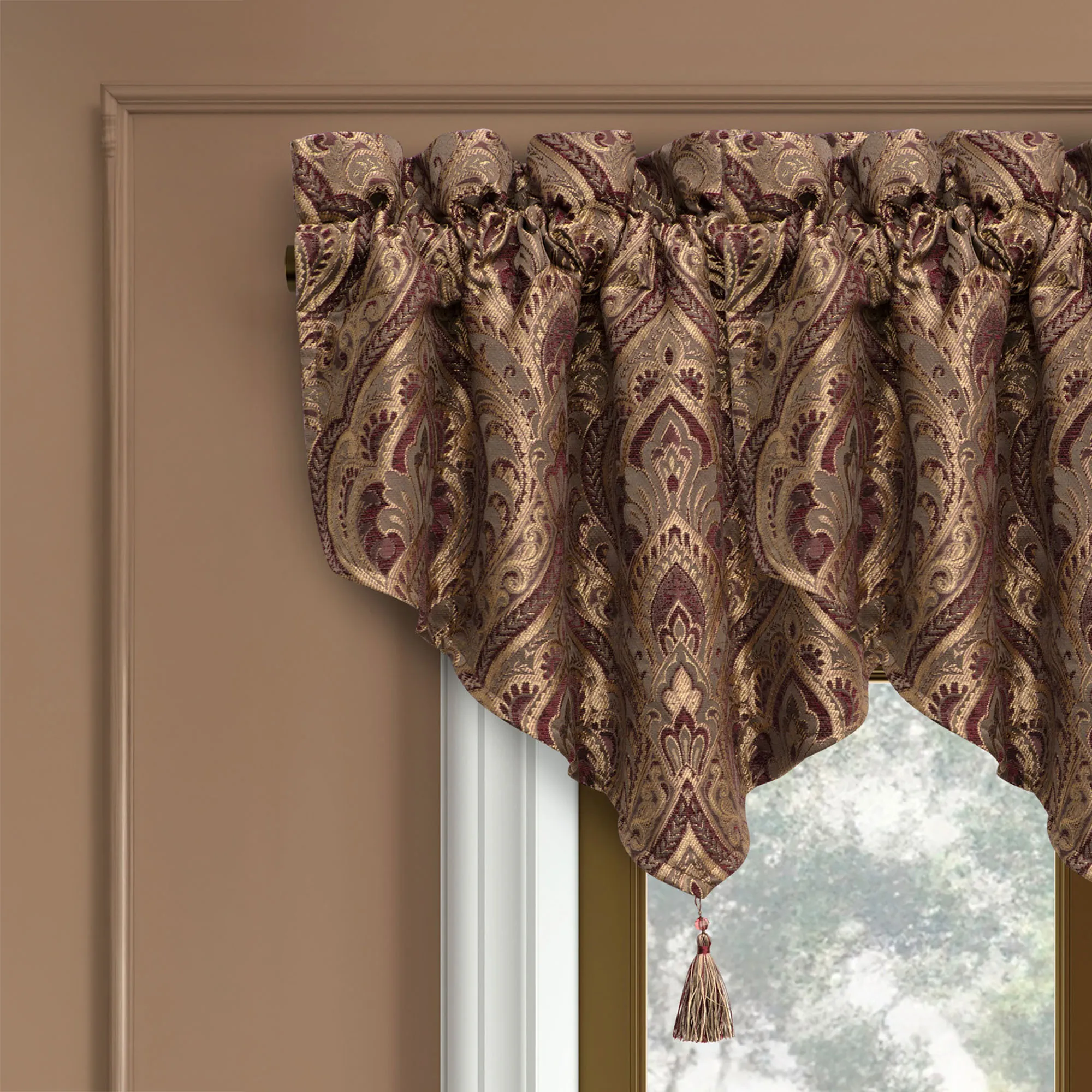 Lined Window Treatments have damask, tailored edges, and 3" rod pockets. Wide Curtain Pair includes tiebacks. Each Ascot Valance has a tassel accent.