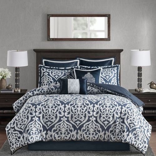 Odette Scroll Damask Midnight Blue 8 pc Comforter Bed Set by Madison Park