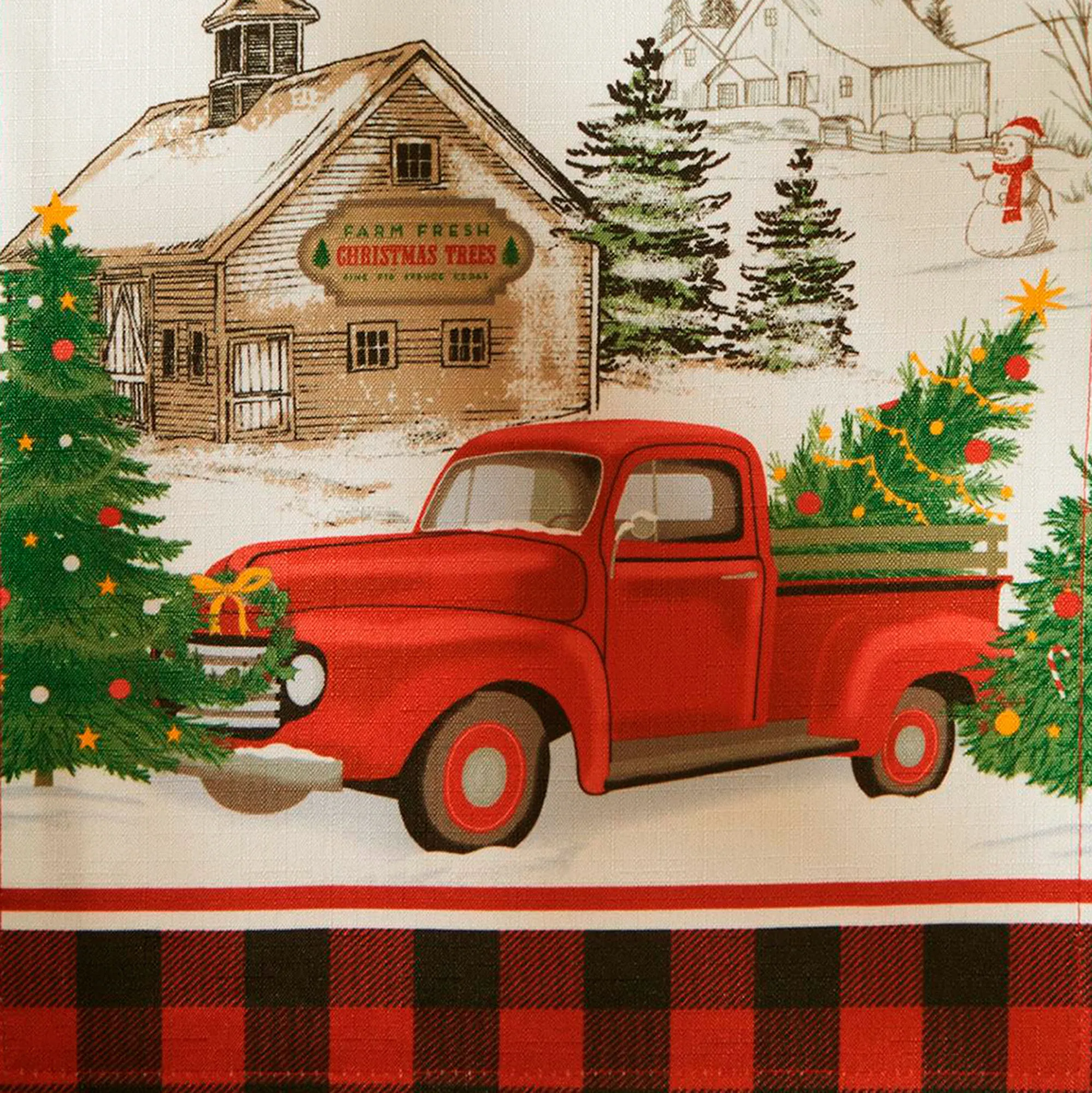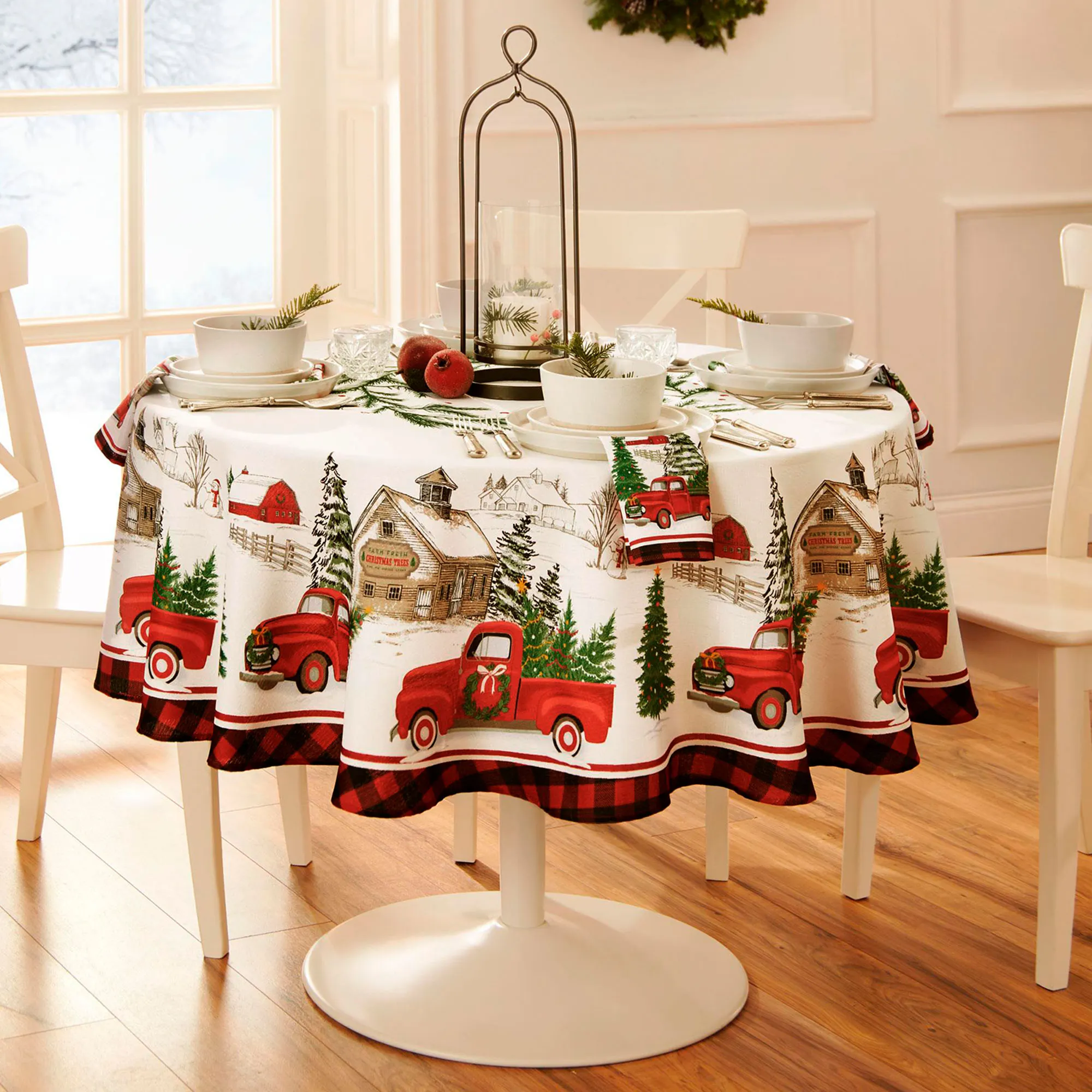 Gather around the holiday table for an Old-Fashioned Christmas. These tailored polyester table linens bring a festive and nostalgic look to any farmhouse dinner table this Christmas season. Table linens features printed snowmen, pine trees, classic red pickup trucks, vintage barns, and a buffalo plaid design. Colors include green, red, soft off-white, and black. Choose Table Runner, Rectangle Tablecloth, Round Tablecloth, Oval Tablecloth, Placemat Set of 4, or Napkin Set of 4. Machine washable. Imported.