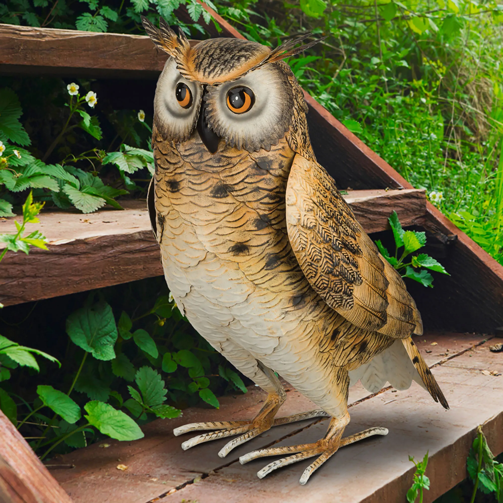 Oliver Owl keeps watch over your indoor or outdoor space year round. With a charming realistic design, the embossed metal sculpture resembles a long-eared owl with iconic ear tufts, detailed wings, textured feathers, and large captivating eyes. Weather- and fade-resistant natural shades of brown, cream, white, and black fill the life-size bird. Overall, the outdoor owl sculpture measures 11"Wx7.5"Dx14"H.