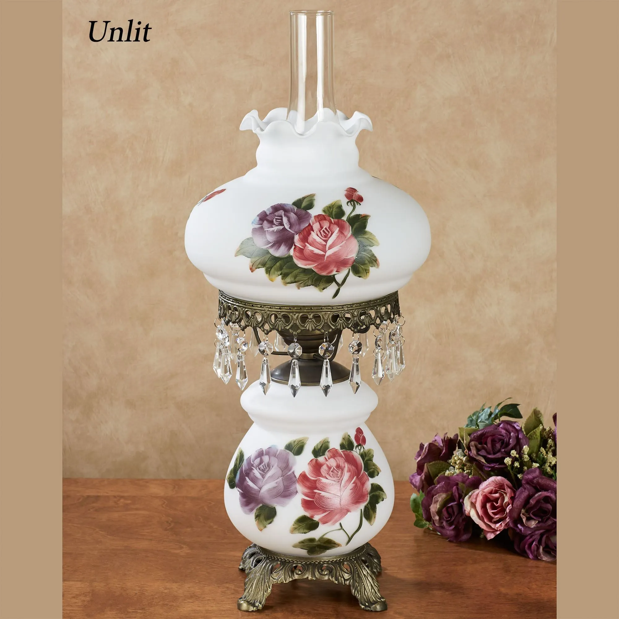 Accented with green leaves, handpainted claret and lavender roses bloom from the handblown white glass of the elegant Olivia Jane Hurricane Table Lamp. The handcrafted, antique brass metal footed base supports the lamp, embellished with trim and dangling faux crystal gems under the top scalloped shade. UL listed. The key switch operates the three-way illumination: a nightlight bulb, your top 60W max. bulb, or both. Measures 10"dia.x24"H.