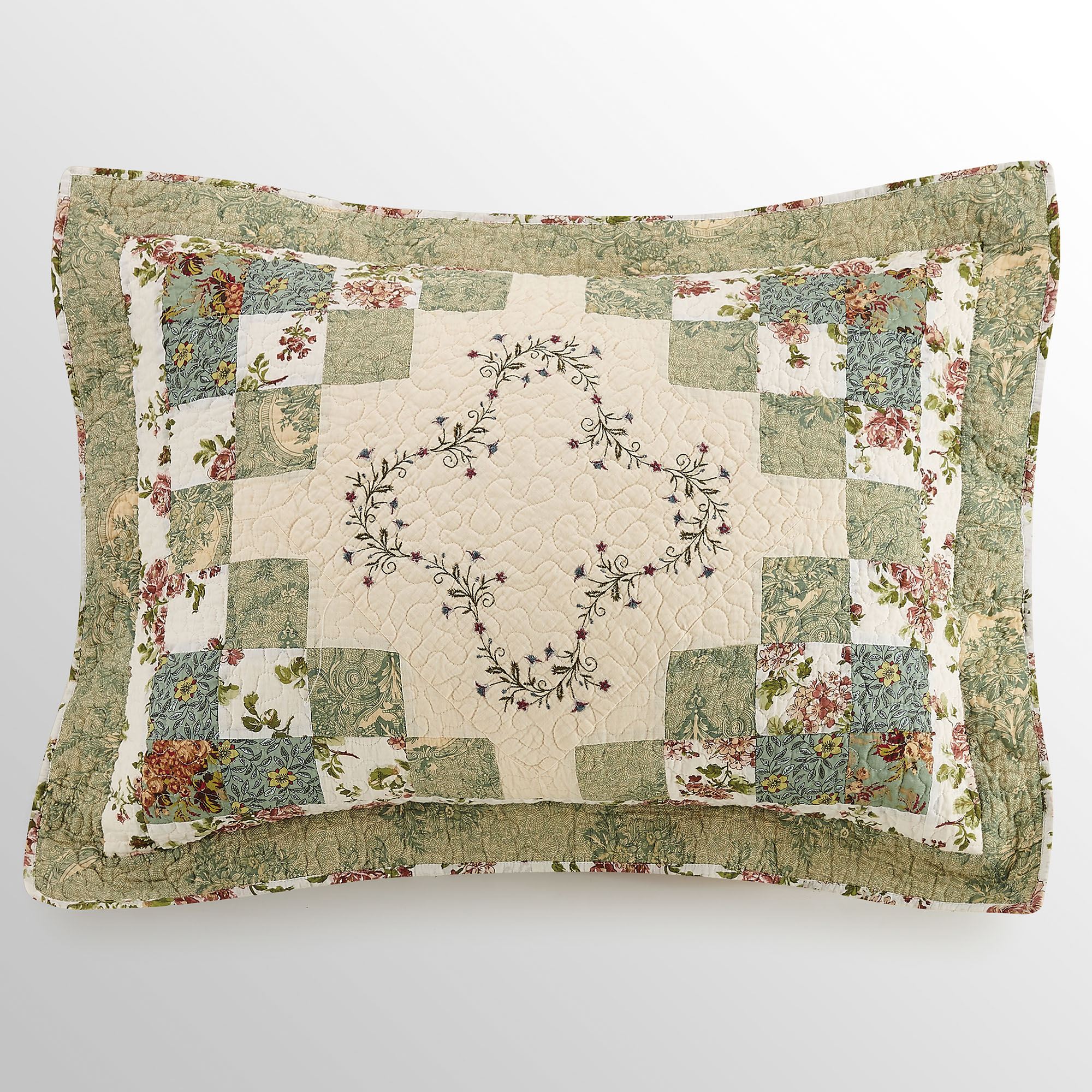 Flanged Sham has a patchwork pattern, floral embroidery, vermicelli quilting, bound ends, and a French back closure. Specify Standard/Queen or King.
