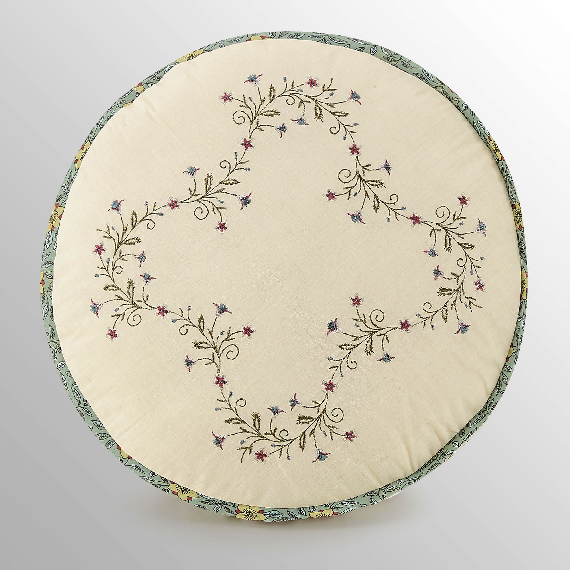 Pillows have polyester fill. Spot clean. Round has embroidery on ecru, bound ends, and a 3" side gusset. Tailored Square has a coordinating patchwork pattern and reverses to a floral toile design.