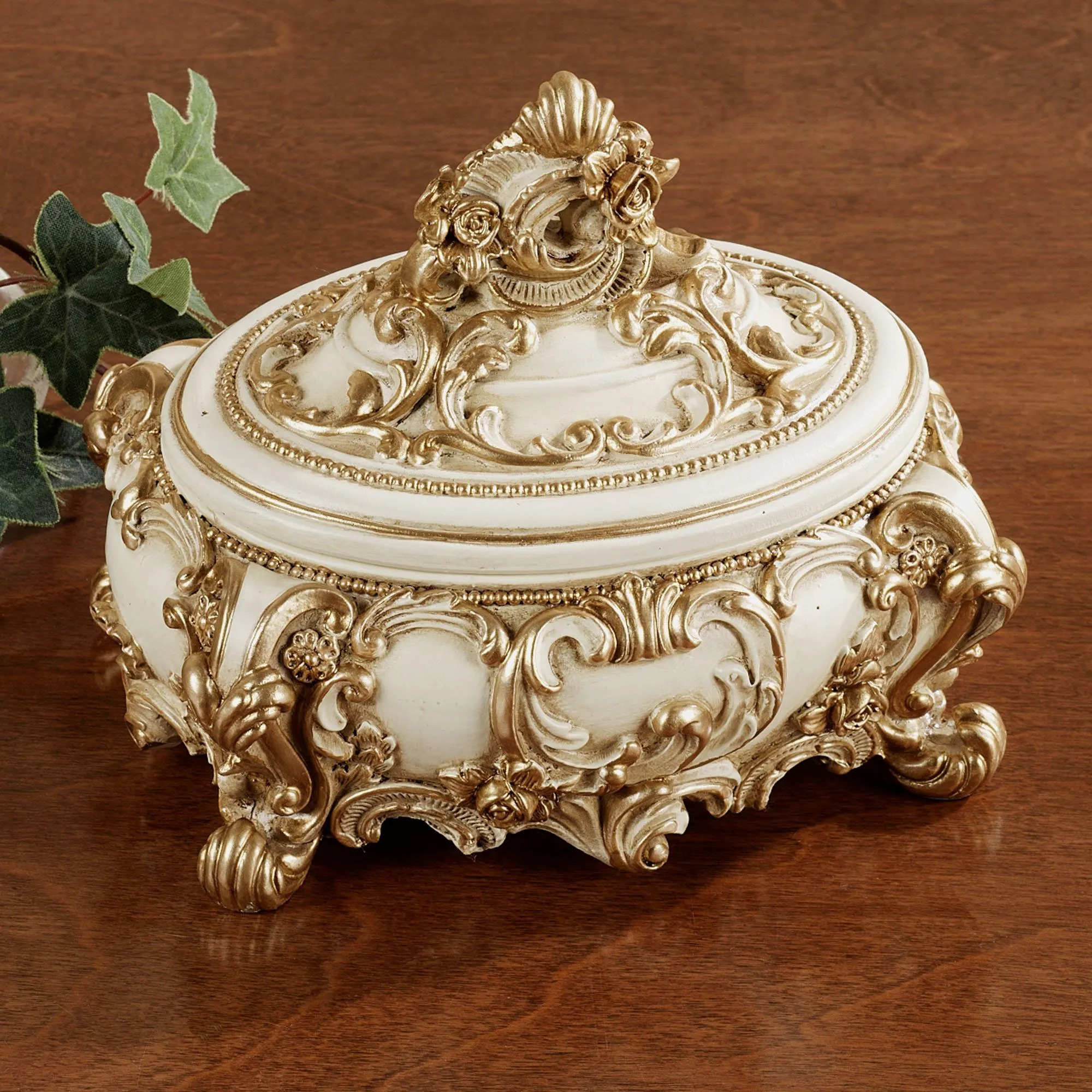 The Oliviana Decorative Covered Box is an elegant resin piece reminiscent of one found in a grand palace. Ivory covered box with gold highlights features beautiful acanthus leaf motifs with roses and intricate beaded details. Covered box will stash your small trinkets. Accent has scroll feet and a 1.5" interior height. Overall, measures 6.5"Wx5"Dx5.5"H.