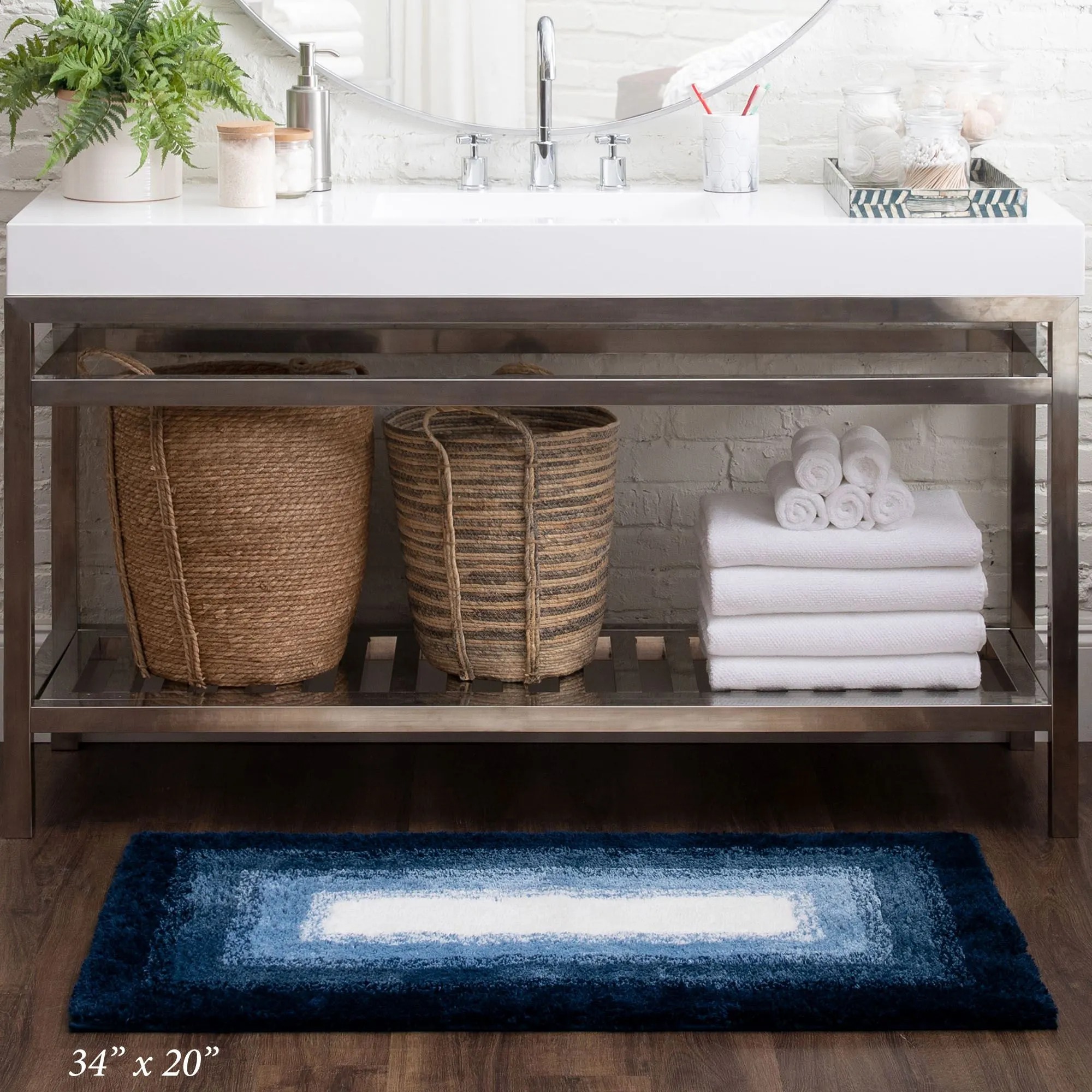 The Midnight Blue Ombre Border Bath Rug invites beautiful color to your space. Handcrafted from plush 1" thick micro denier polyester, the rug features a white center with radiating solid hues. Backing is skid-resistant latex. Rectangle Rug is available. Runner is 24"x60" (2'x5'). One-year limited manufacturer defects warranty. Machine washable. Imported.