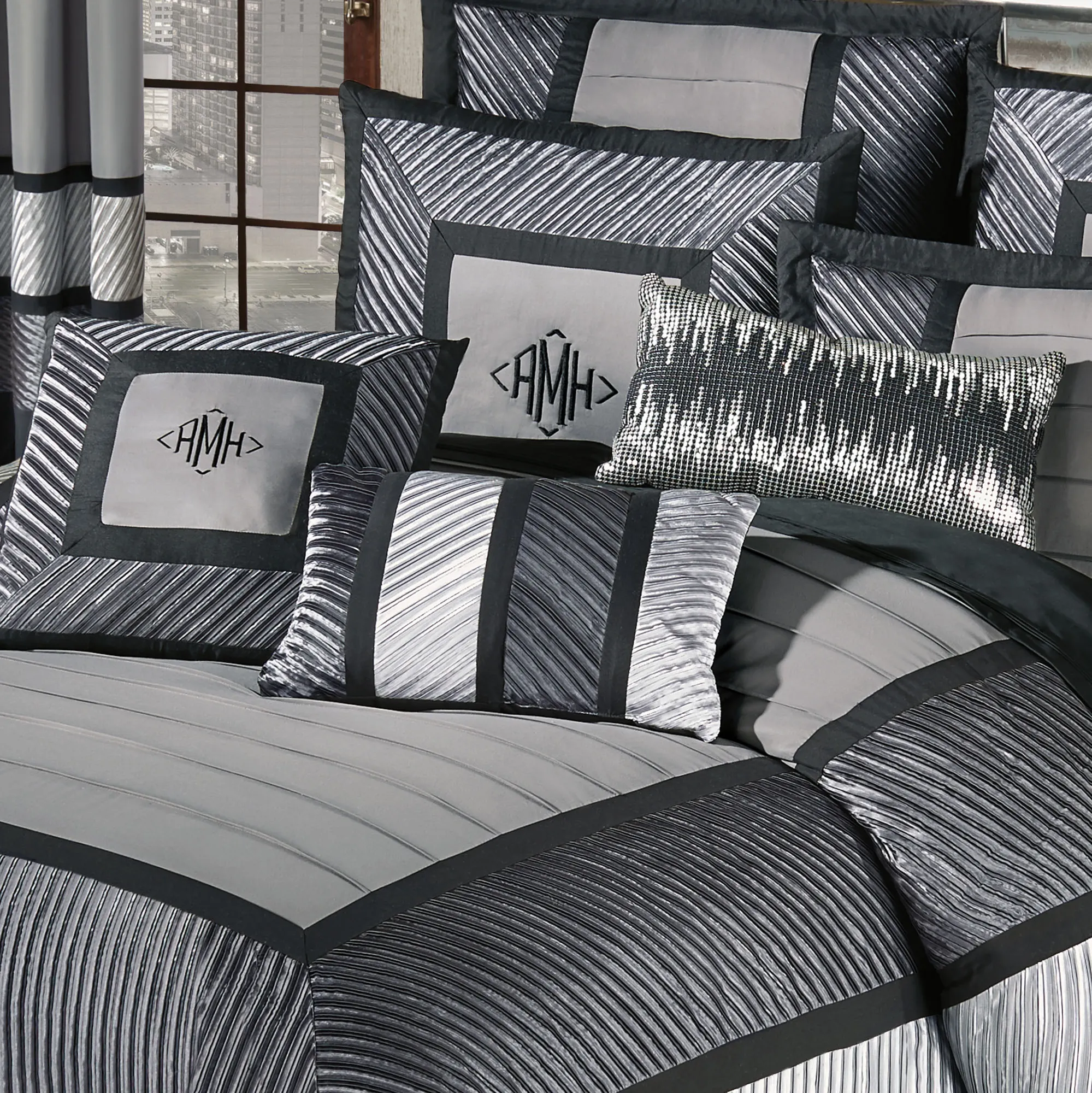 Tailored European Sham contains a smooth dark gray polyester microfiber center bordered by brushed black microfiber and charcoal diagonal poly satin pleats with mitred corners; French back closure. European sham may be monogrammed for an extra charge. Monogramming is shown in the Black thread color.