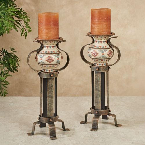 The Onawa Candleholder Pair completes your decor with bold Southwest style. With a mottled brown metal column frame, each candleholder features a resin accent with classic geometric motifs handpainted in ivory, russet, and blue. Each holds your 3" dia. candle. Overall, each candleholder measures 6.5"dia.x14.5"H.