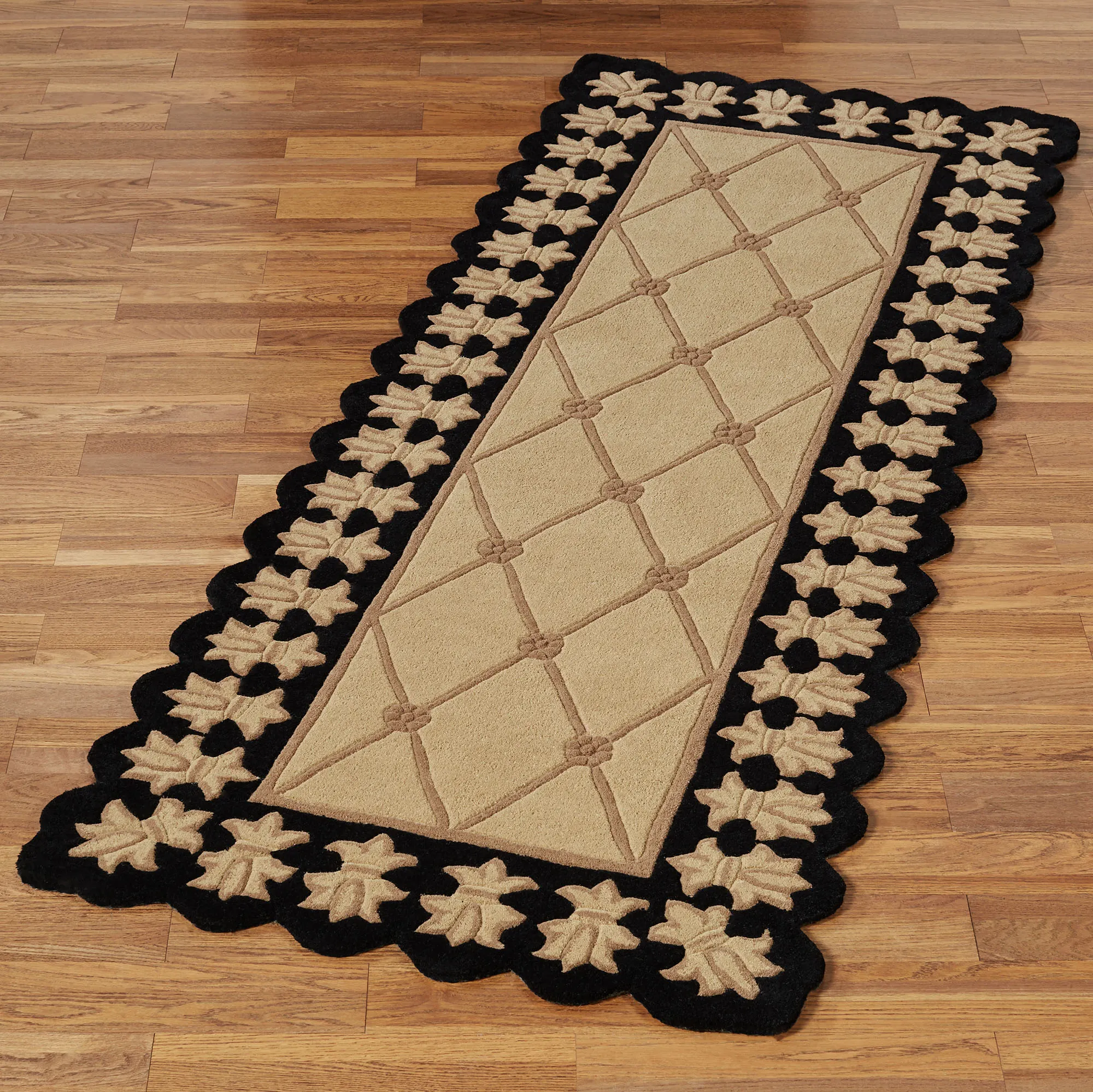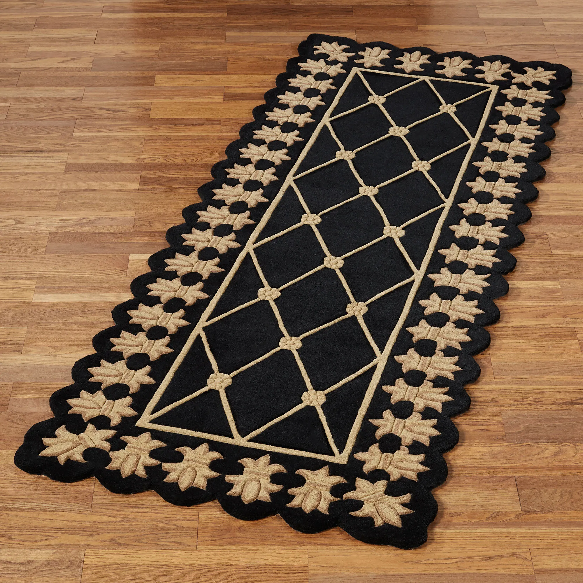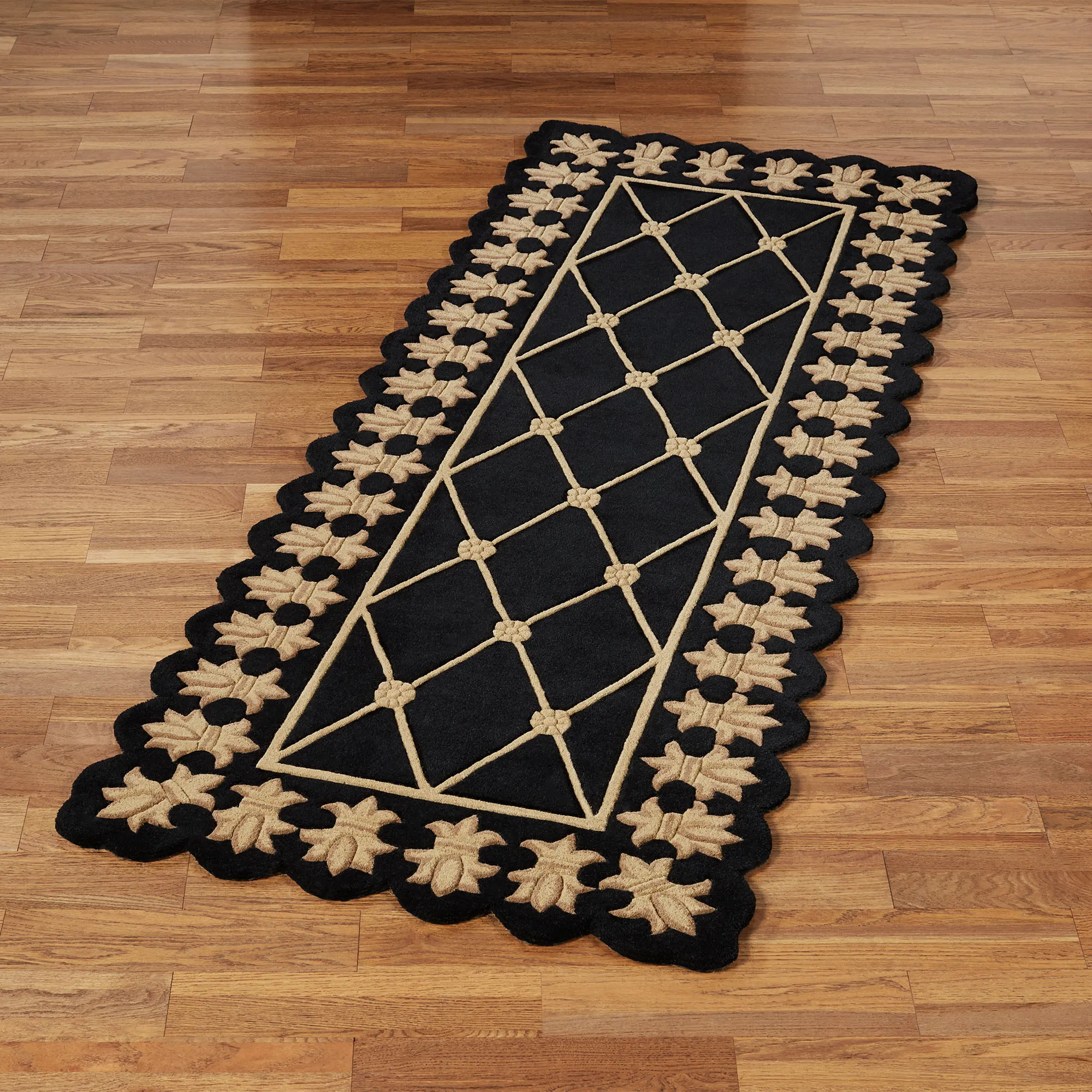 The Onyx Empire II Rug Runner sets the standard for quality rug design. Hand-tufted from pure wool, the .625" thick handcarved rug runner features a central field with diamond latticework and floral rosettes. The inner border has a braided frame, while the contoured edges embellish the fleur-de-lis motifs. Backing is cloth-covered latex. We recommend professional cleaning by a rug cleaner. Imported.